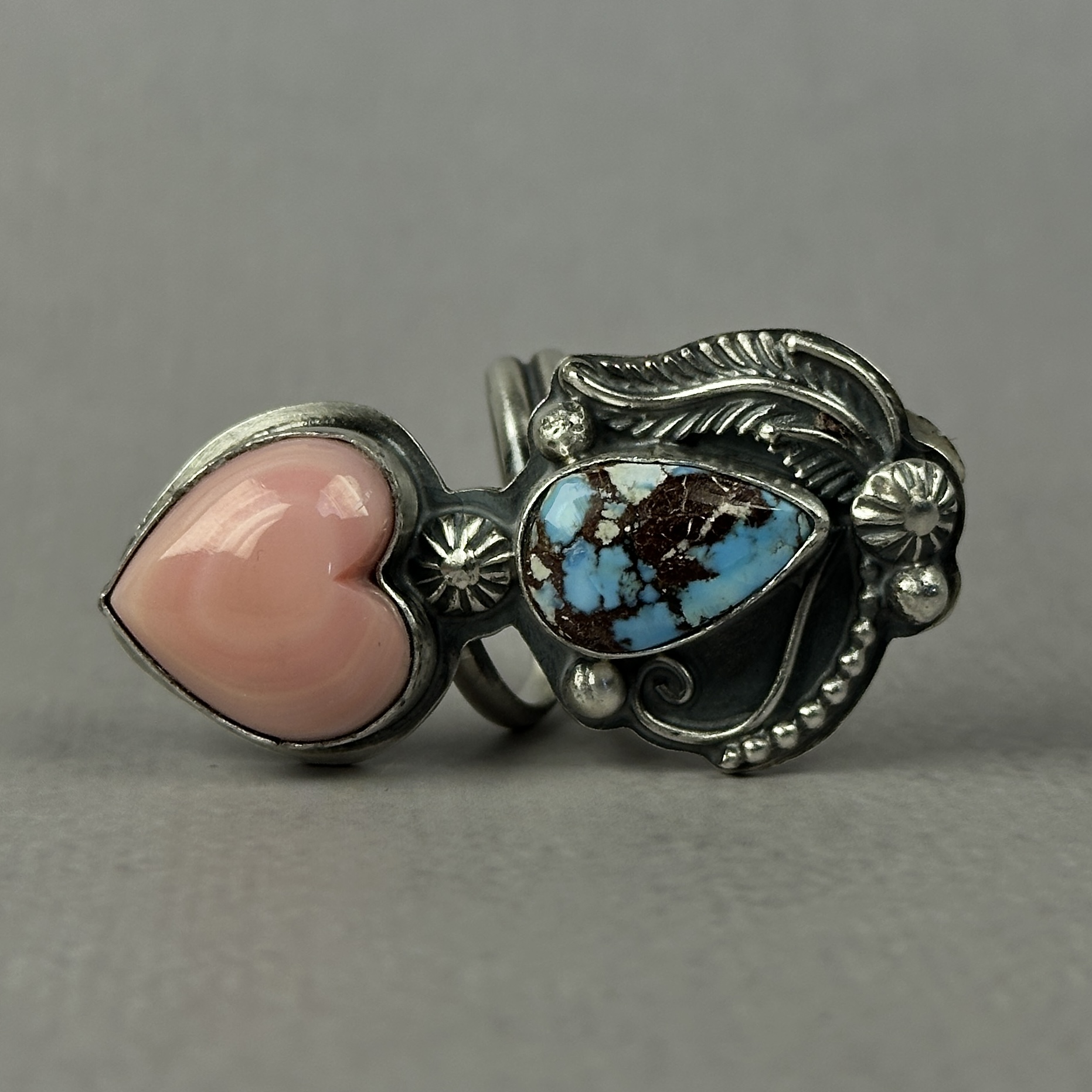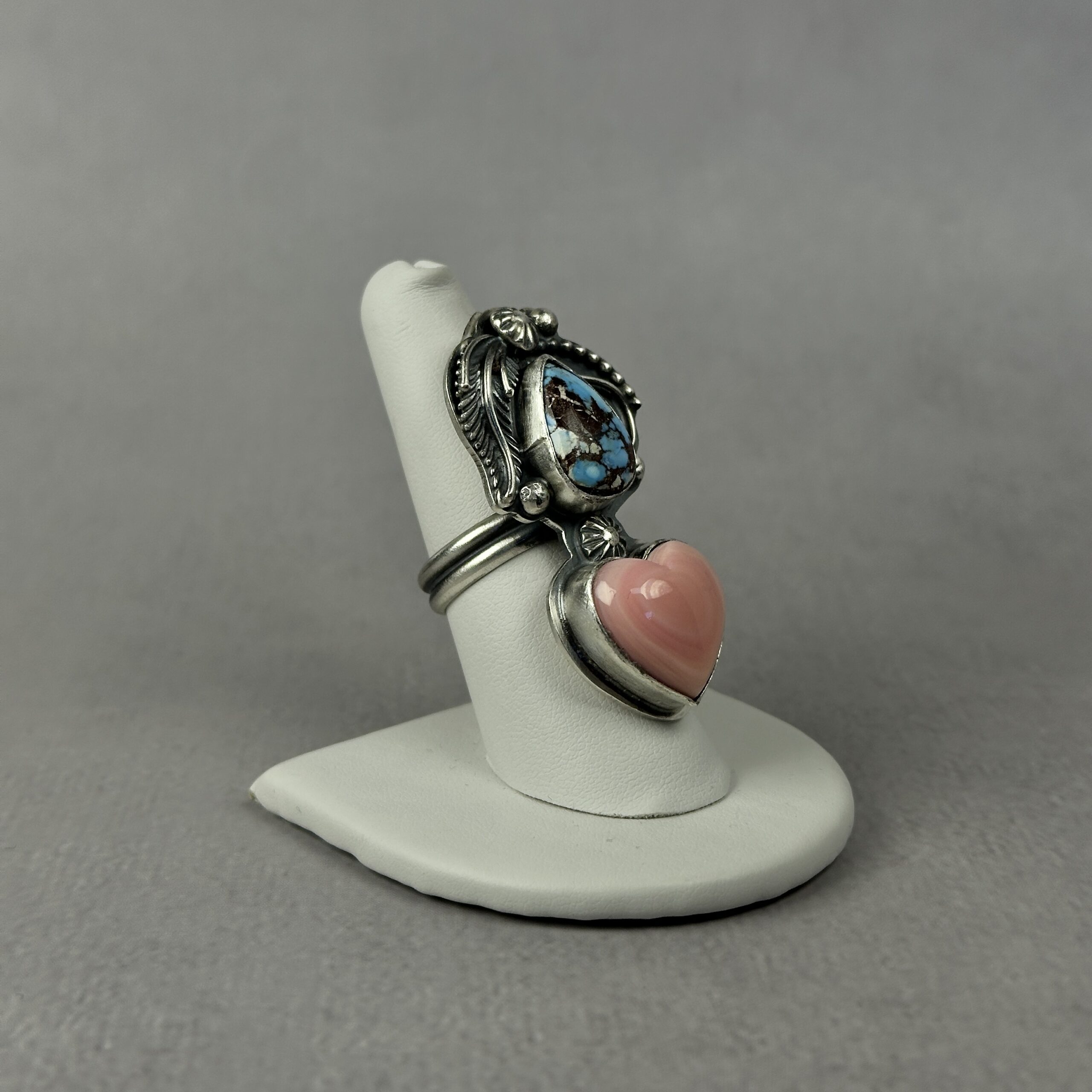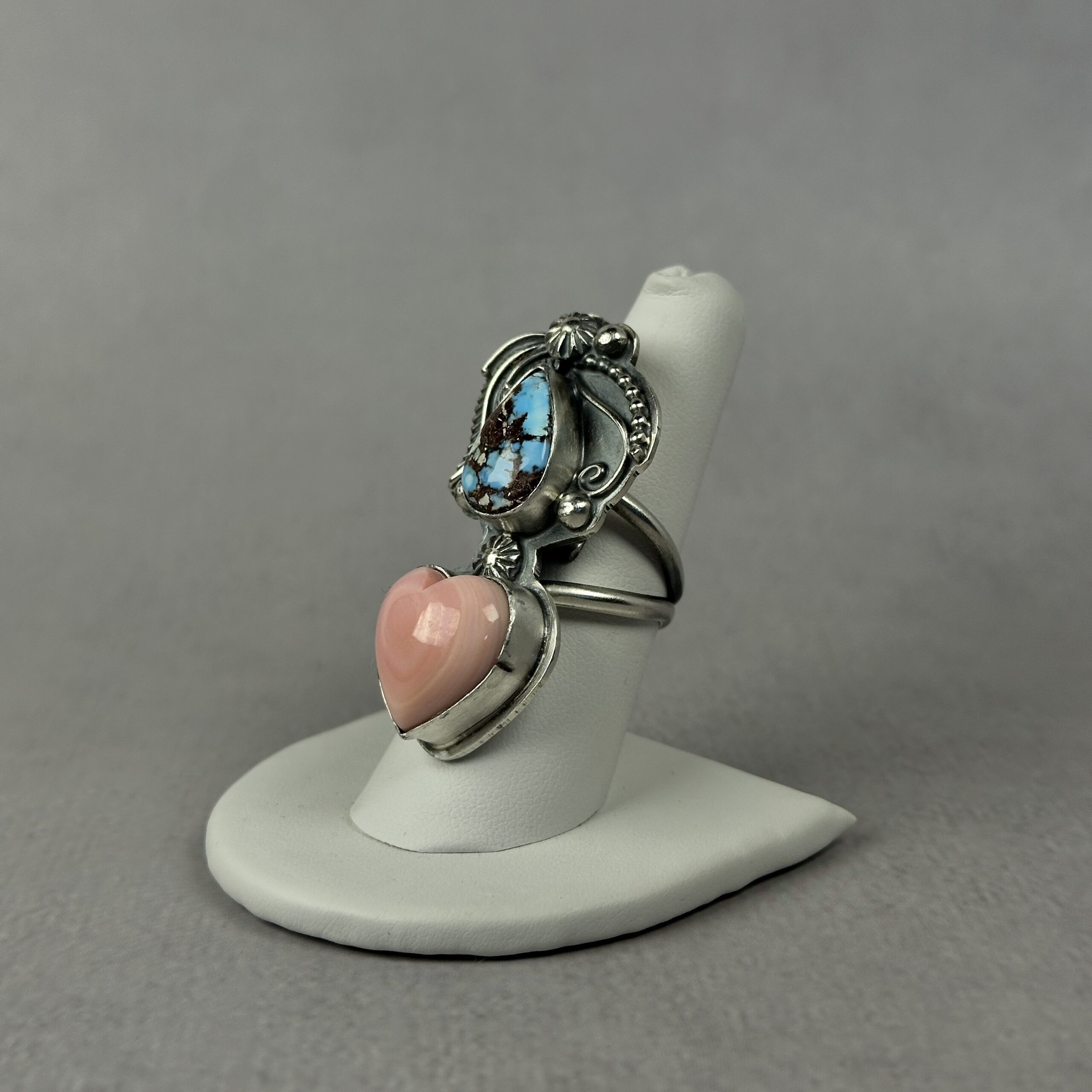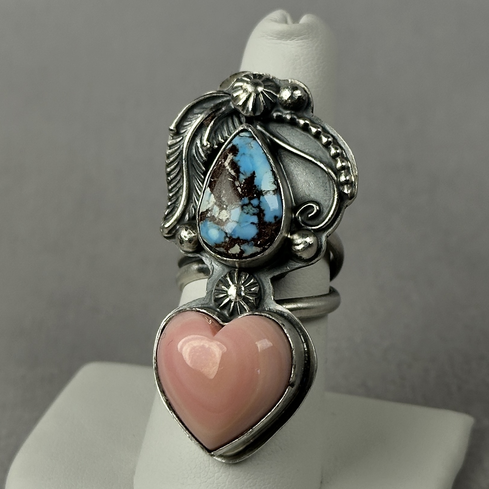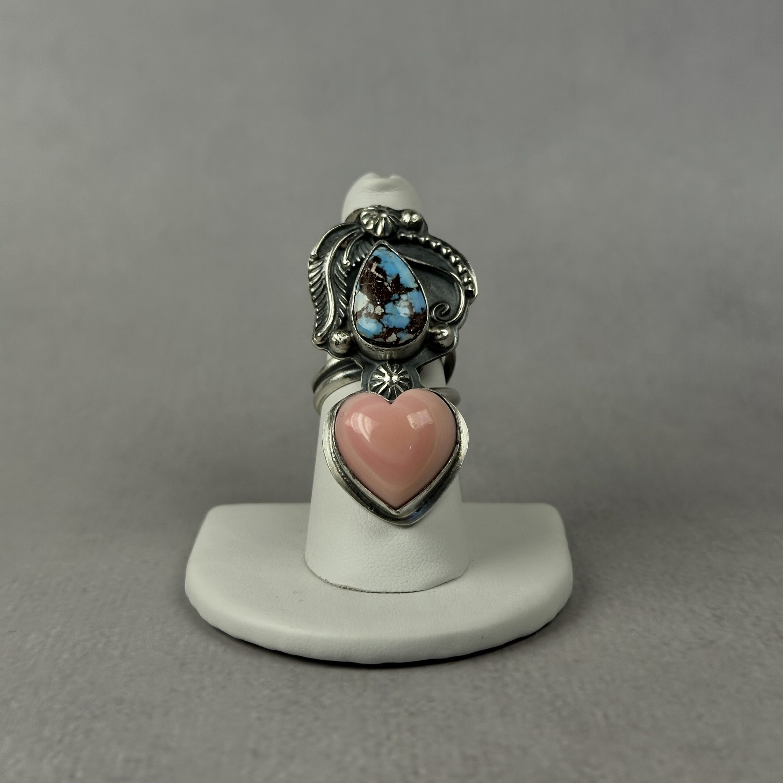 A bold sterling silver statement ring featuring natural golden hills turquoise paired with a soft pink conch heart. Handcrafted with intricate silver detailing for a truly one-of-a-kind look.
