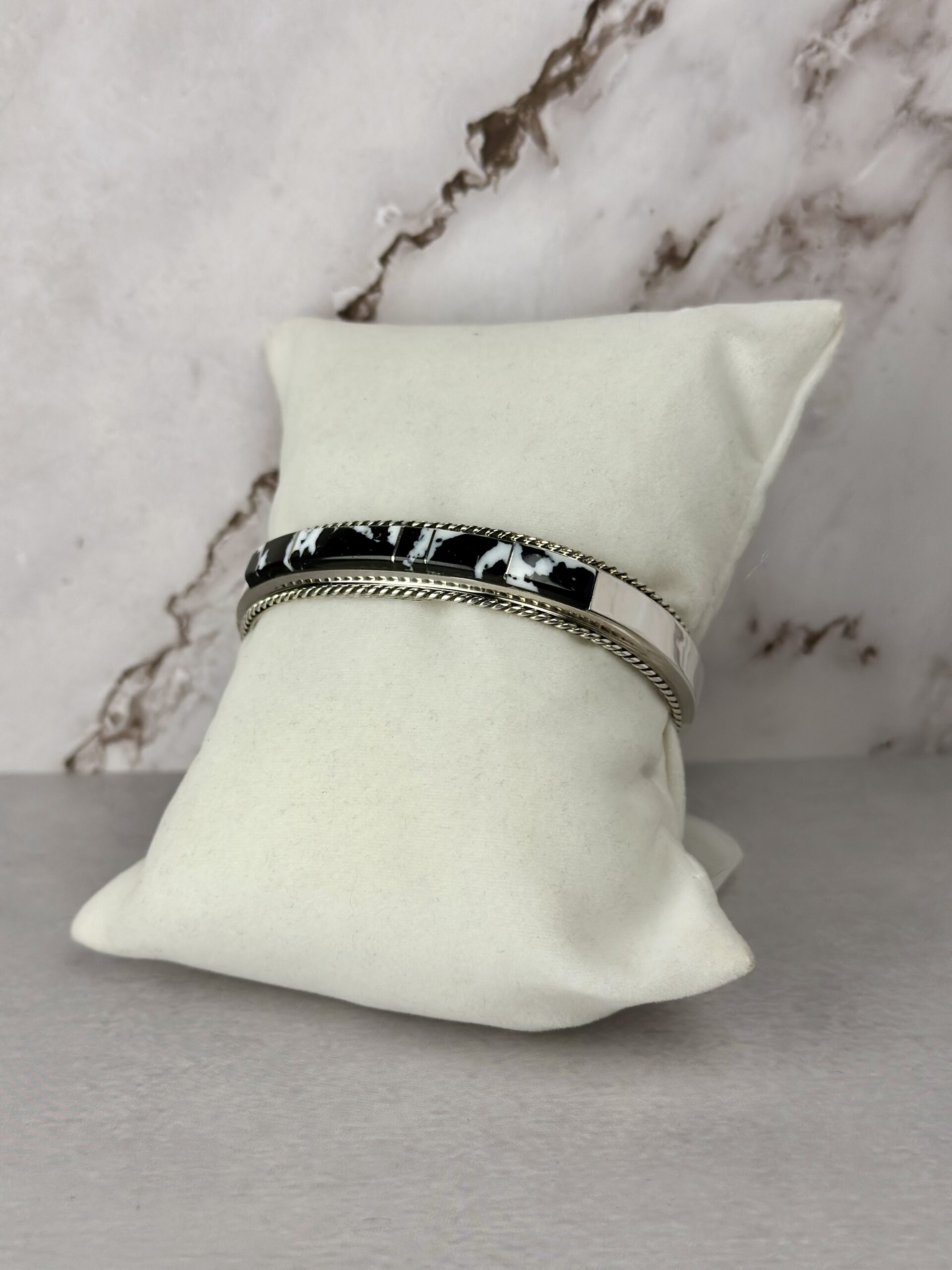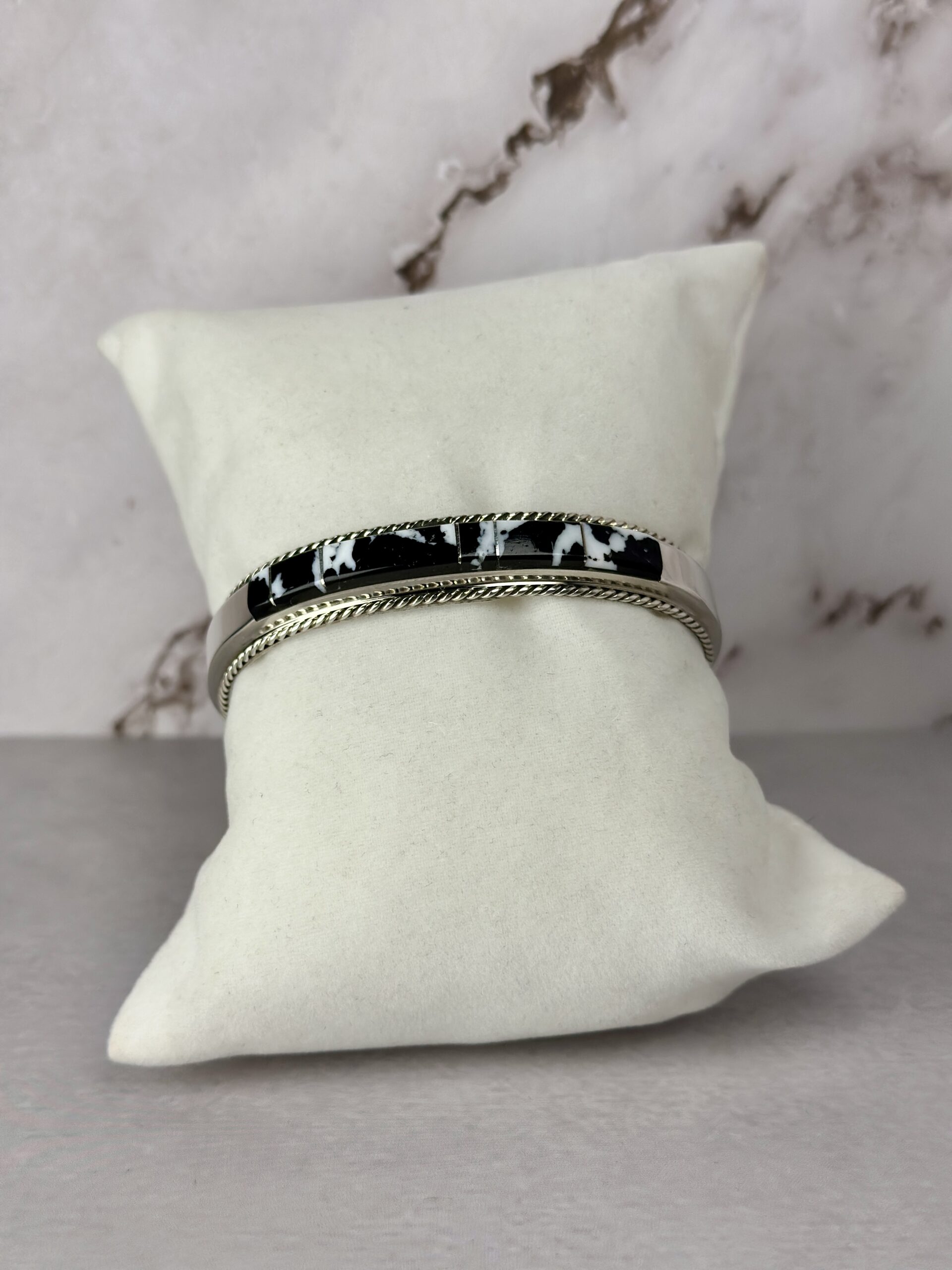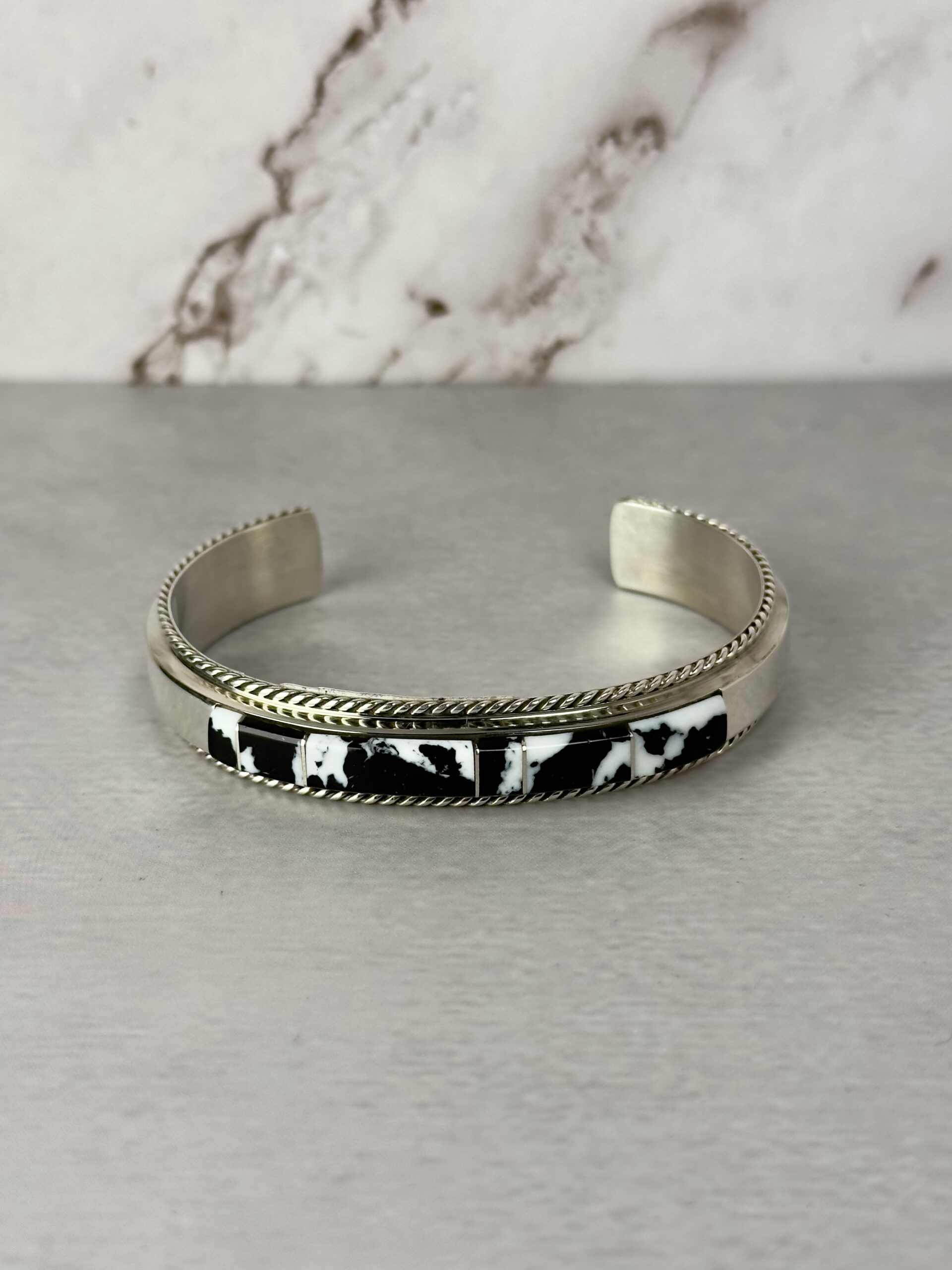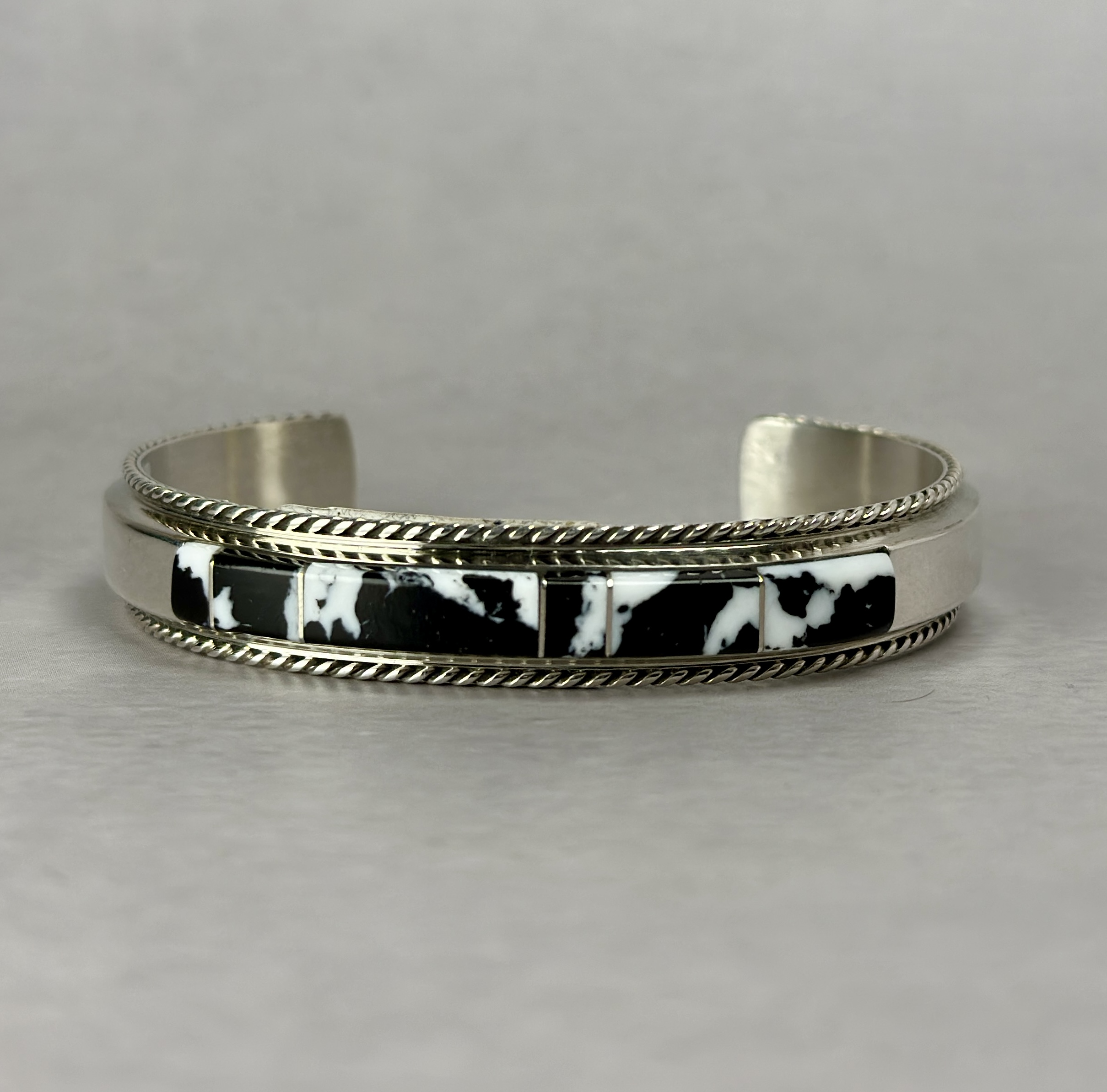 A stunning Navajo inlay cuff showcasing White Buffalo stone, beautifully set in sterling silver. 7.5-inch wrist size.