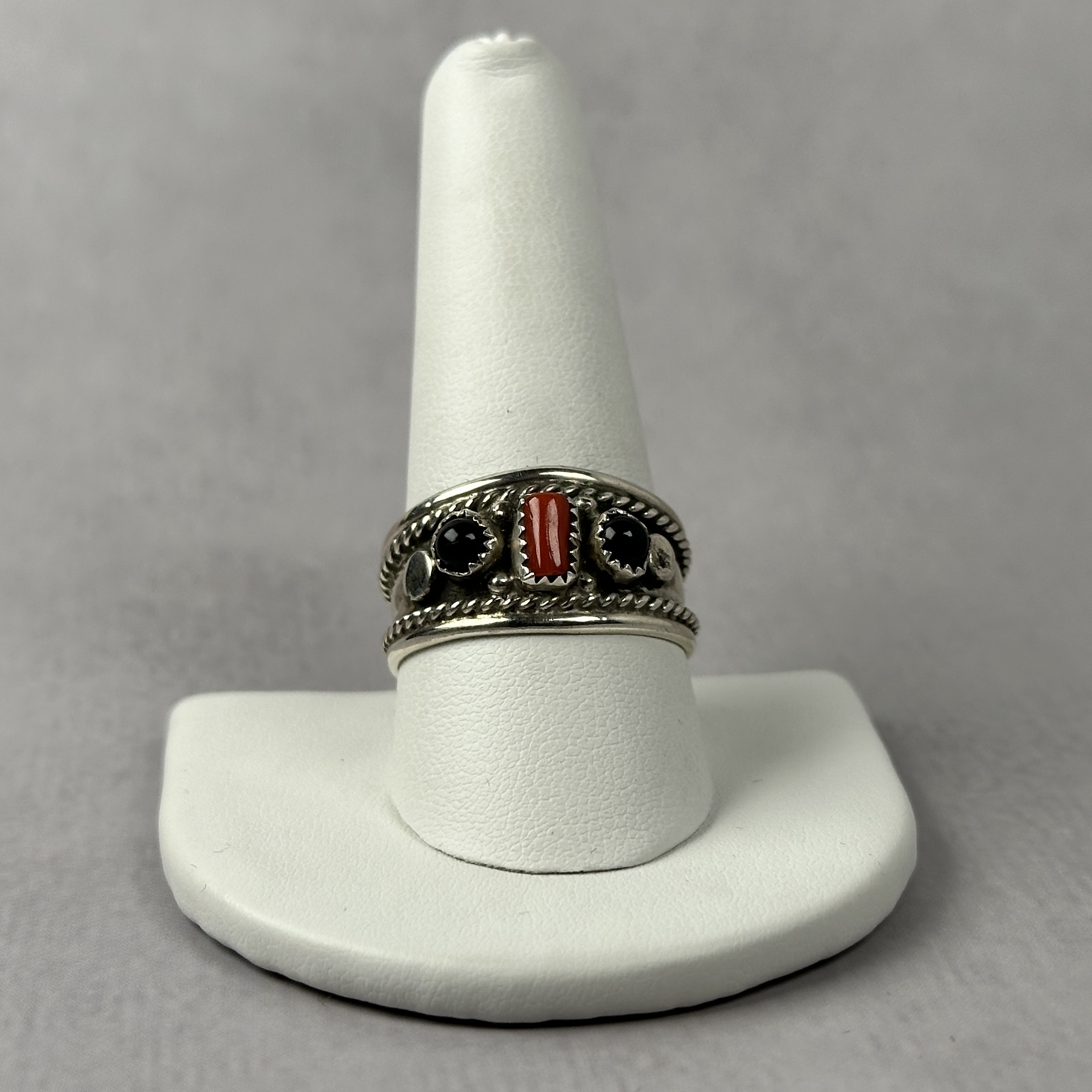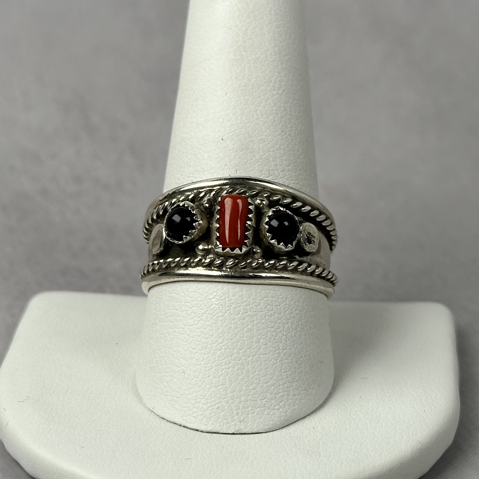 Black Onyx & Red Coral Ring – Navajo Made – Sz 11
