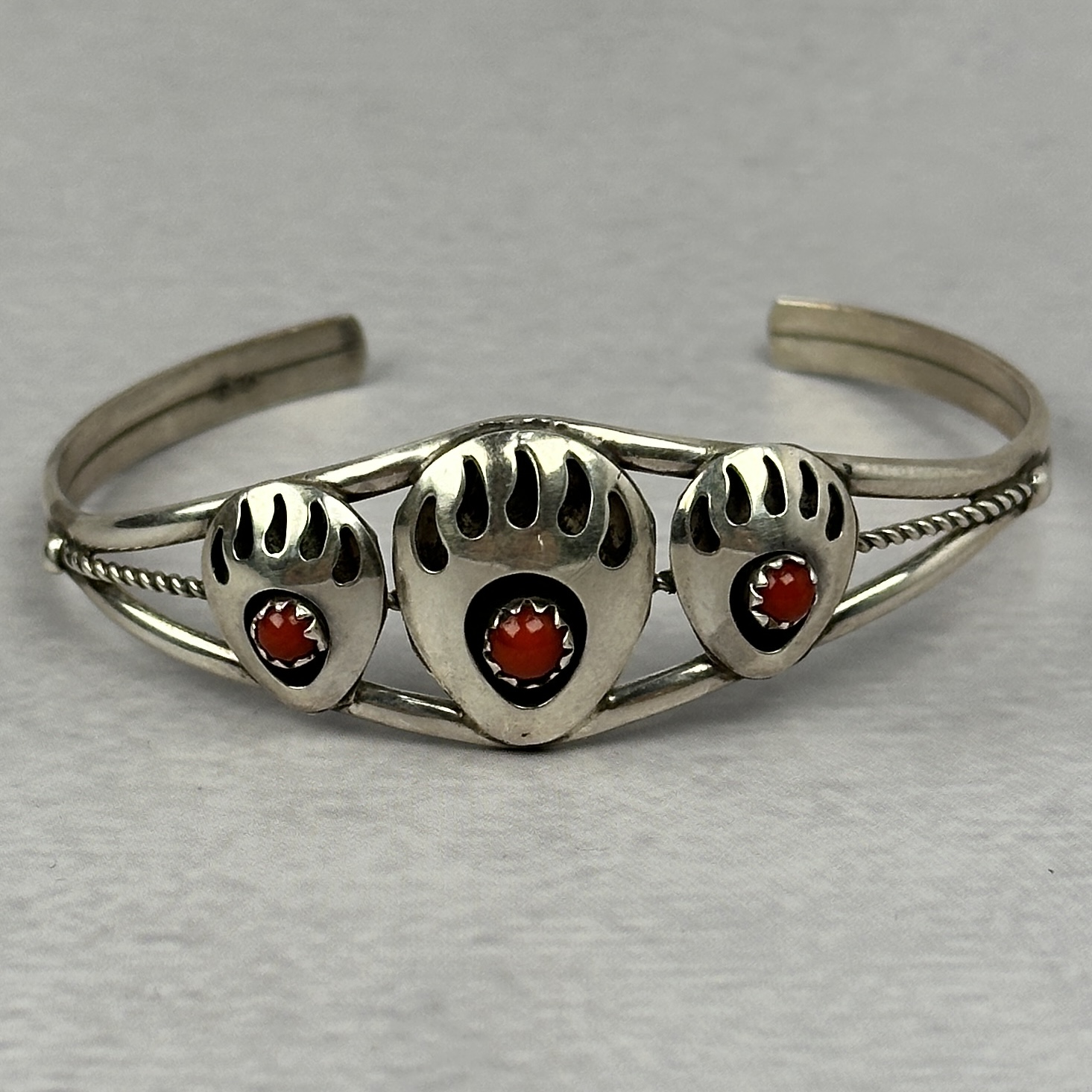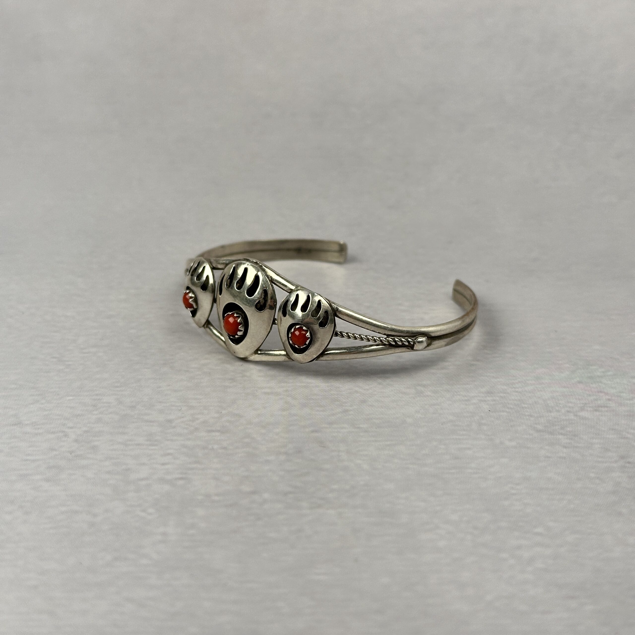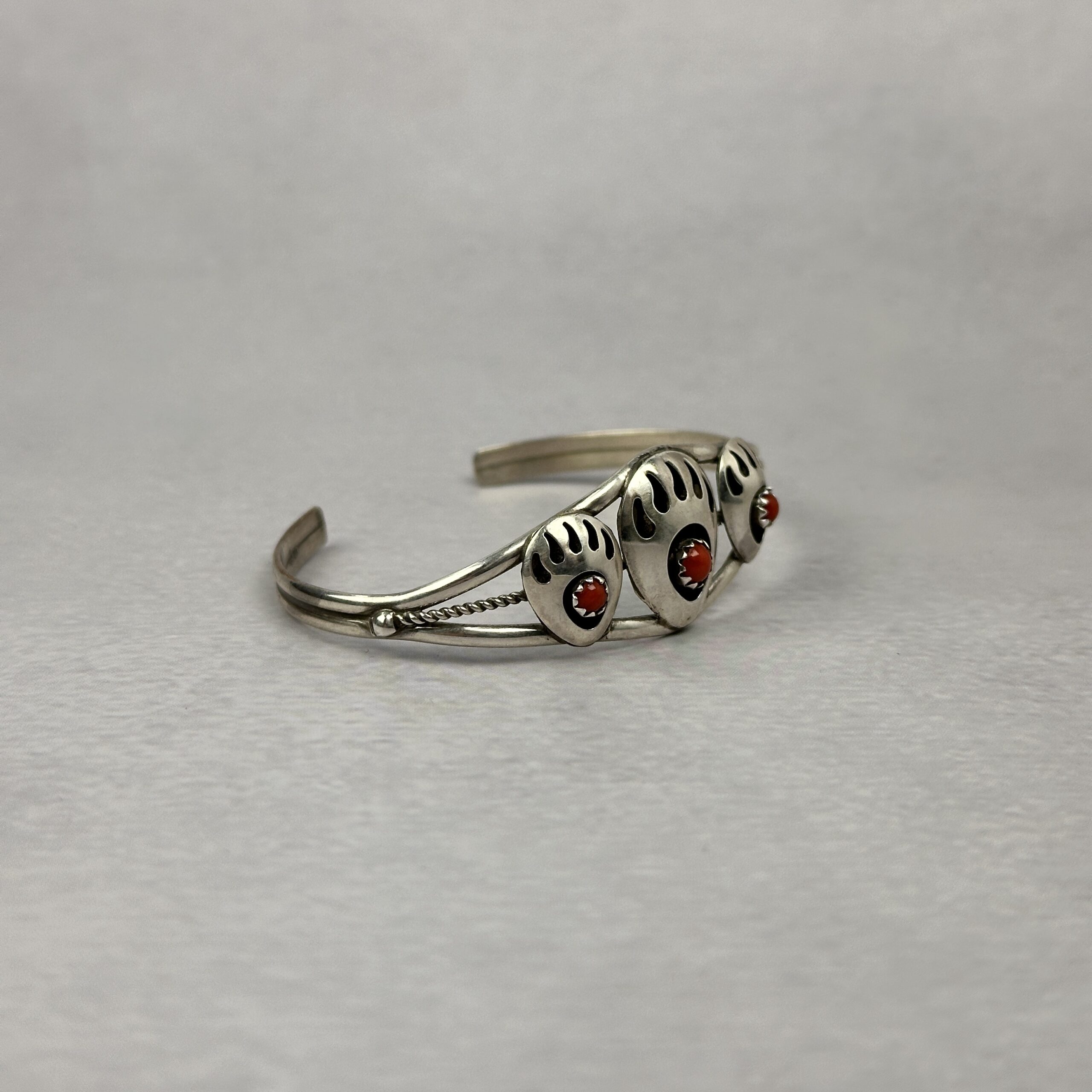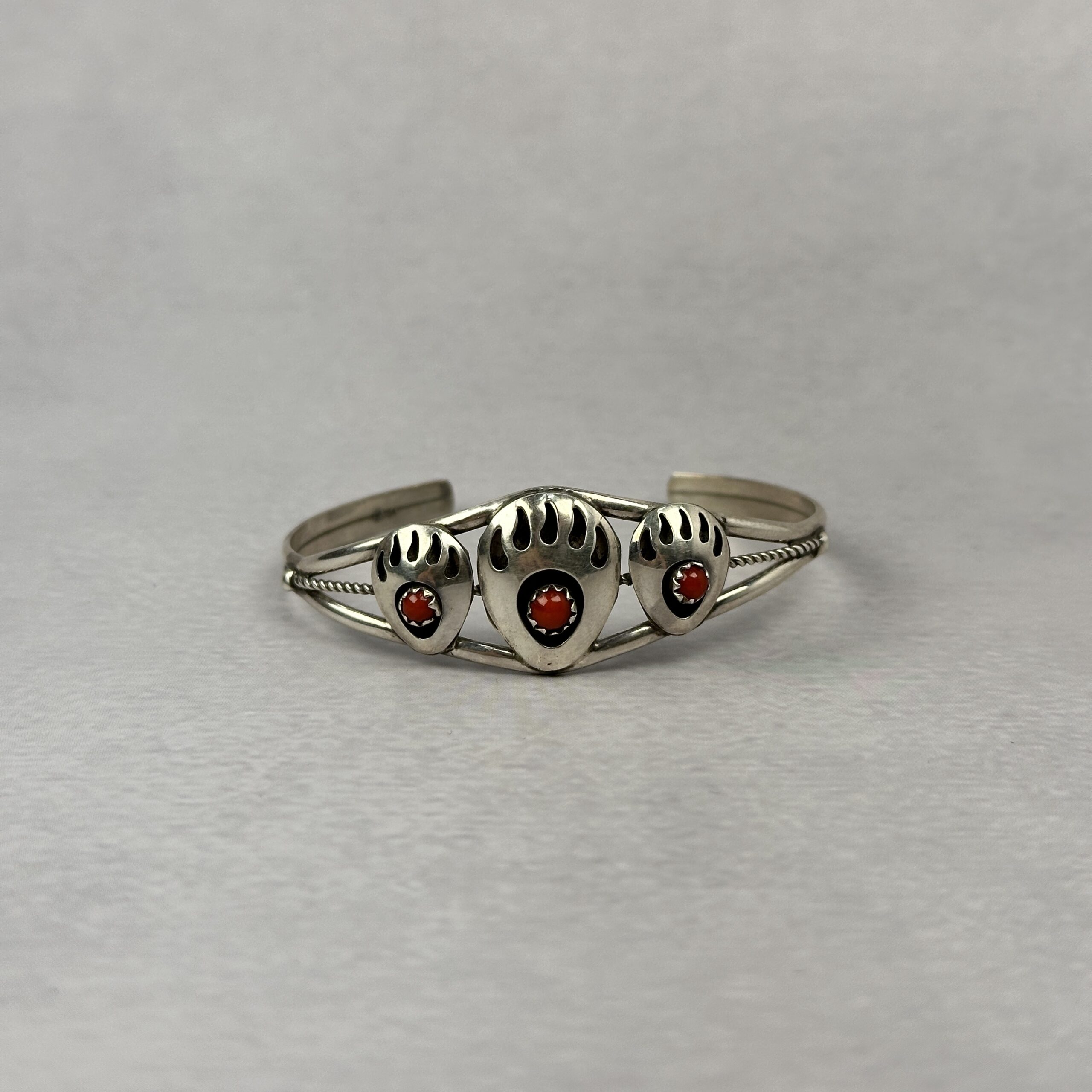 This Navajo-made cuff features three traditional bear paw motifs, each set with natural red coral cabochons. The bear paw is a powerful symbol in Navajo jewelry, representing strength, protection, and guidance. Crafted in solid .925 sterling silver, the cuff has a clean, balanced profile with classic wire detailing along the band.