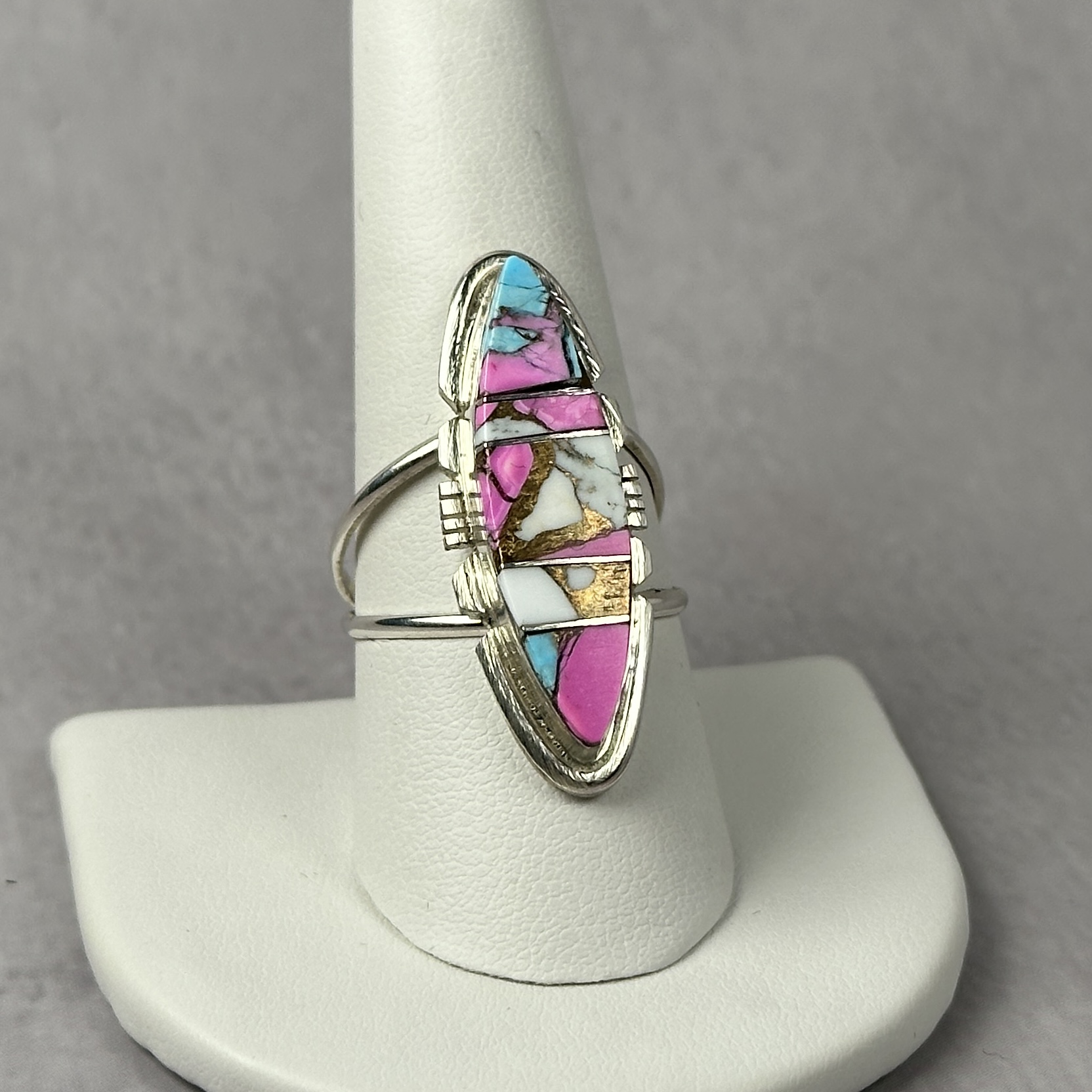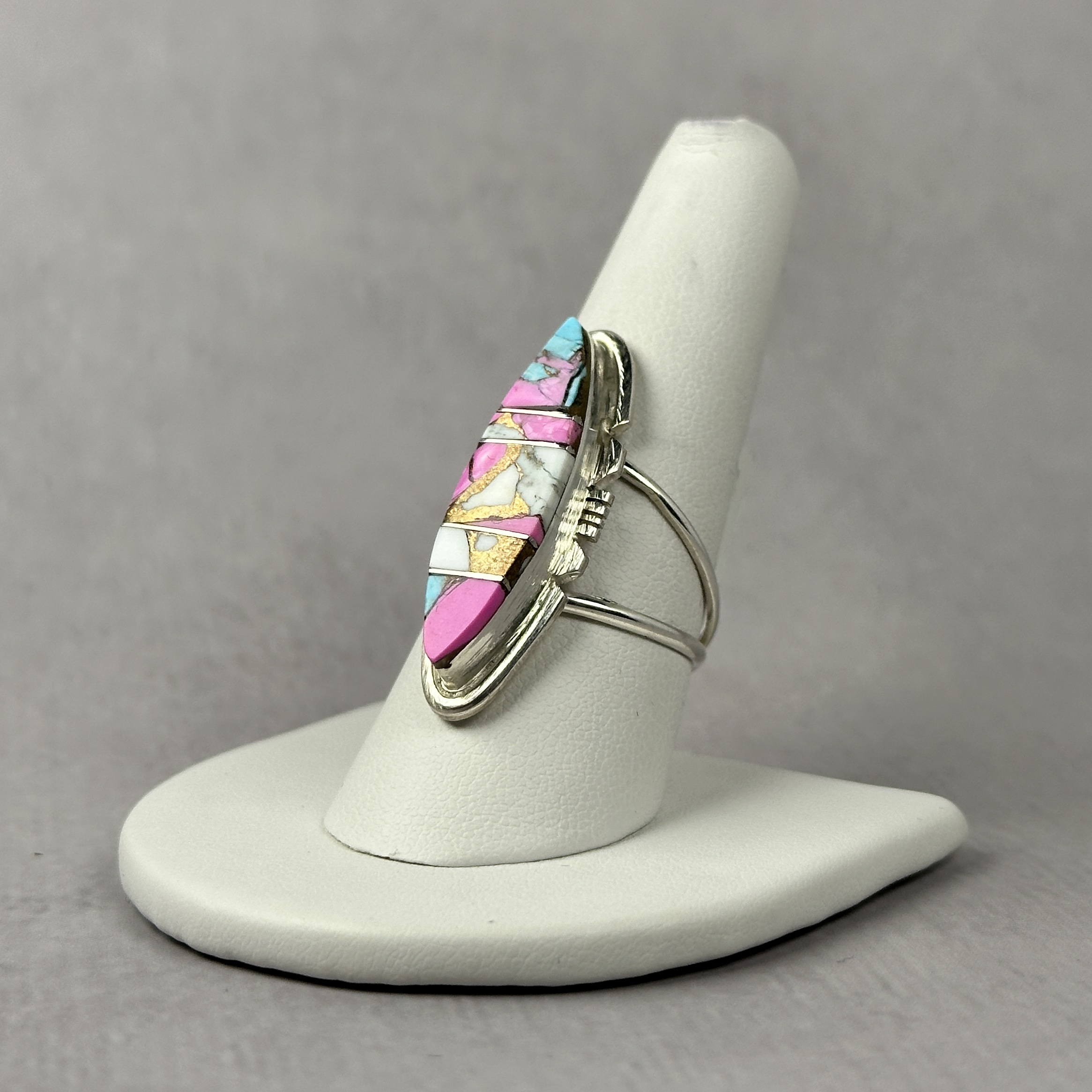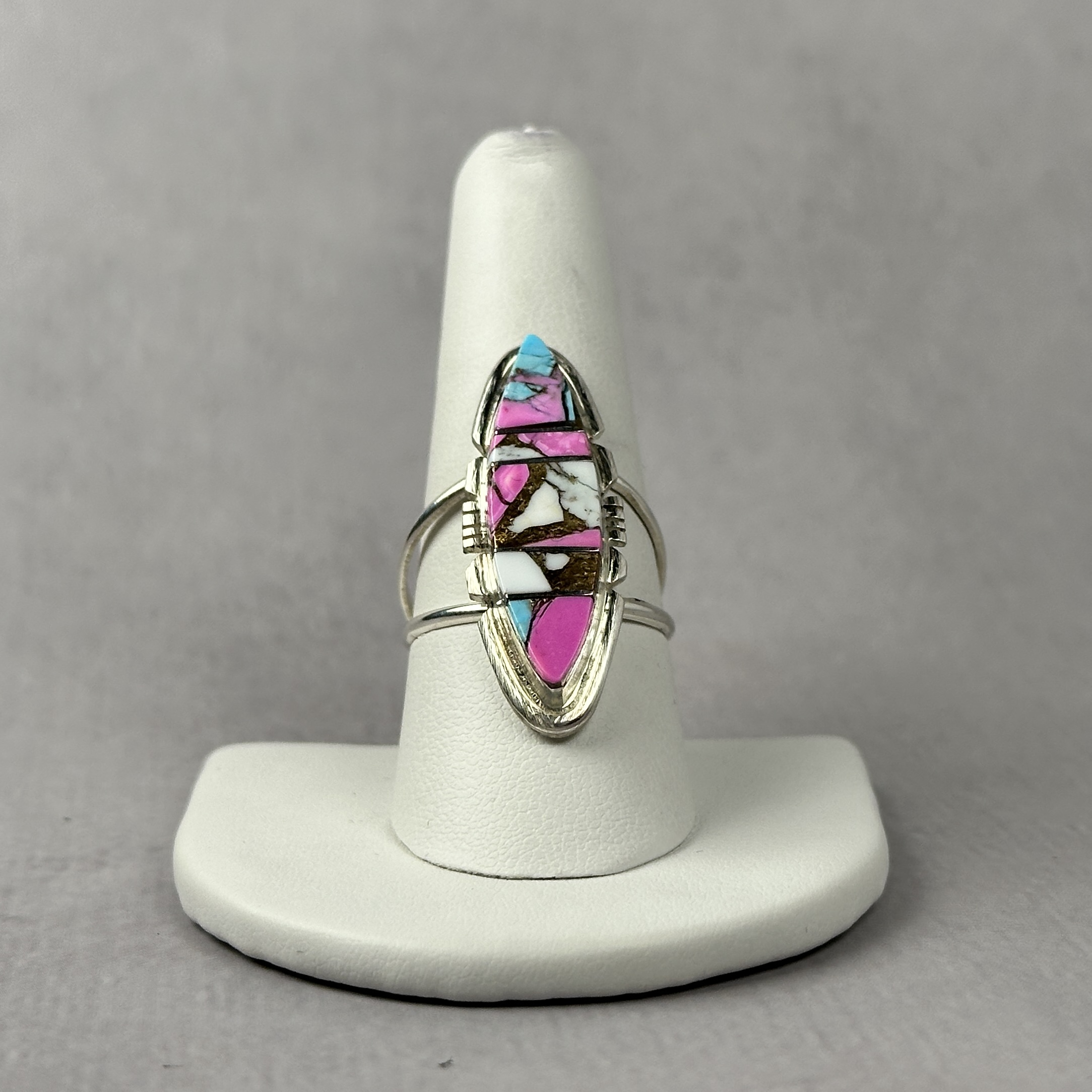 Handcrafted by Navajo artist Brandon Etcity, this ring features vibrant cotton candy inlay composed of spiny oyster, turquoise, and copper. Set in solid .925 sterling silver, the elongated design highlights the precision and artistry of the inlay work. A bold, expressive piece that blends tradition with modern color and form.