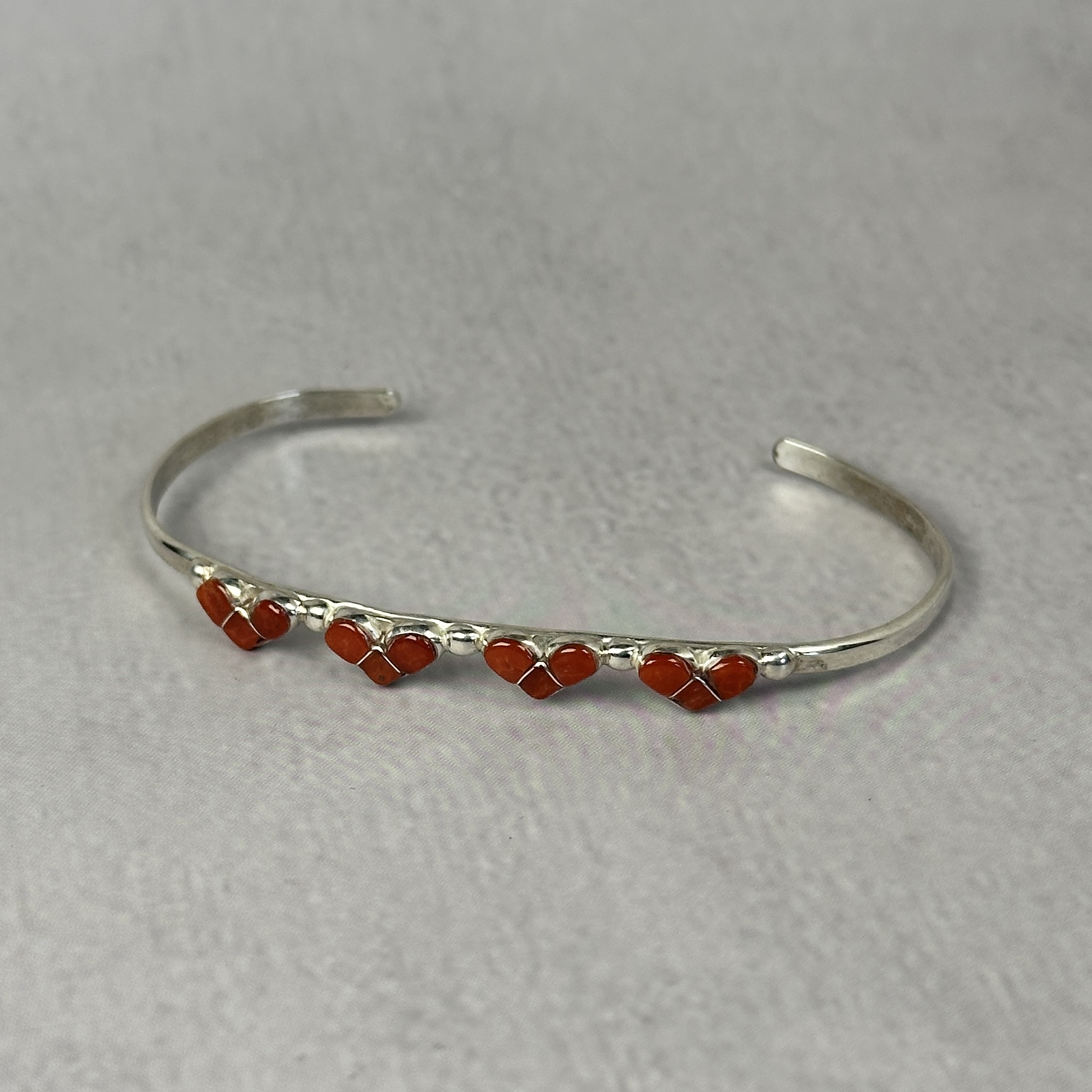 A dainty sterling silver cuff featuring hand-set red coral heart stones, Navajo made and timeless in design.