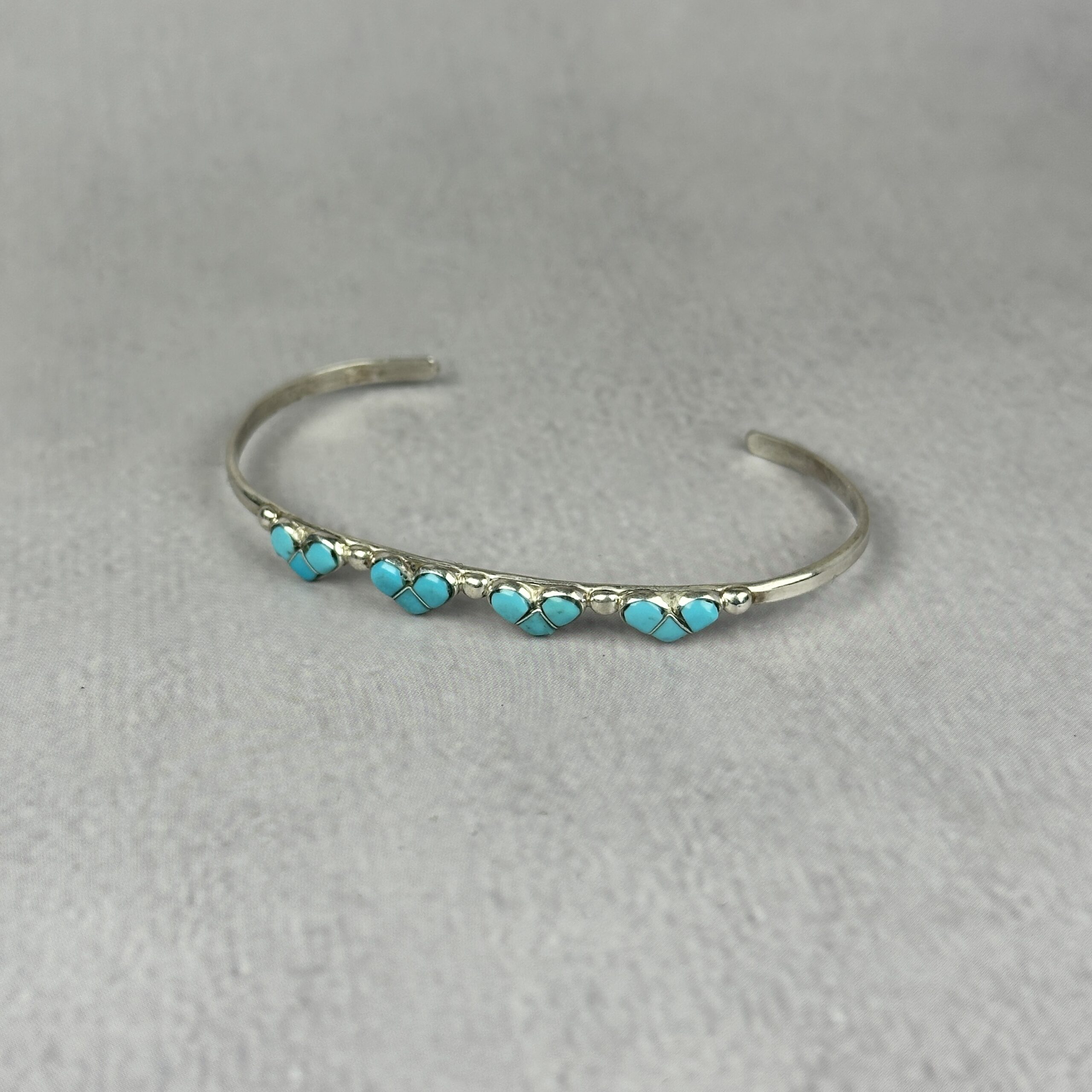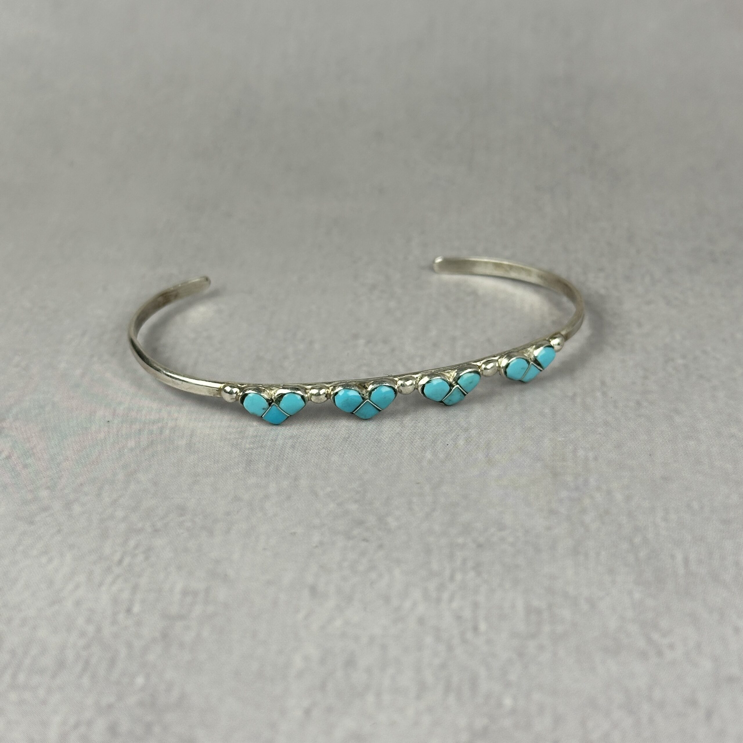 A delicate Navajo made cuff showcasing vibrant turquoise heart stones set in sterling silver.