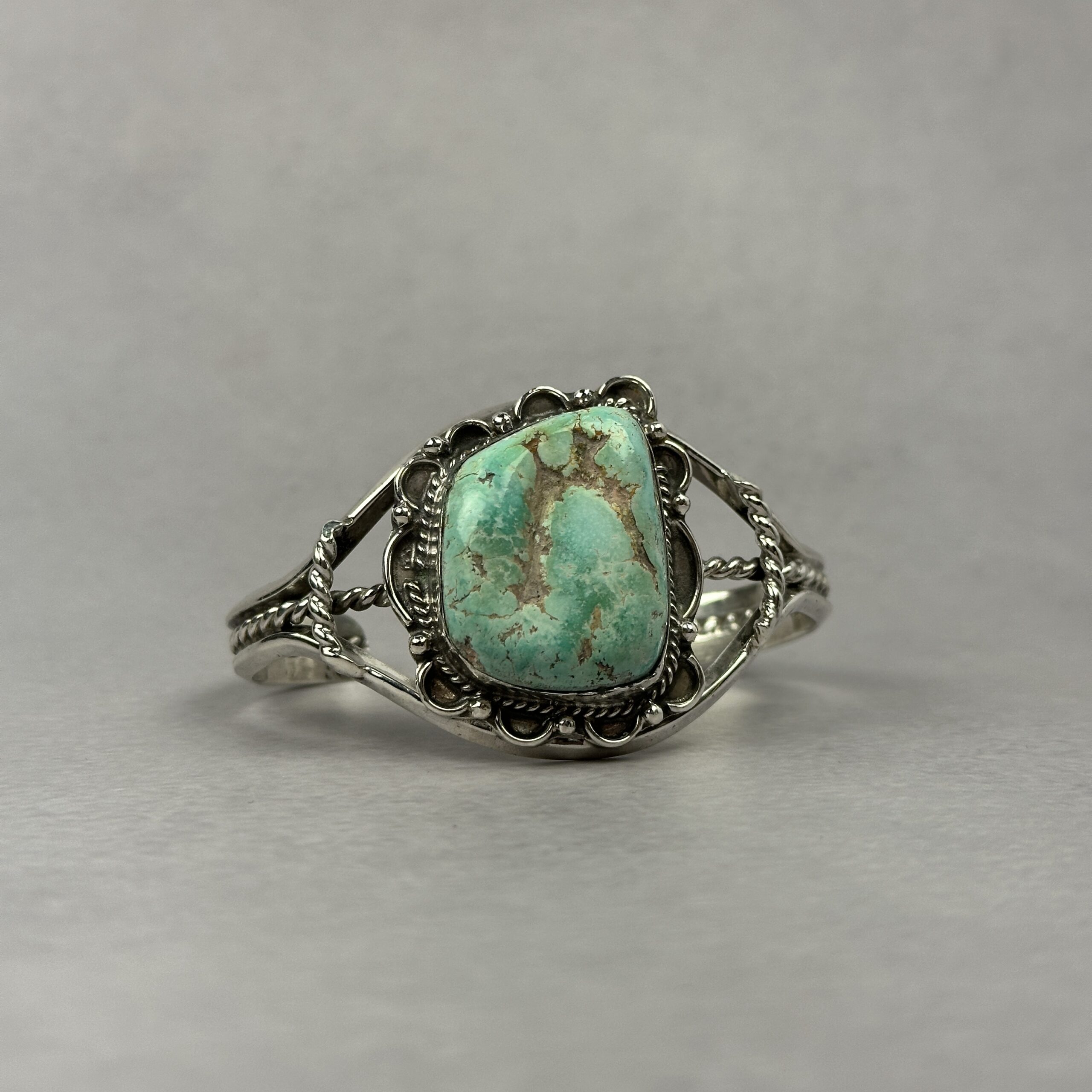 This bold Navajo-made, artist unknown statement cuff features a large, natural/rough Dry Creek turquoise stone with striking mint-green tones and distinctive brown matrix running through the center. The stone is substantial and visually commanding, cut into a softly squared freeform cabochon that highlights the natural character of the turquoise.