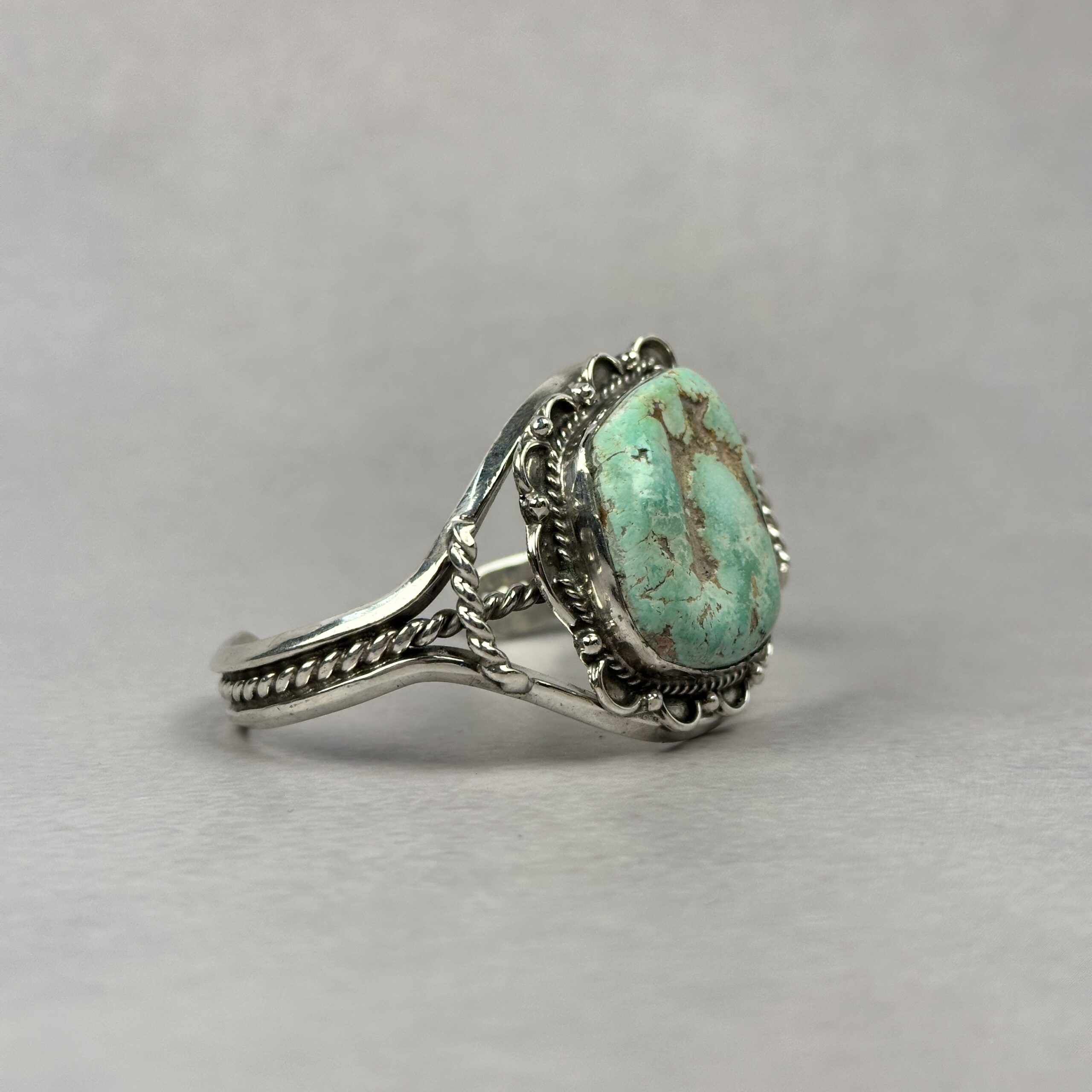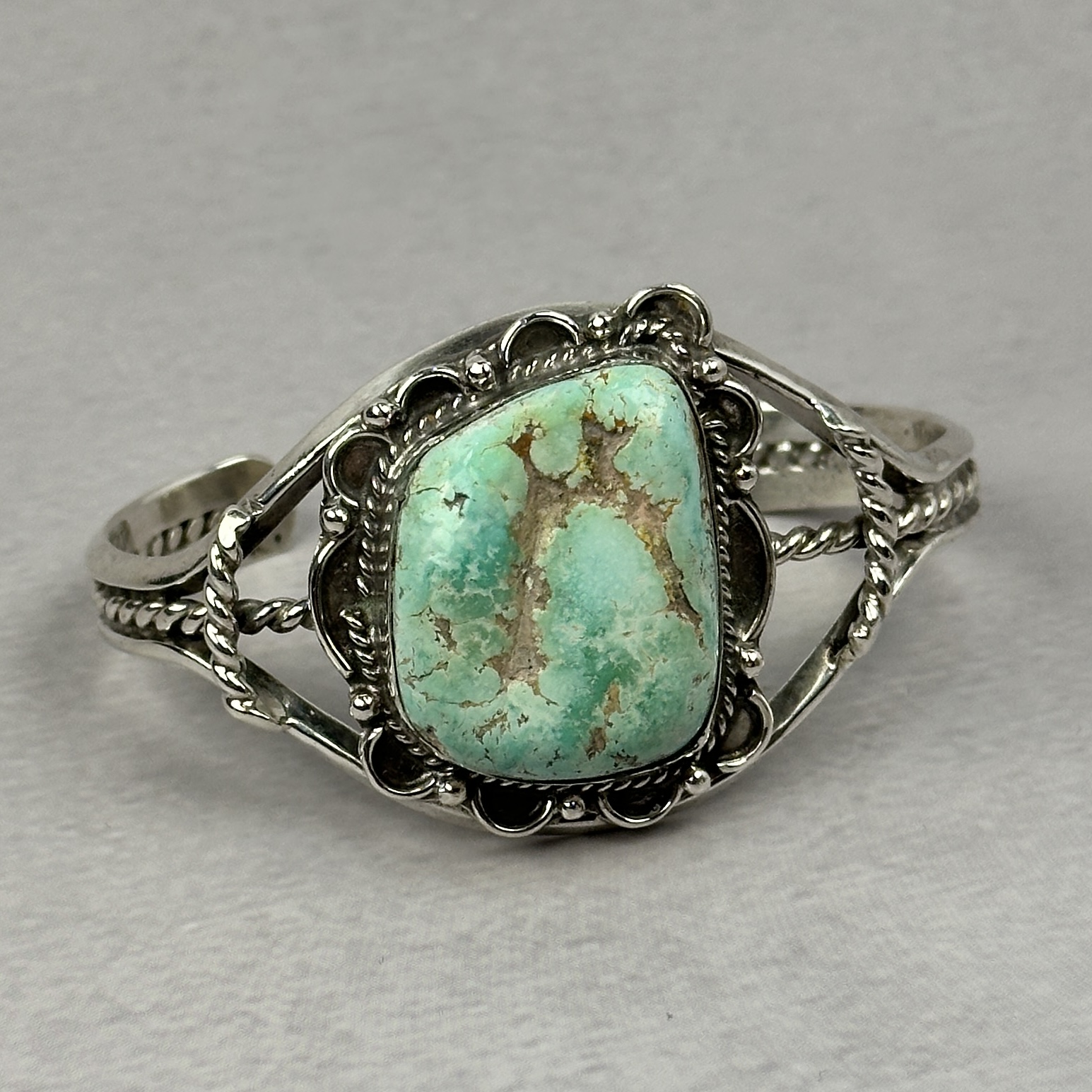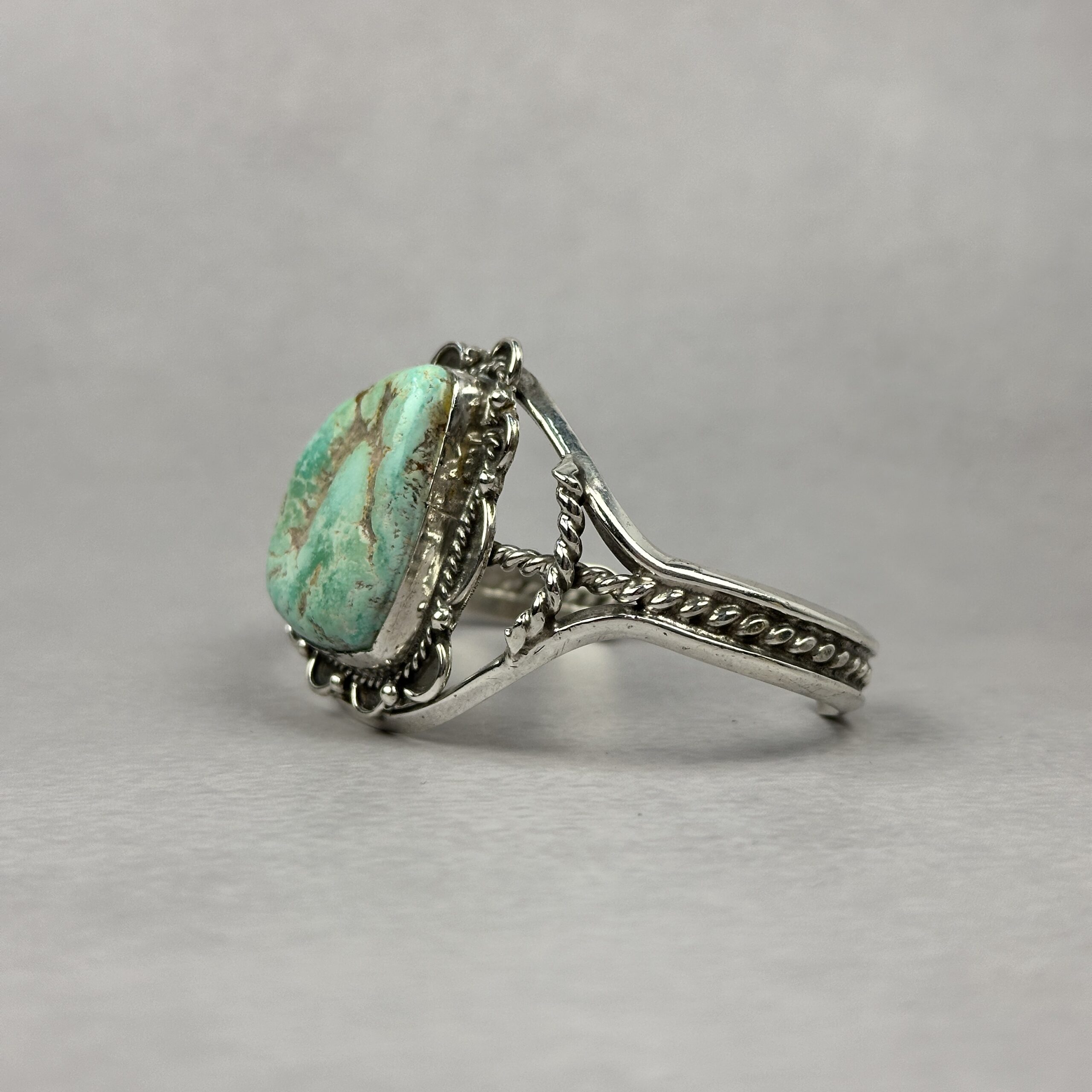 Set in solid .925 sterling silver, the stone is framed by a hand-twisted rope bezel and surrounded by traditional Navajo scalloped silver accents, adding depth and texture without overpowering the stone. The split-shank cuff construction is reinforced with twisted wire detailing, giving the bracelet strength, balance, and a classic Southwestern profile.