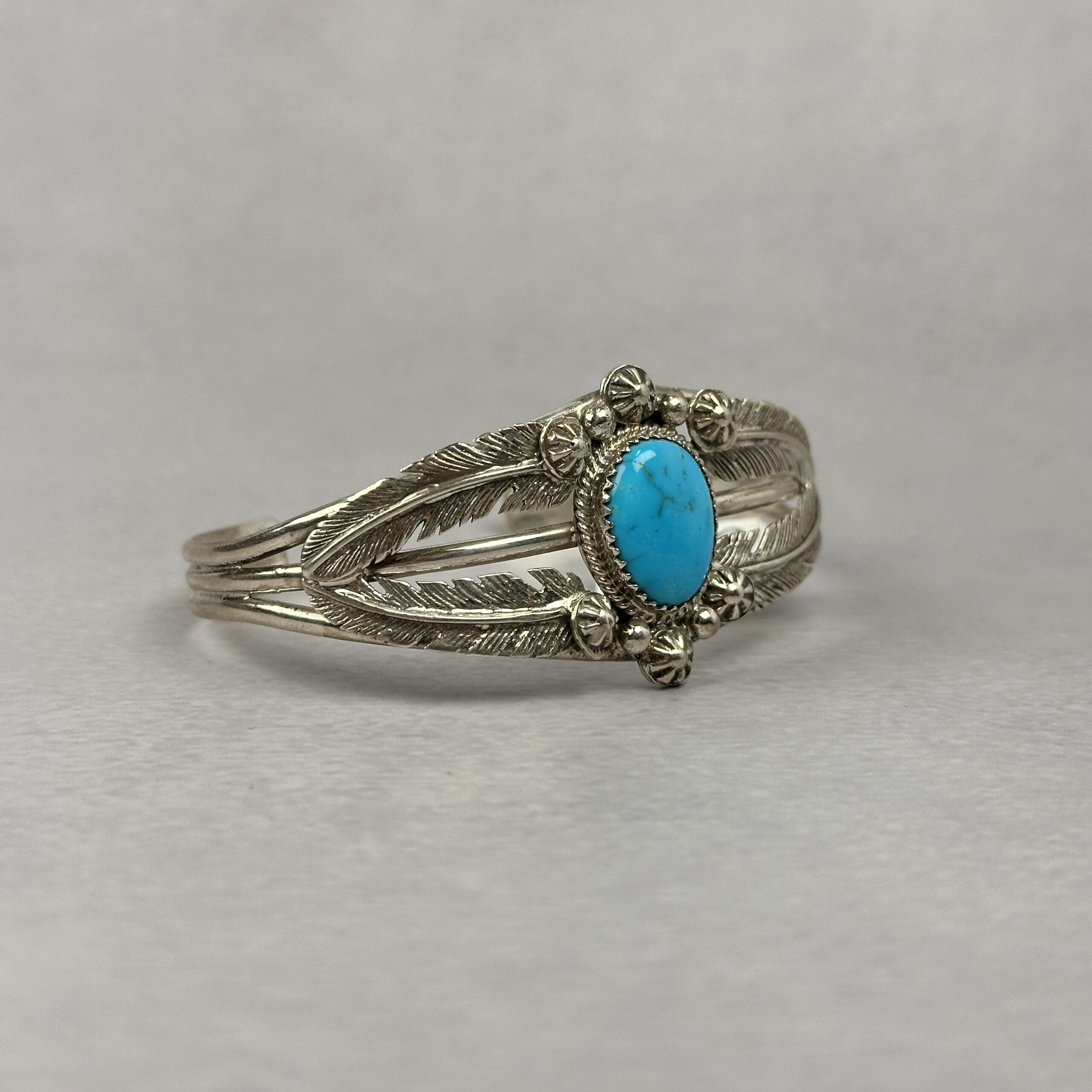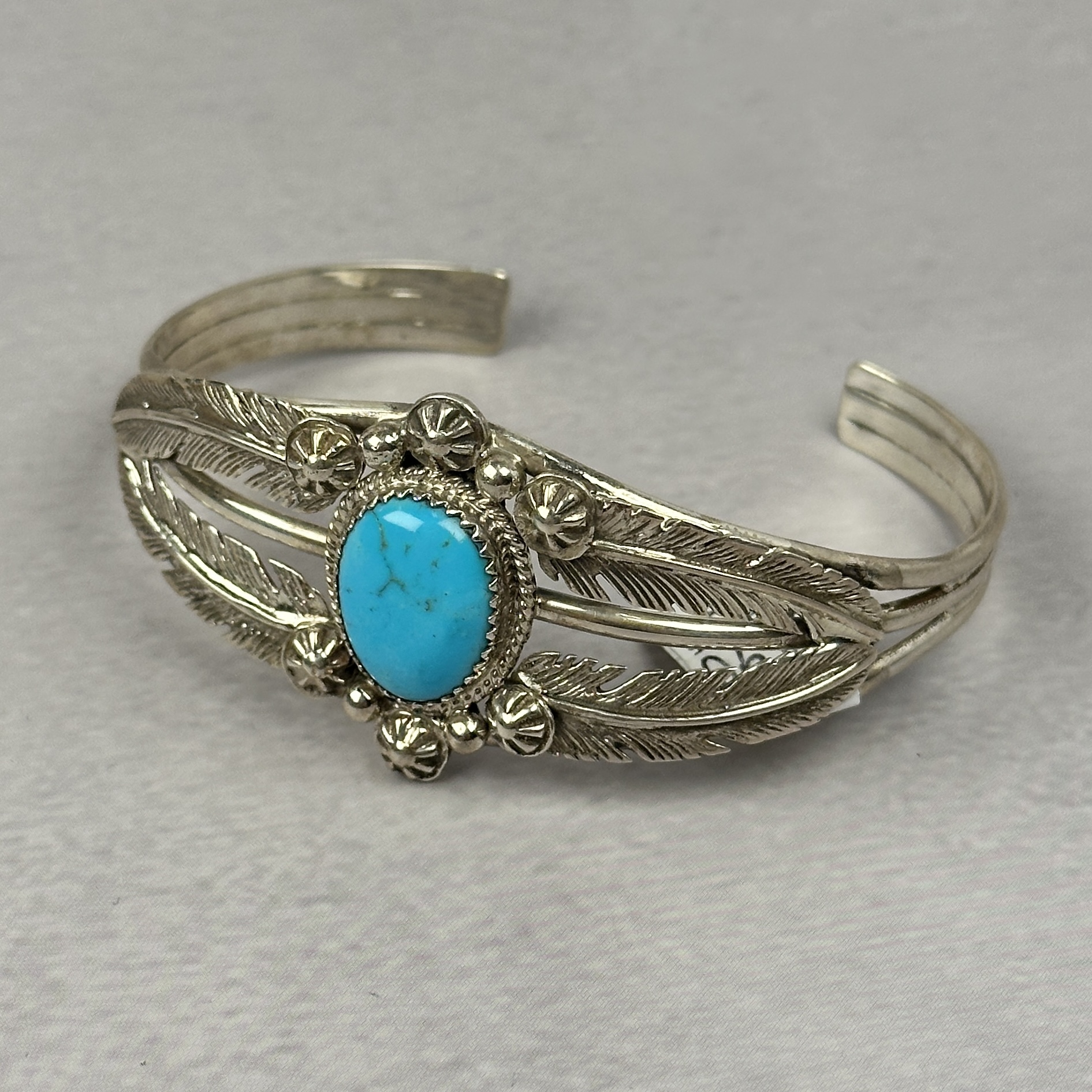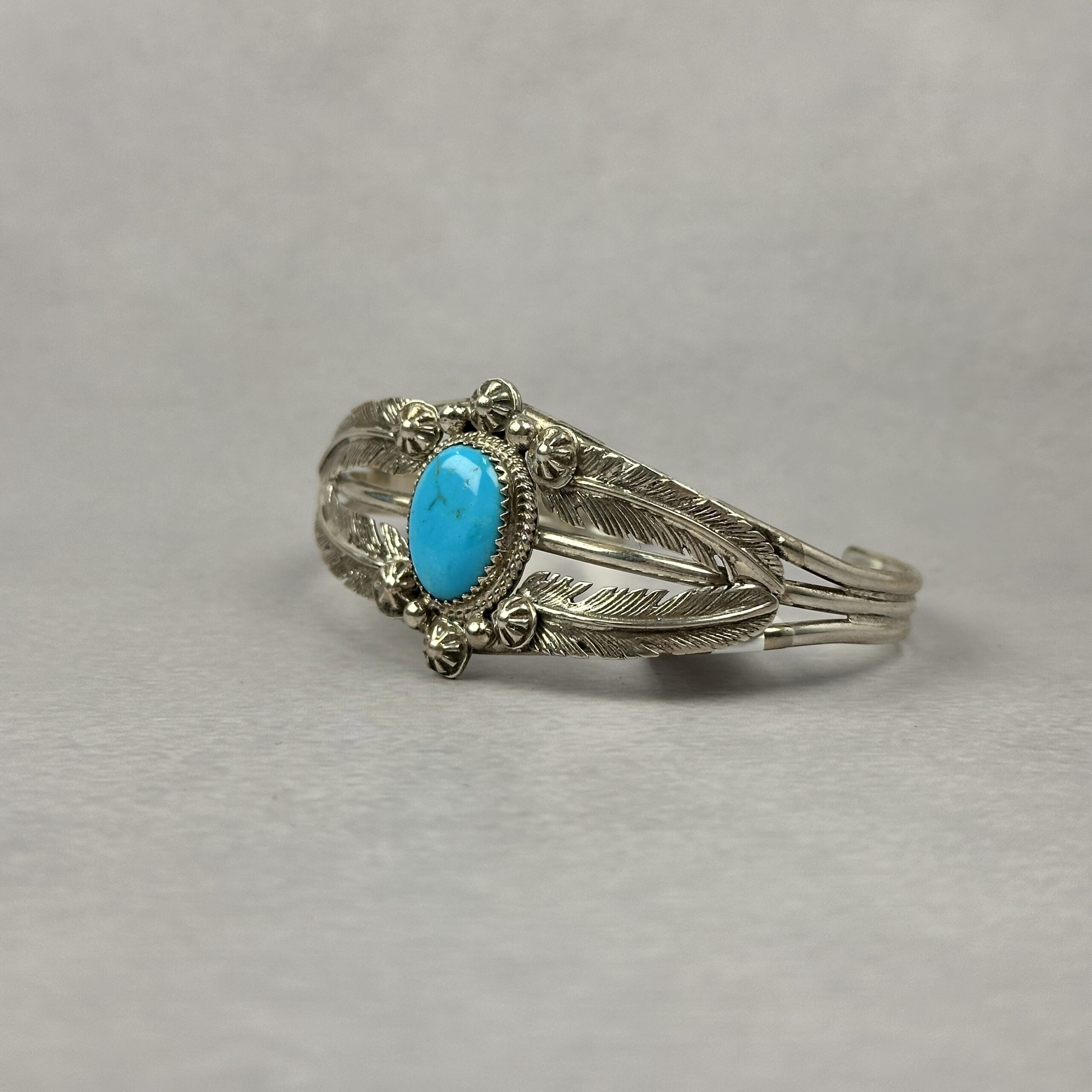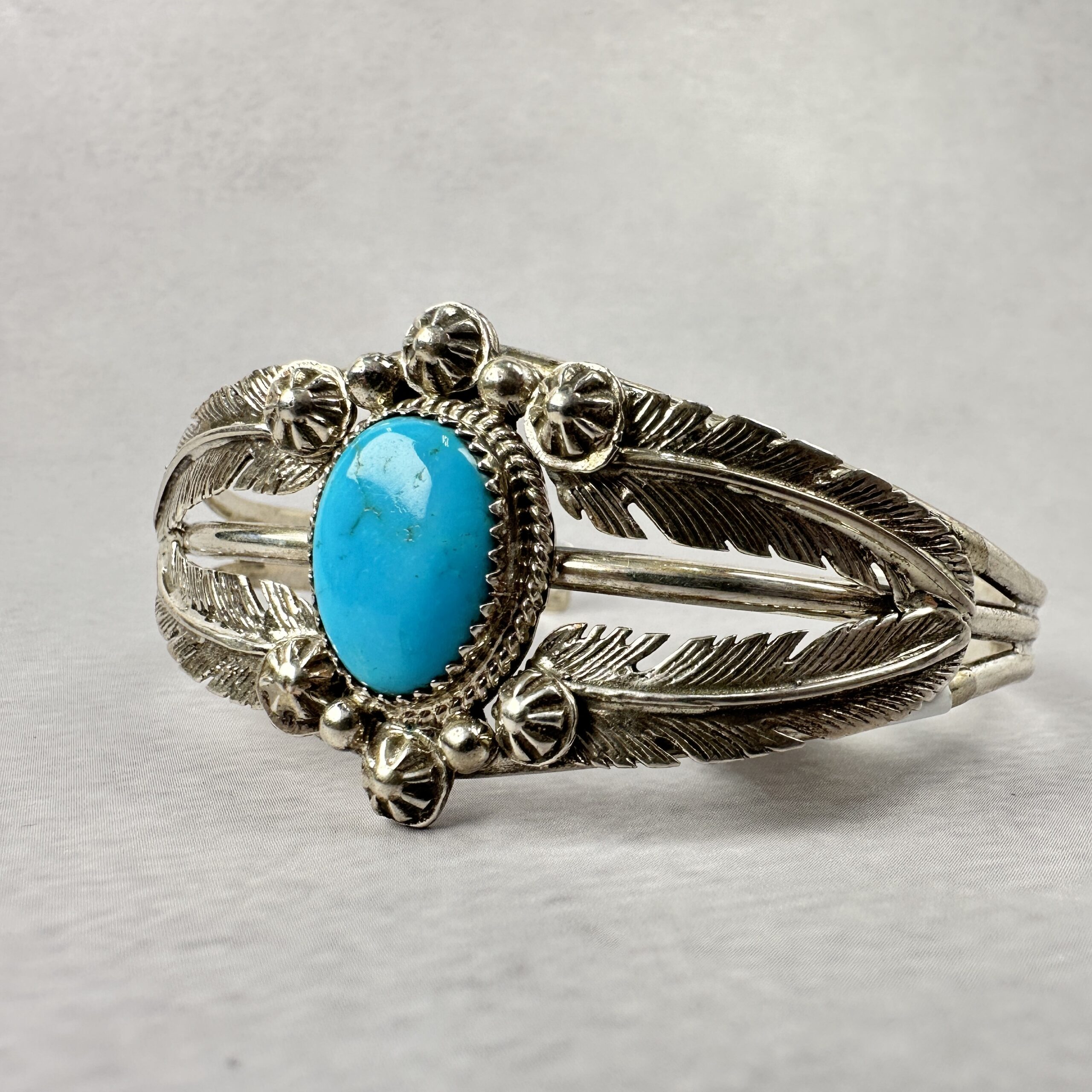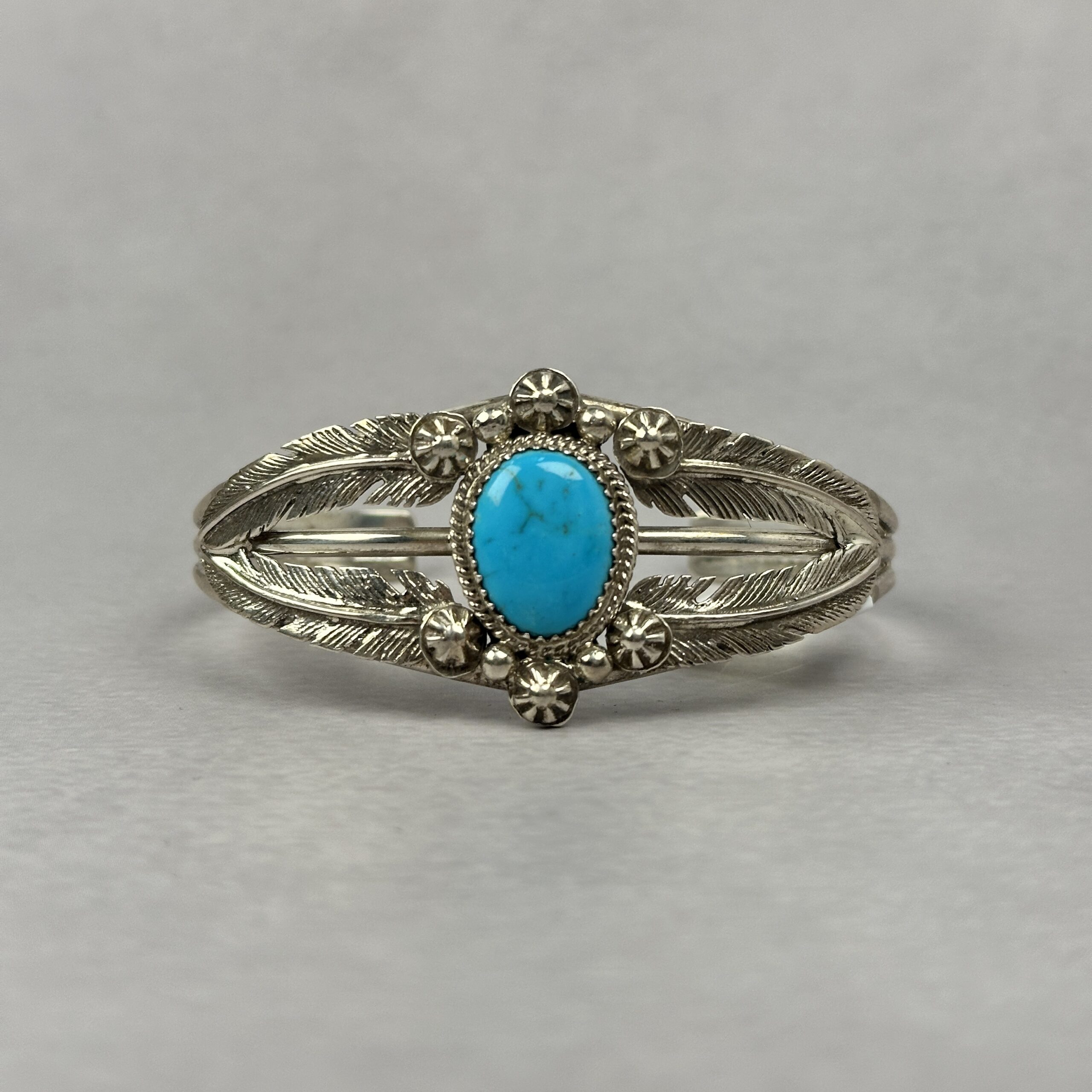 This handcrafted Navajo cuff showcases classic feather symbolism brought to life in solid sterling silver. At the center sits a vivid oval turquoise stone, polished to a smooth high dome that contrasts beautifully against the deeply stamped silverwork.