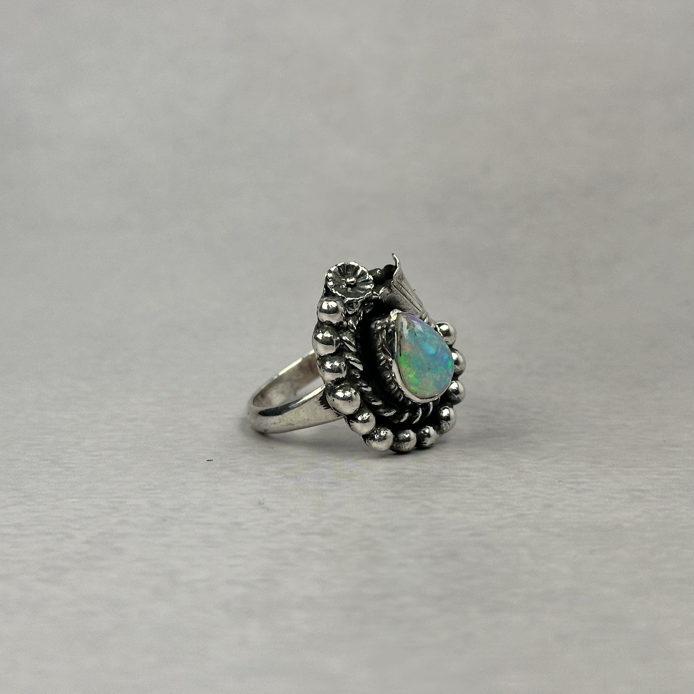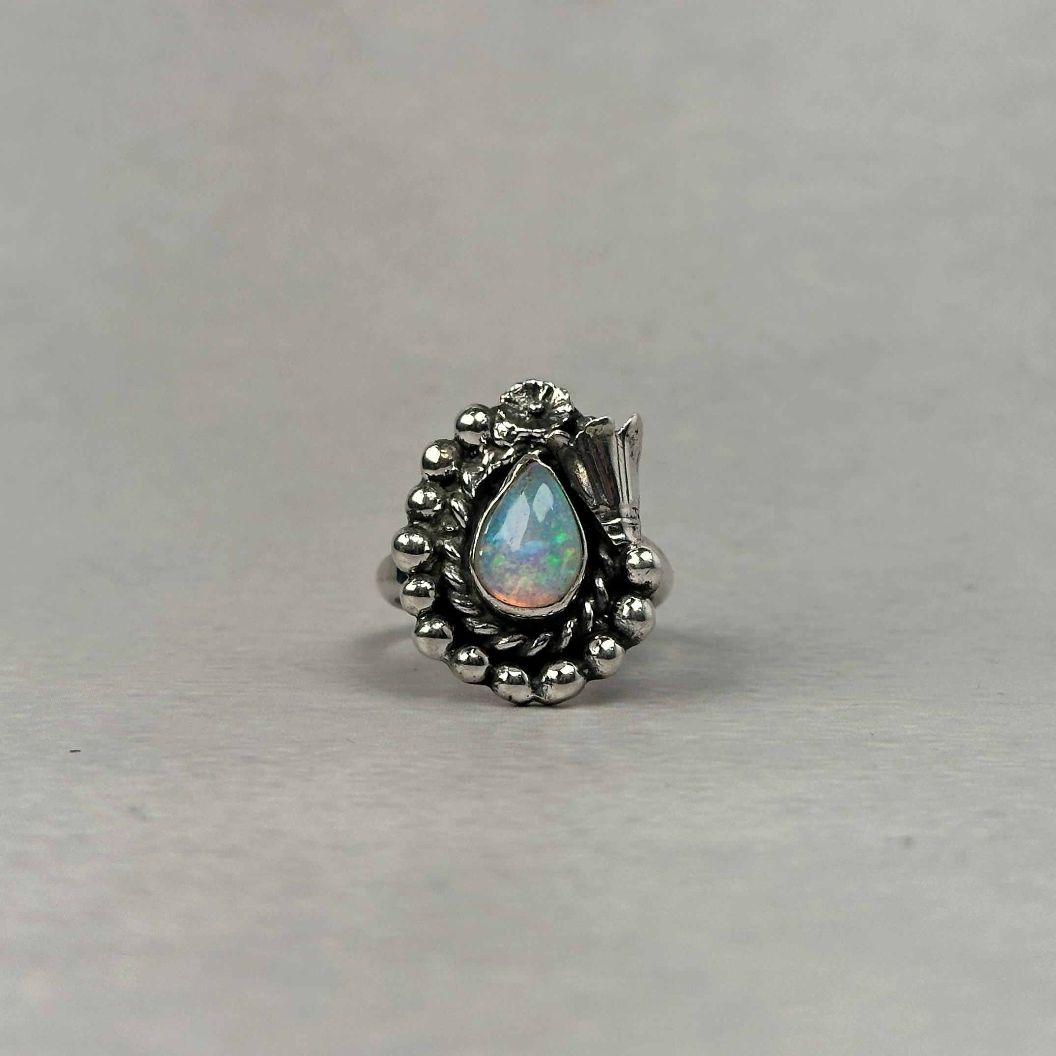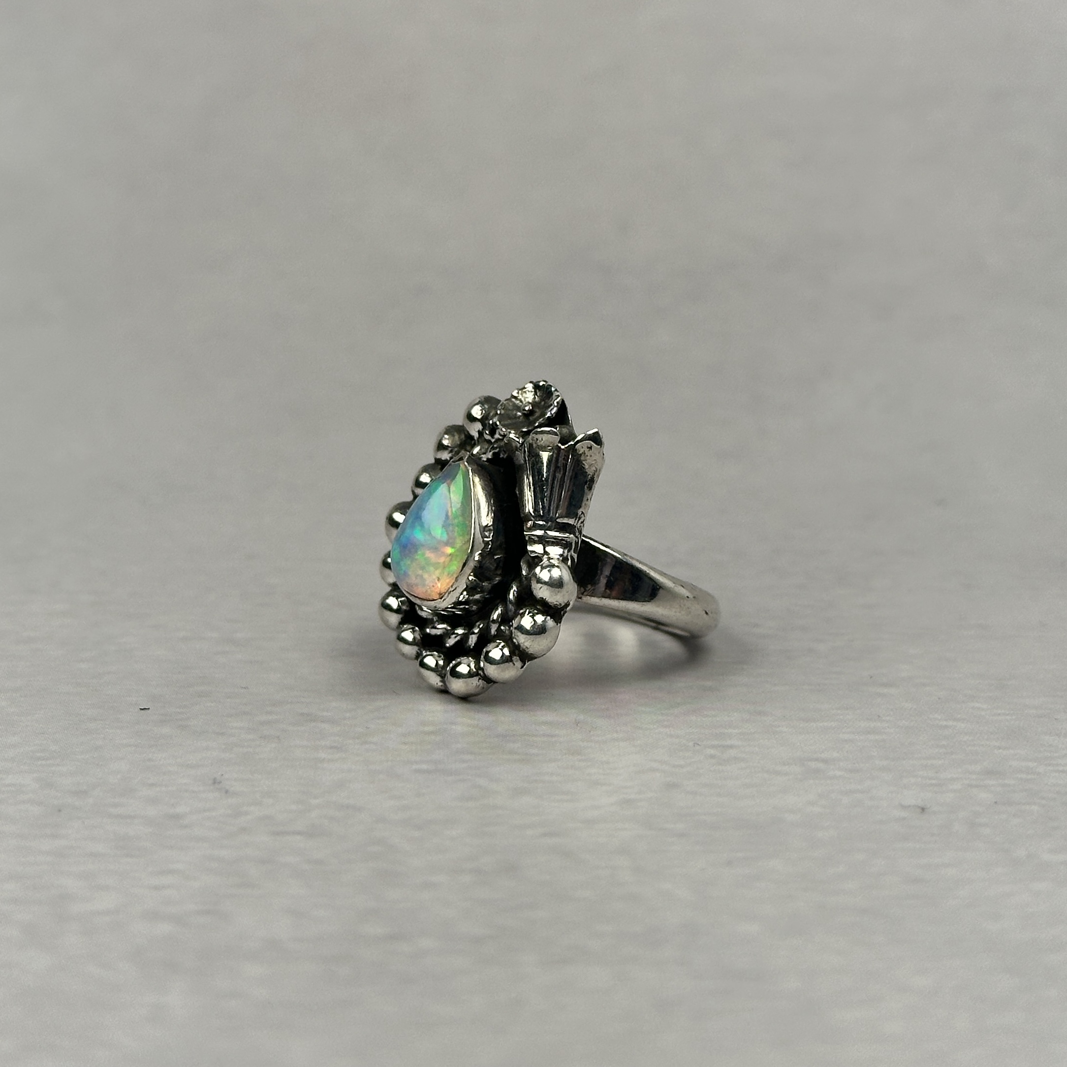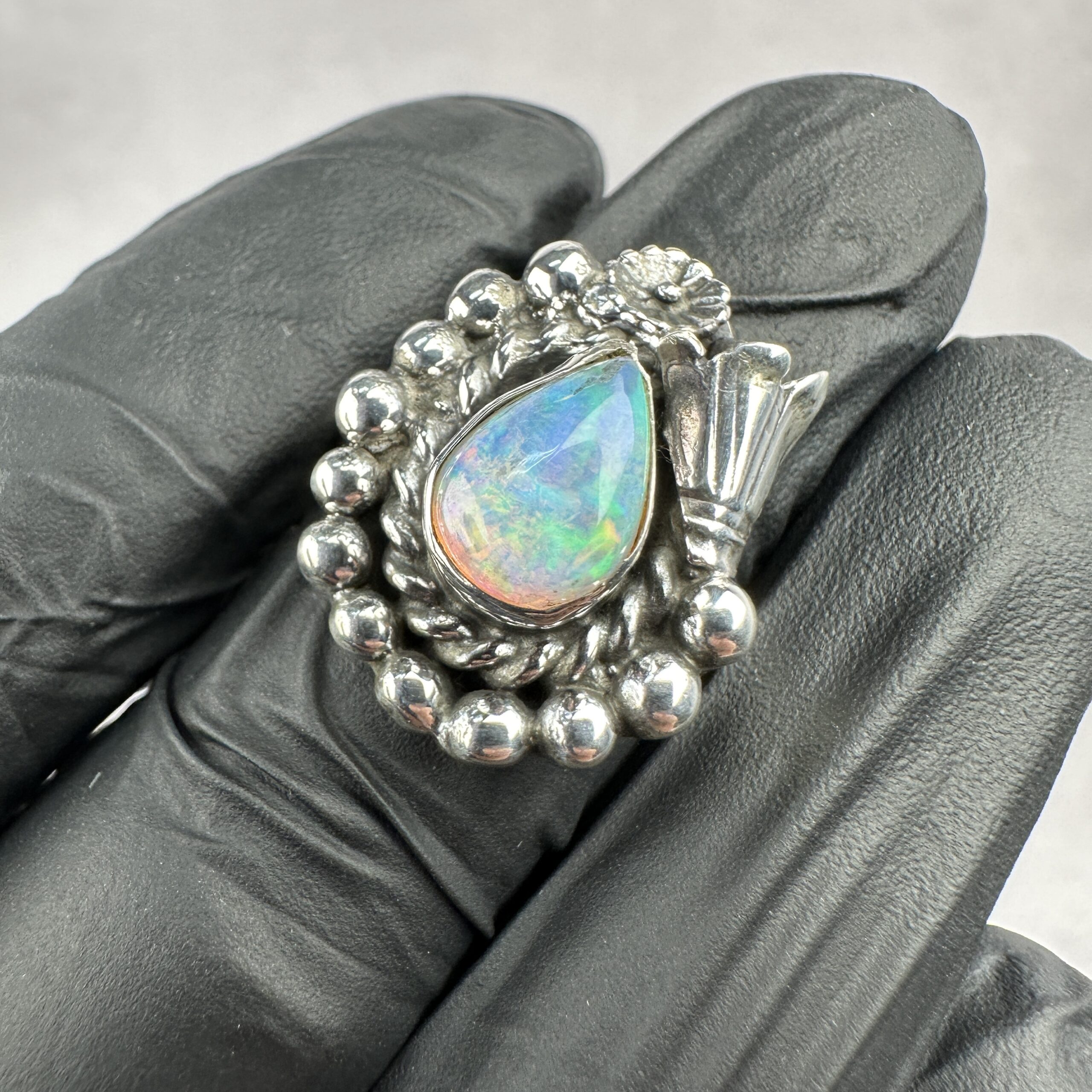 Ethiopian opal is prized for its intense, living play-of-color—flashes of green, blue, fire, and iridescence that shift beautifully with light and movement. While Ethiopian opal itself is highly sought after, it is exceptionally rare to find it set in traditional Navajo silverwork, making rings like this extremely difficult to source.