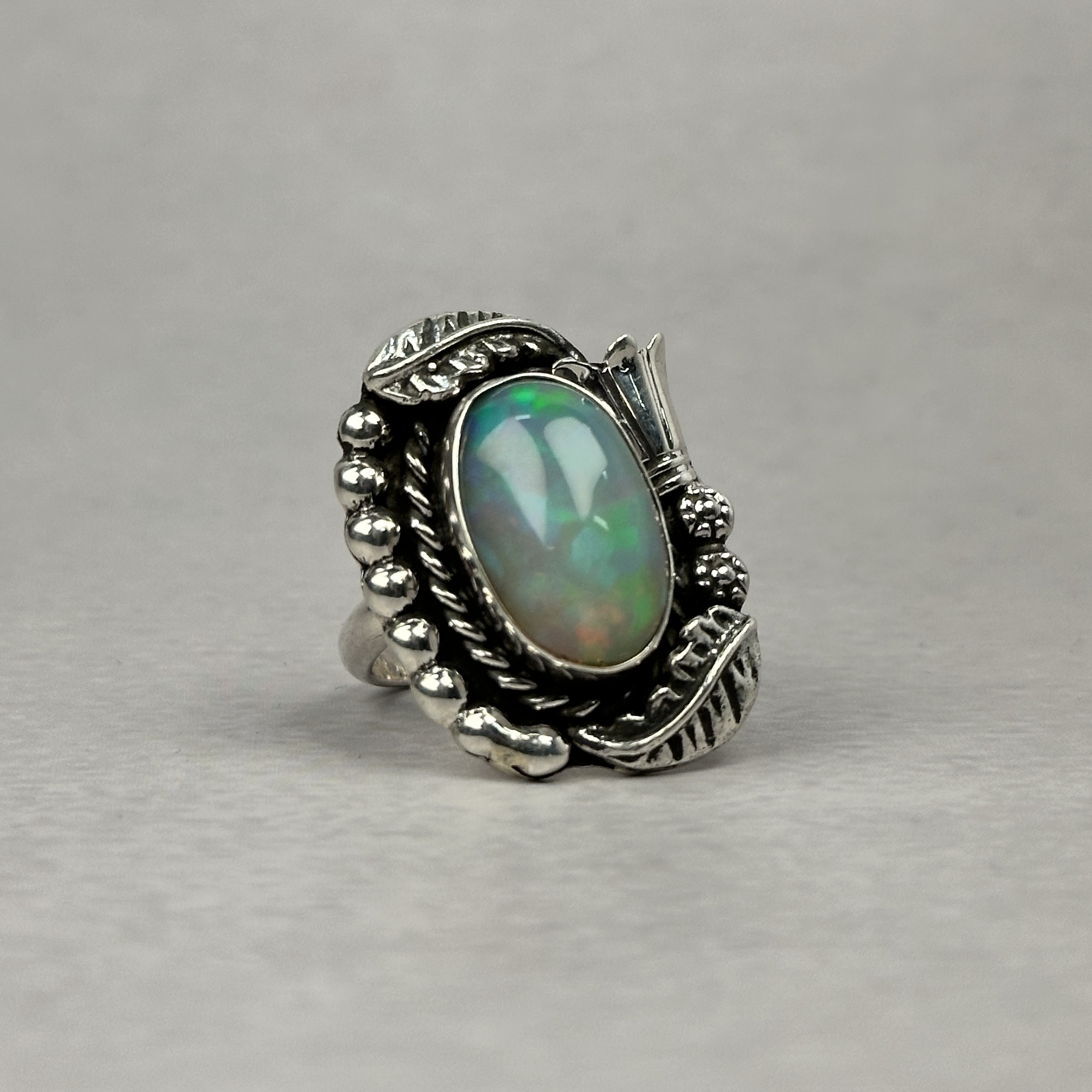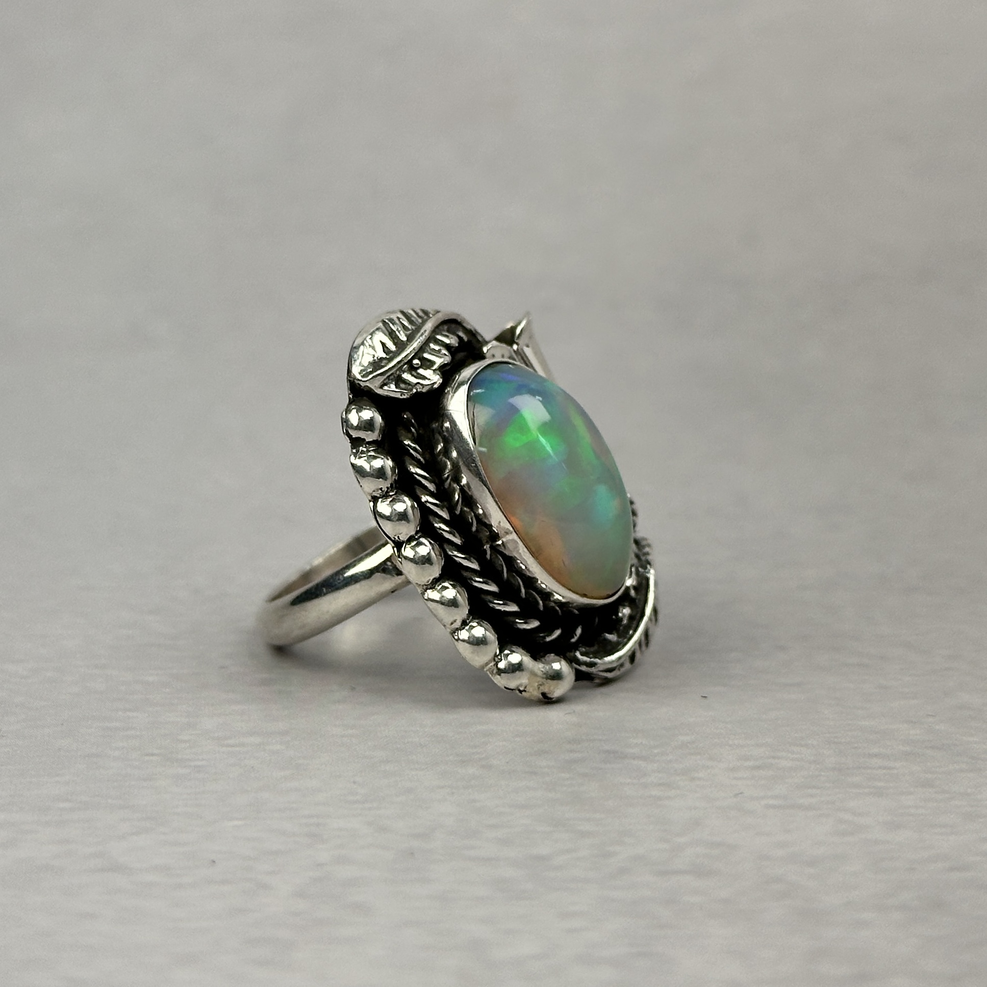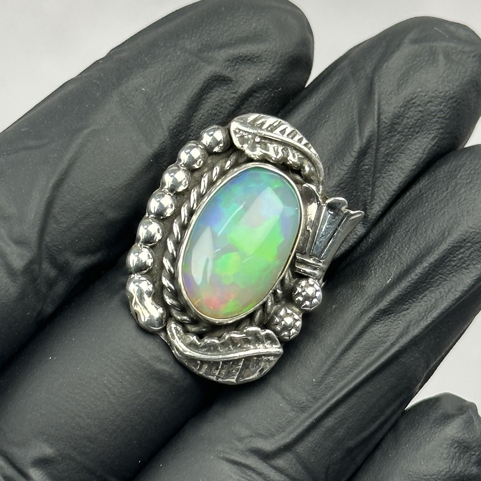Ethiopian opal is prized for its intense, living play-of-color—flashes of green, blue, fire, and iridescence that shift beautifully with light and movement. While Ethiopian opal itself is highly sought after, it is exceptionally rare to find it set in traditional Navajo silverwork, making rings like this extremely difficult to source.