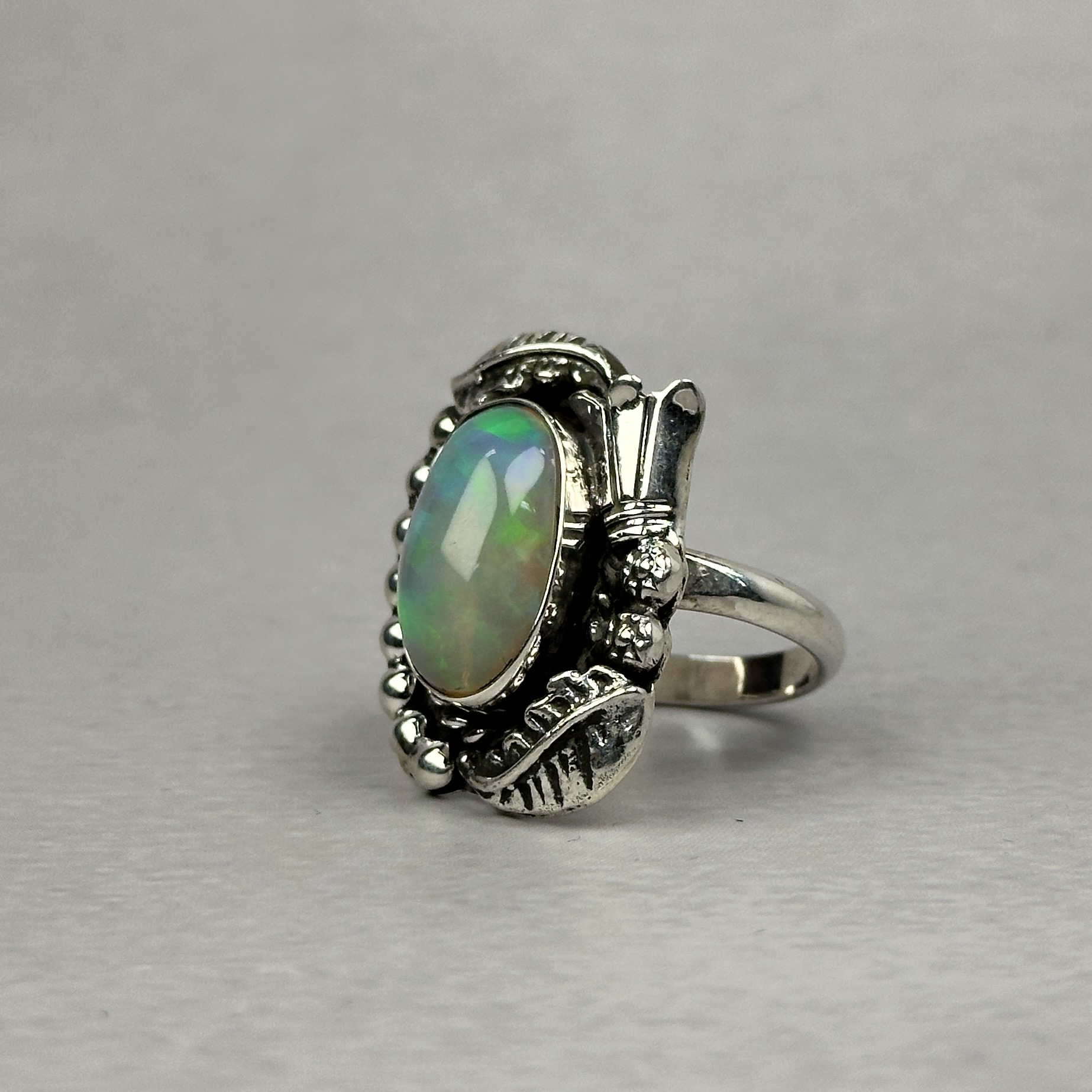 Fiery Greenish Blue 8ctw Ethiopian Opal Ring – Navajo Made – Homer Begay – sz 9 3/4