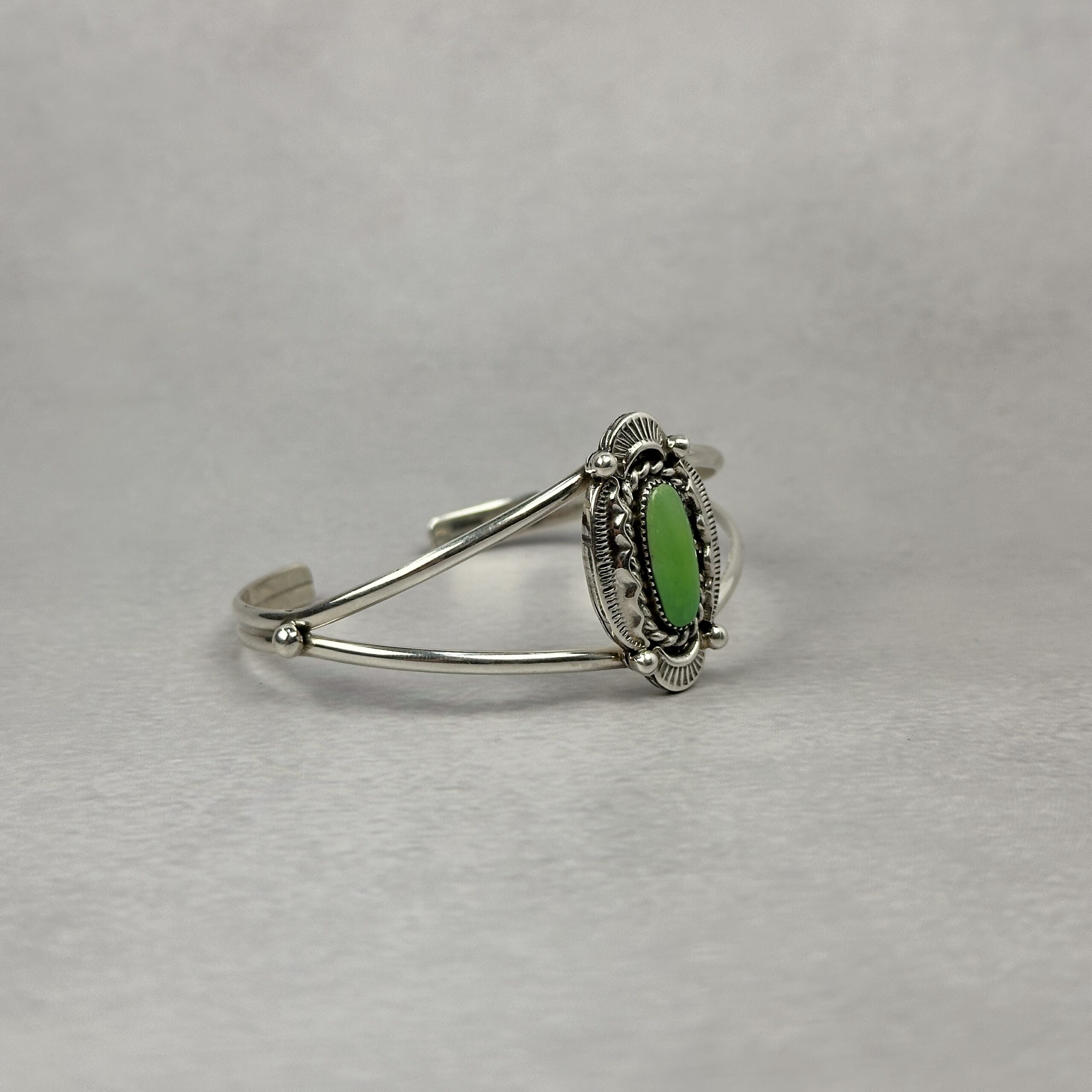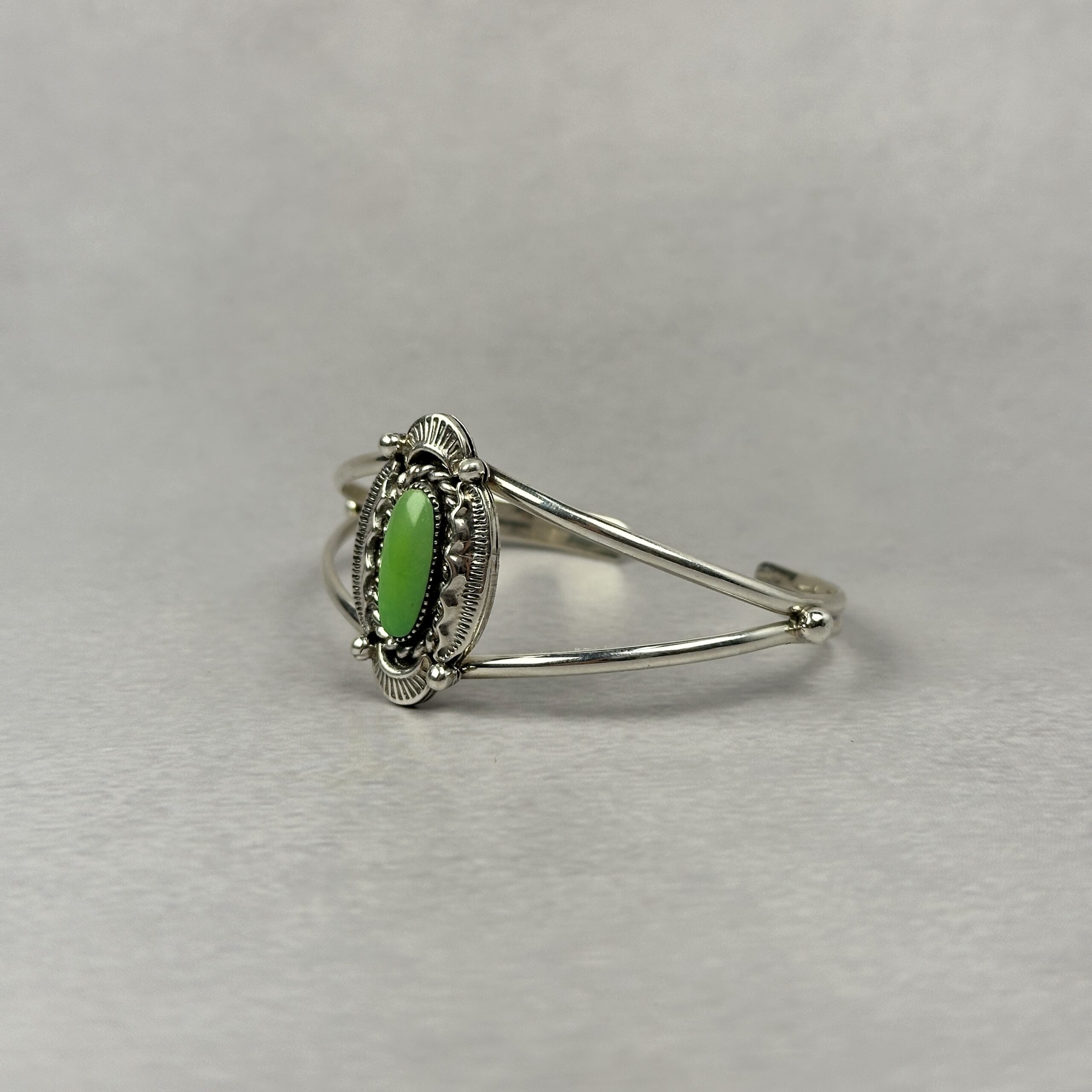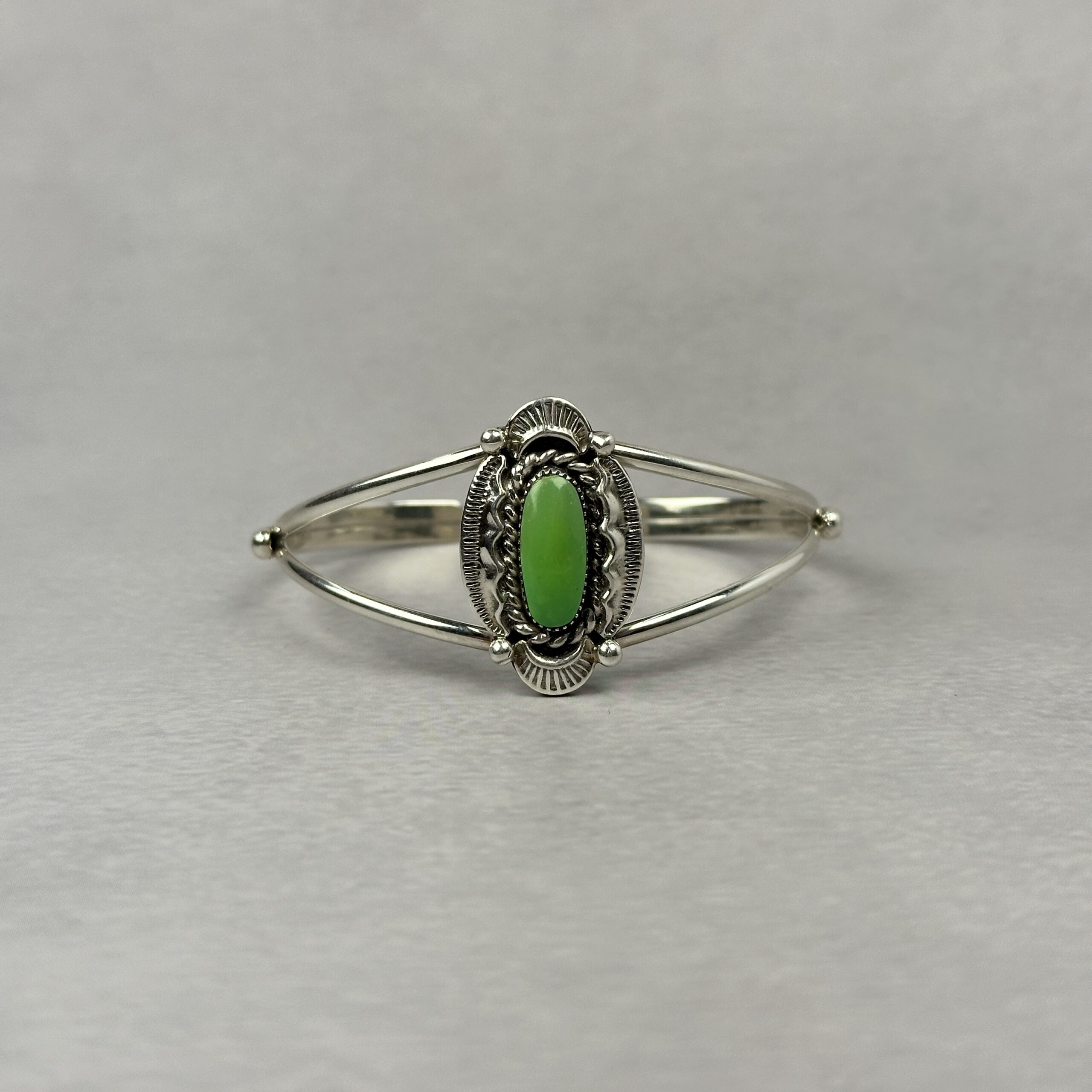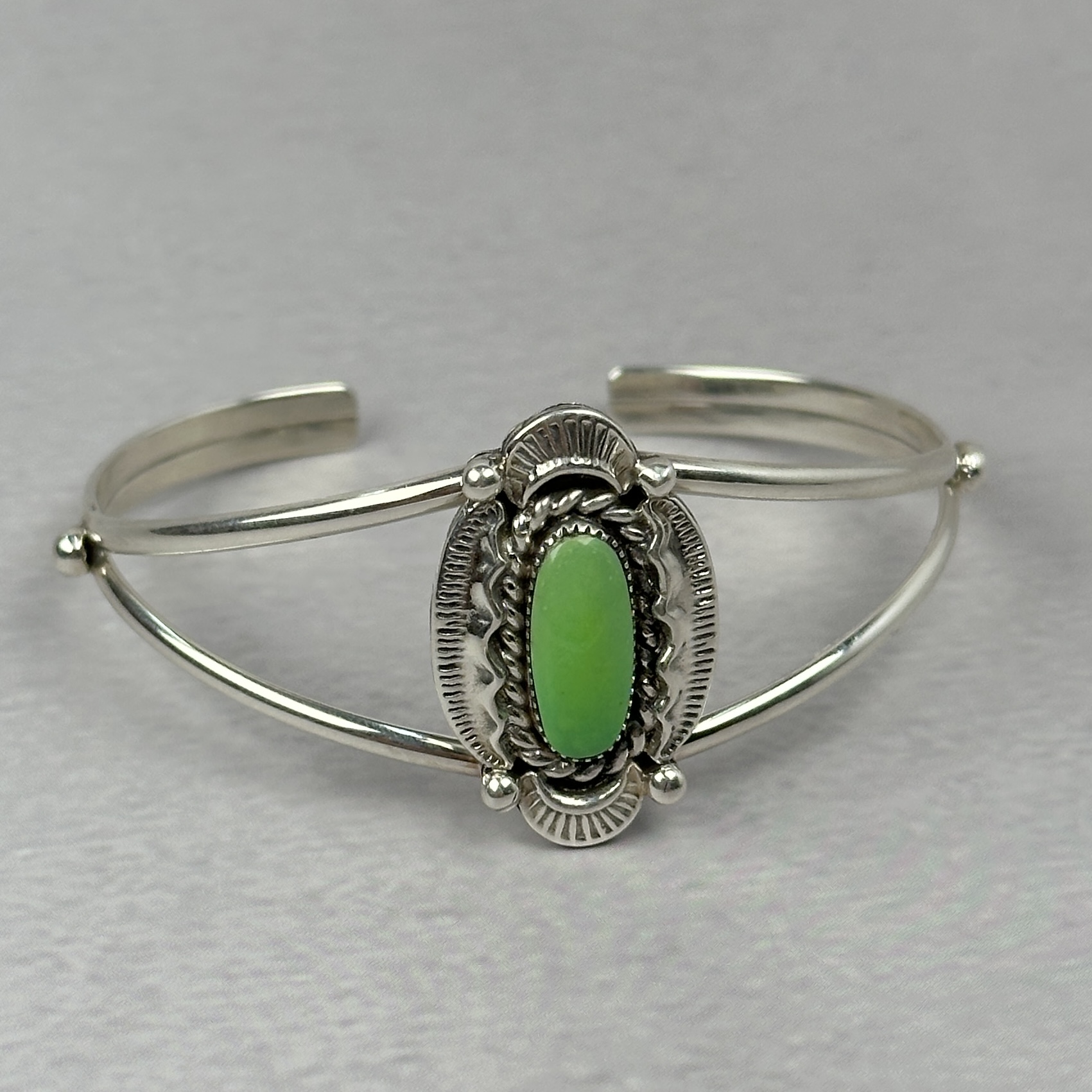 This Navajo-made sterling silver cuff features a natural green-toned gaspeite stone set vertically at the center. The stone shows soft lime-to-apple green coloration. Surrounding the cabochon is hand-applied traditional silverwork including twisted wire, stamped details, and oxidized accents that add depth without overpowering the stone.