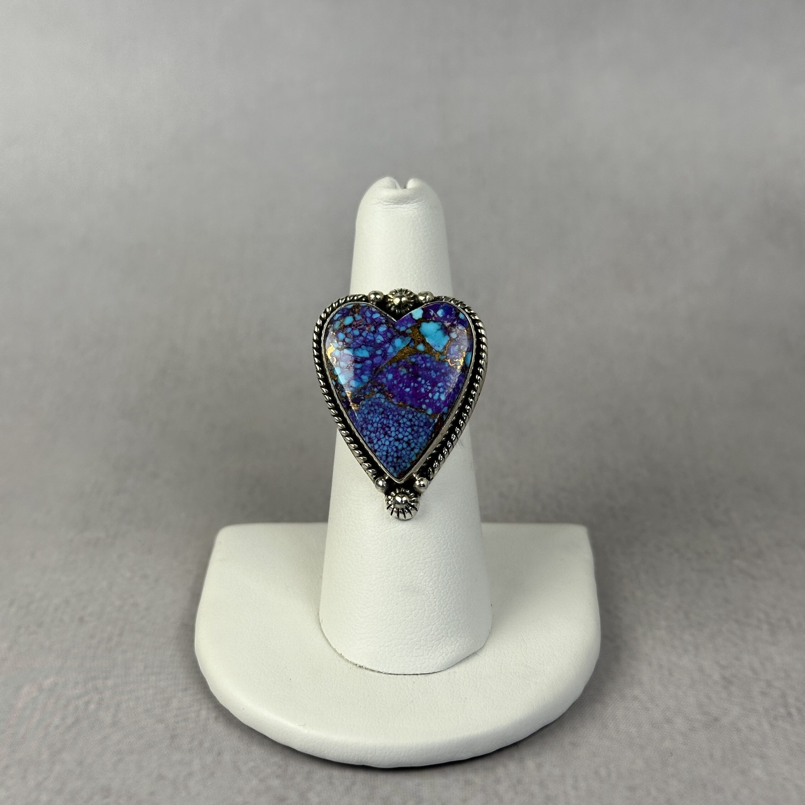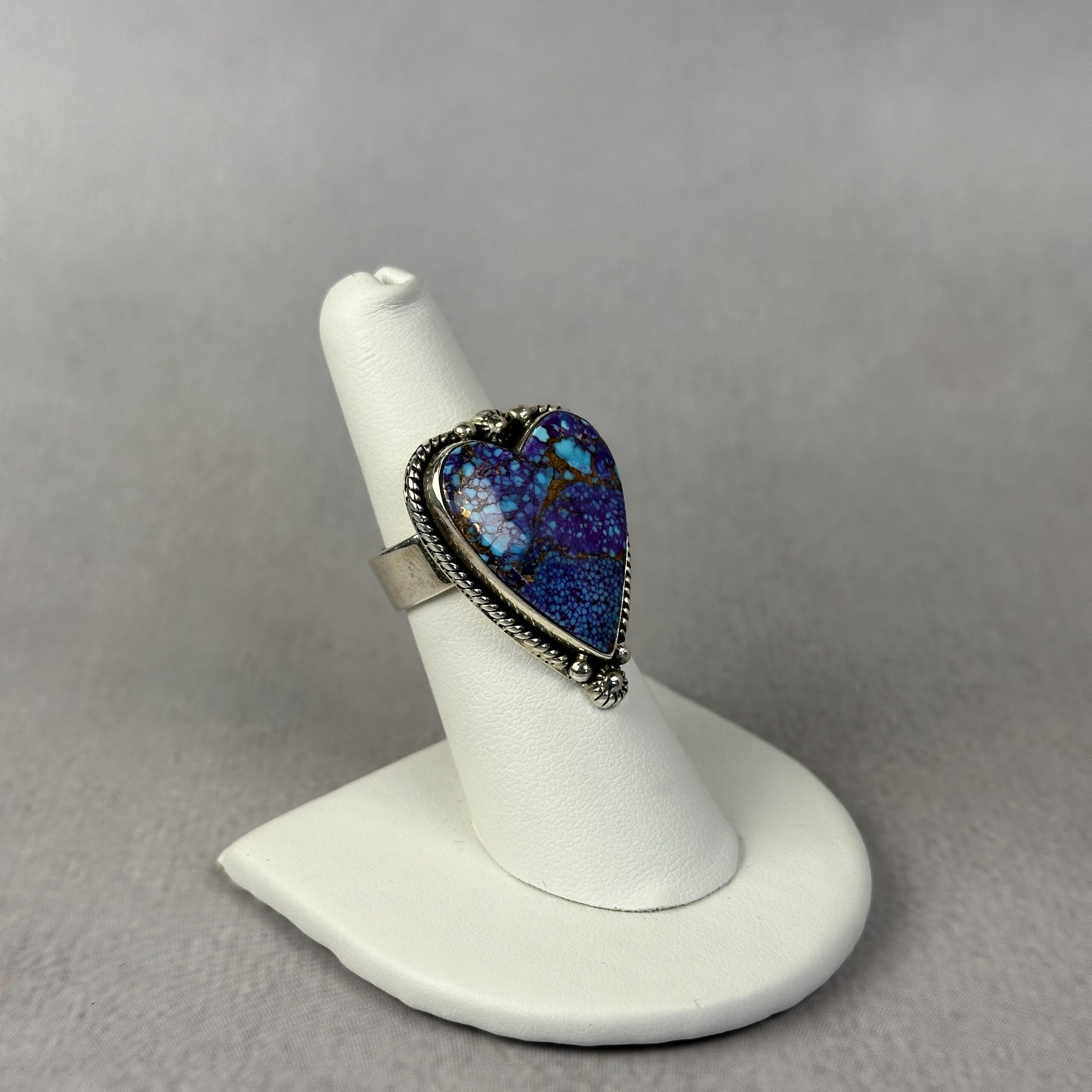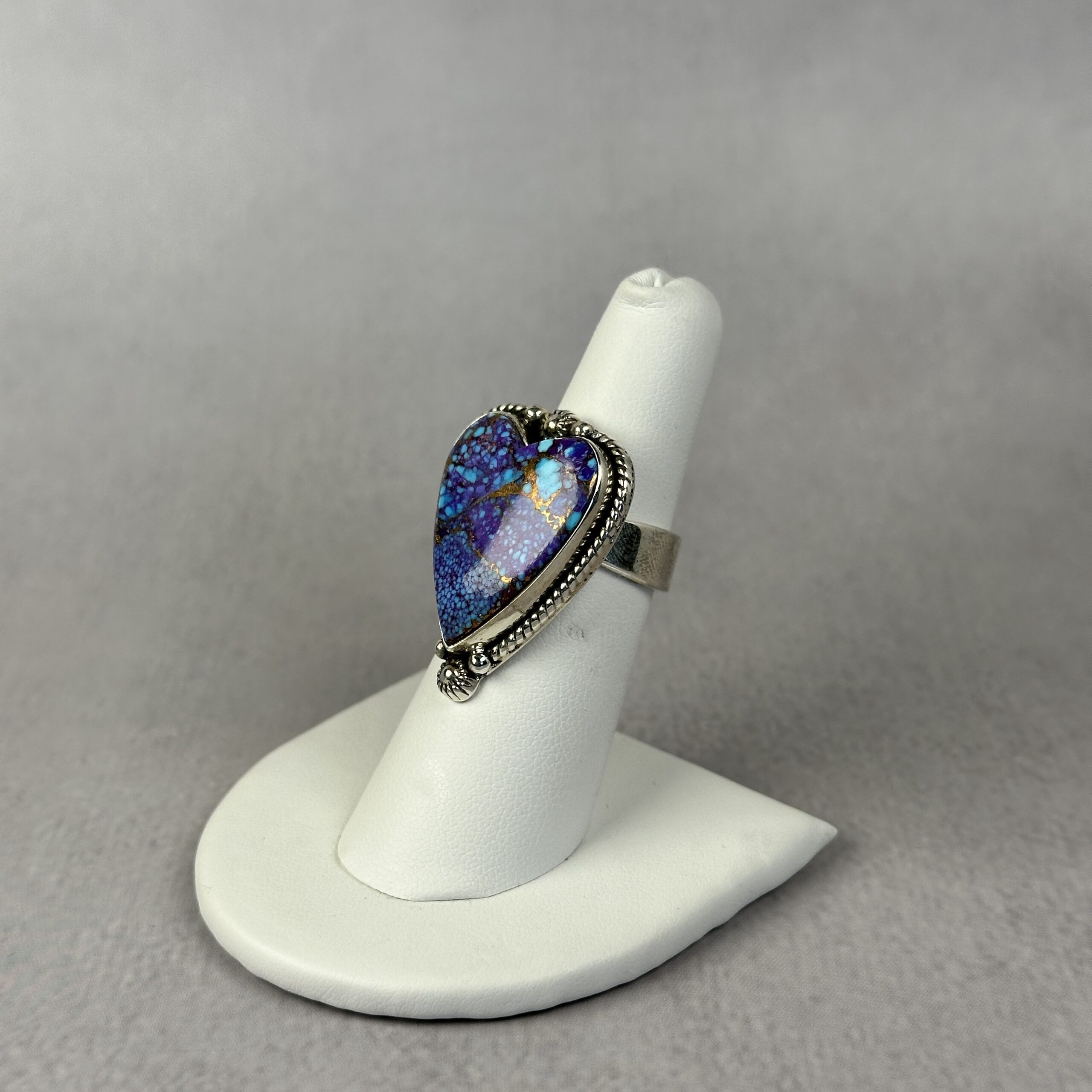 This handcrafted ring features a heart-shaped purple spiny oyster set in .925 sterling silver. The stone displays rich violet and blue tones with natural matrix throughout, giving it exceptional depth and character. Finished with classic silver detailing, this ring blends bold color with timeless craftsmanship. No two purple turquoise stones are alike, ensuring a one-of-a-kind piece. A perfect statement ring for collectors of rare turquoise and heart-shaped gemstone jewelry.