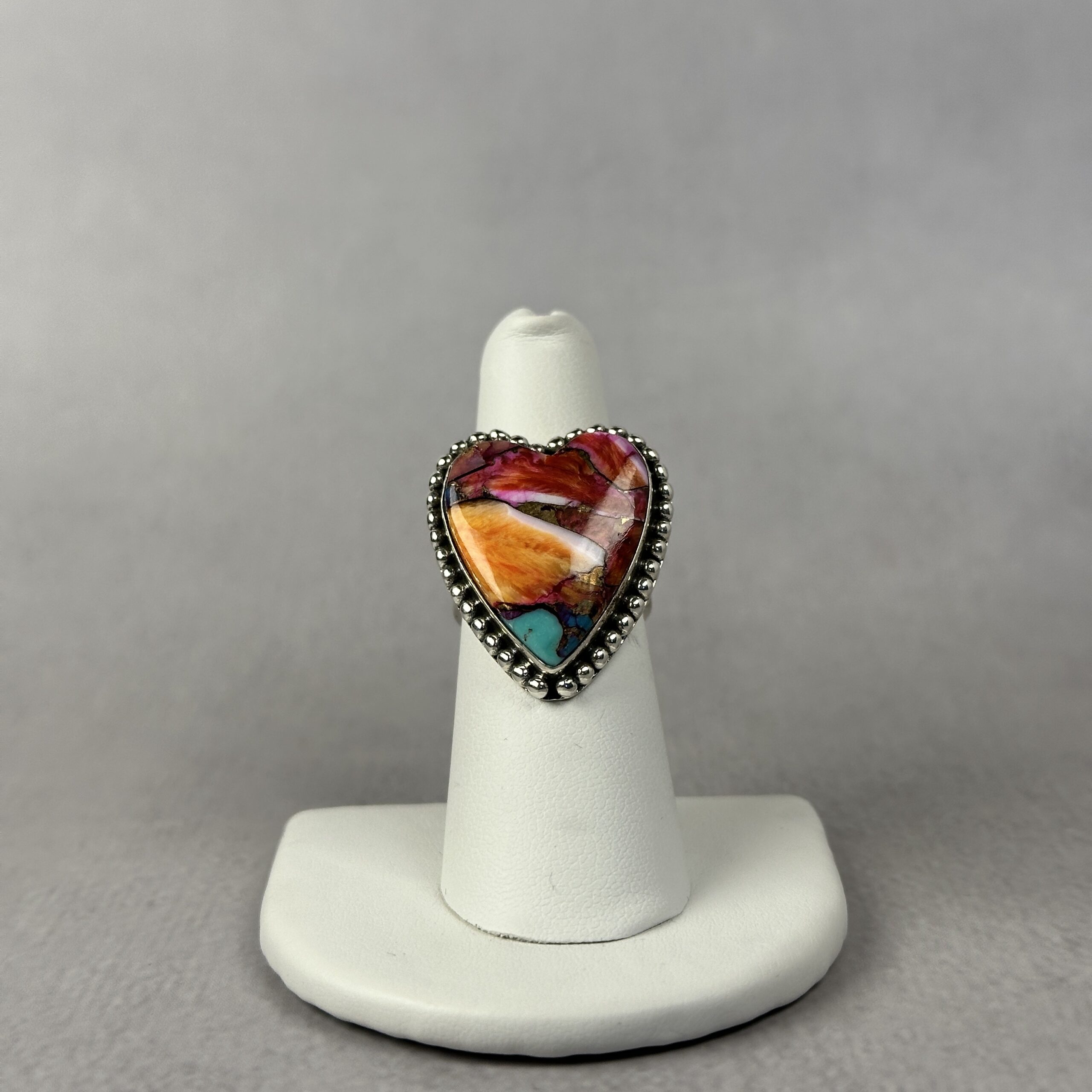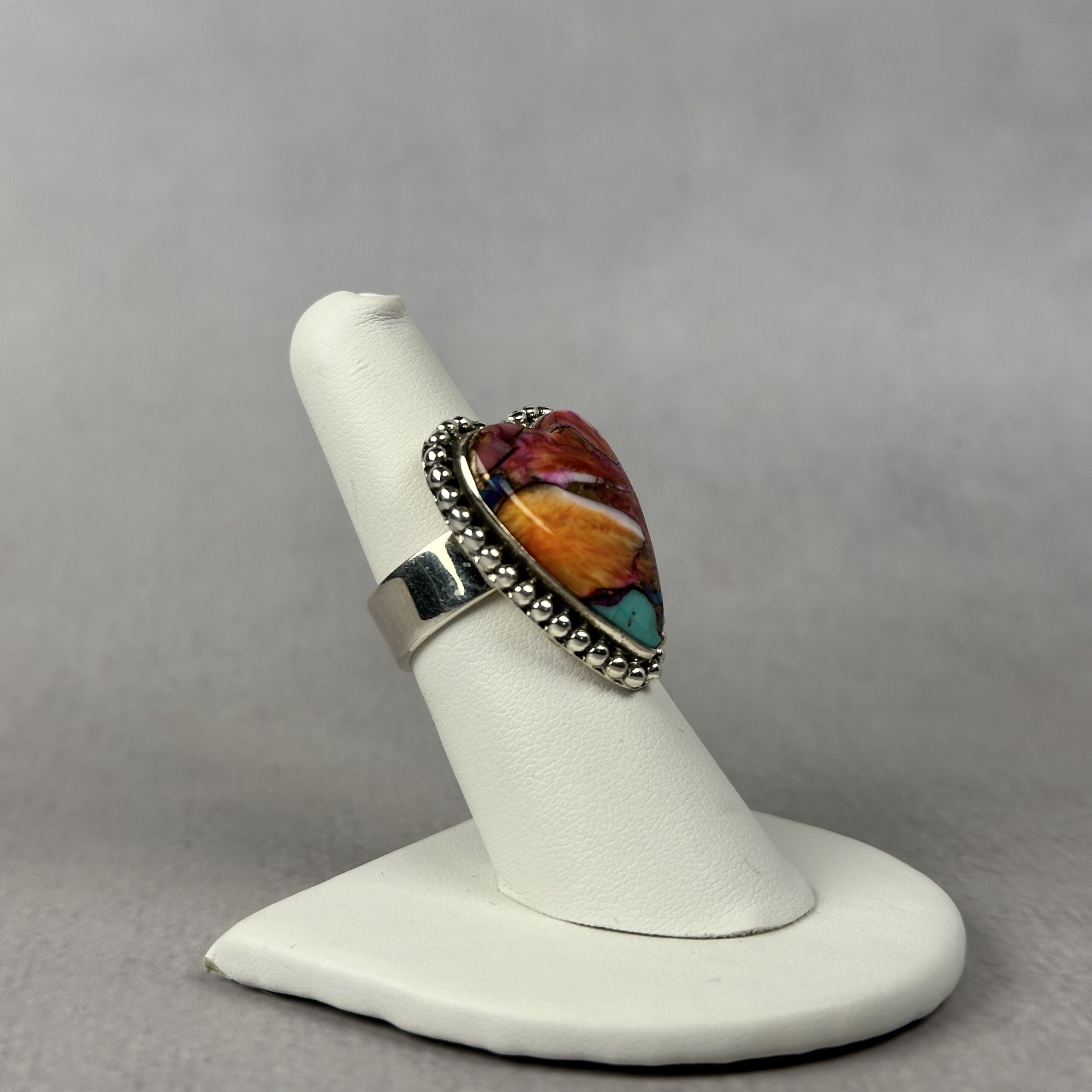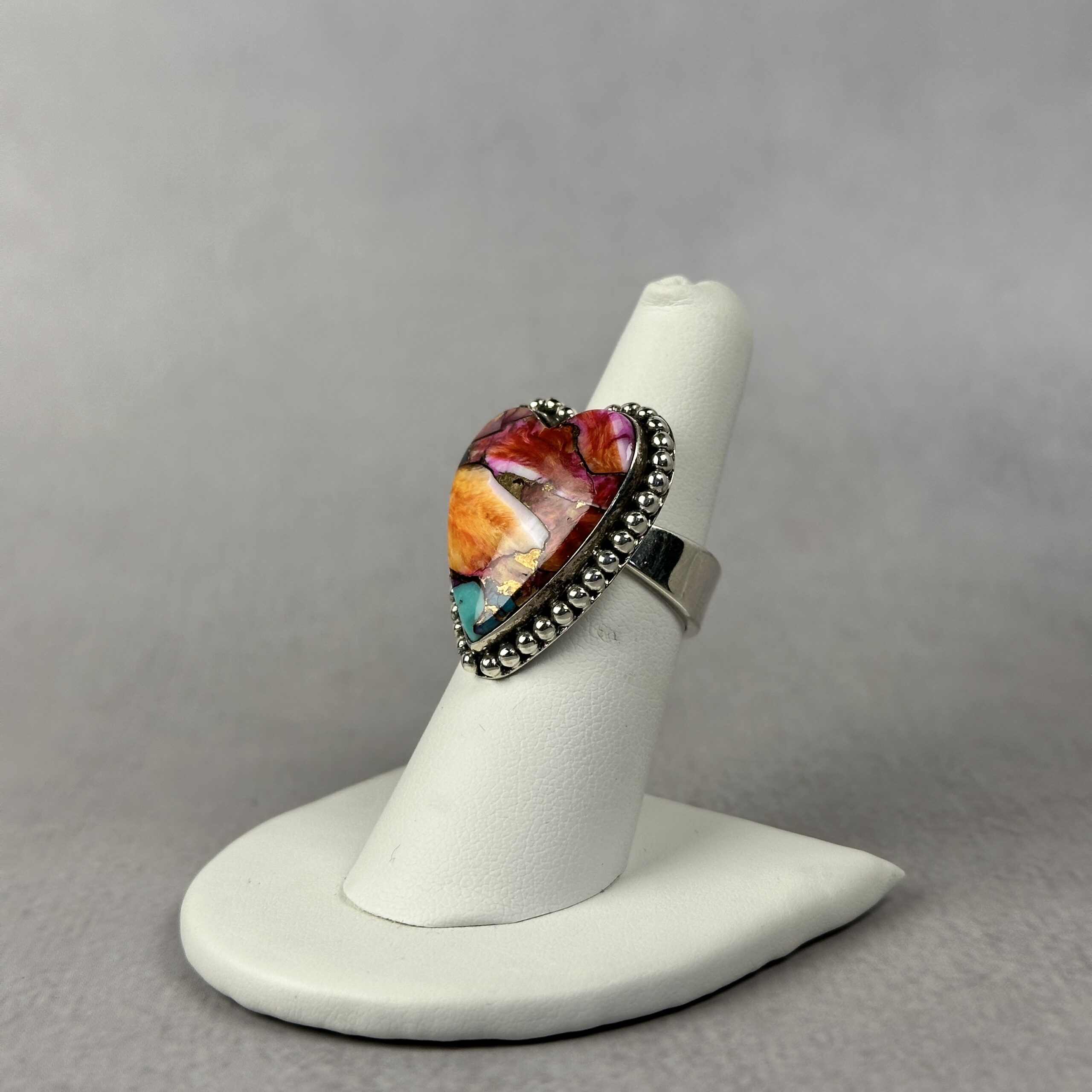 A vivid multicolor spiny oyster heart ring set in sterling silver, bursting with natural color and character. A true statement piece.