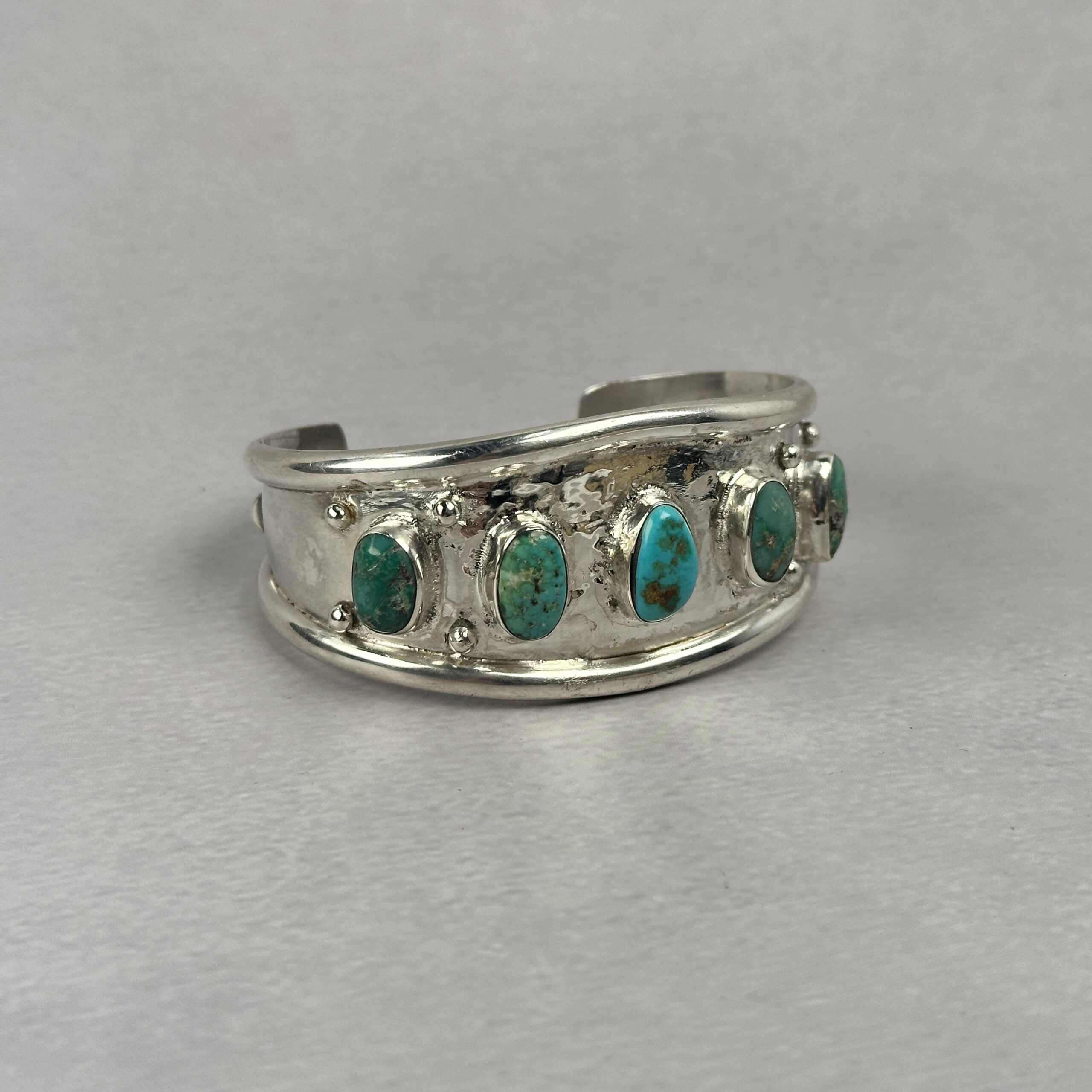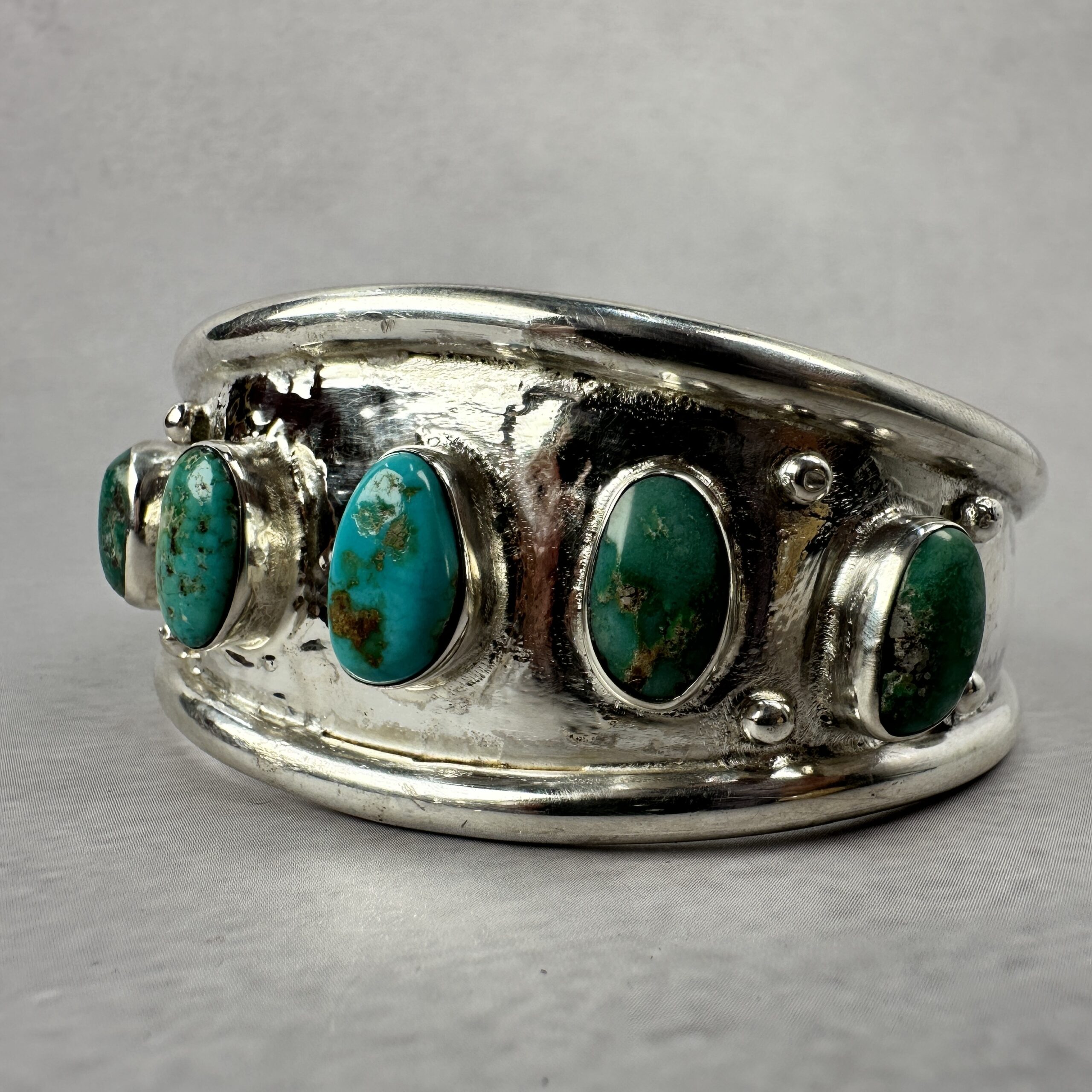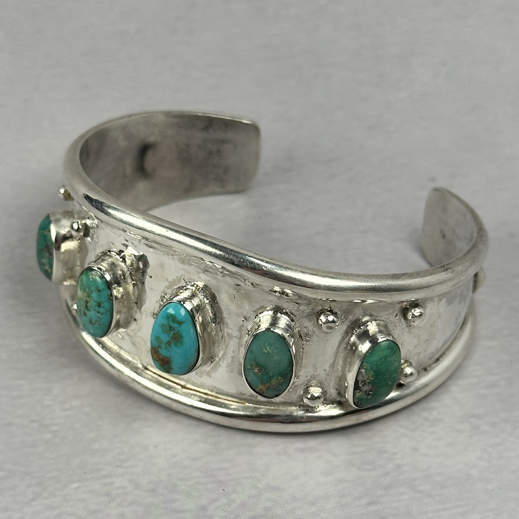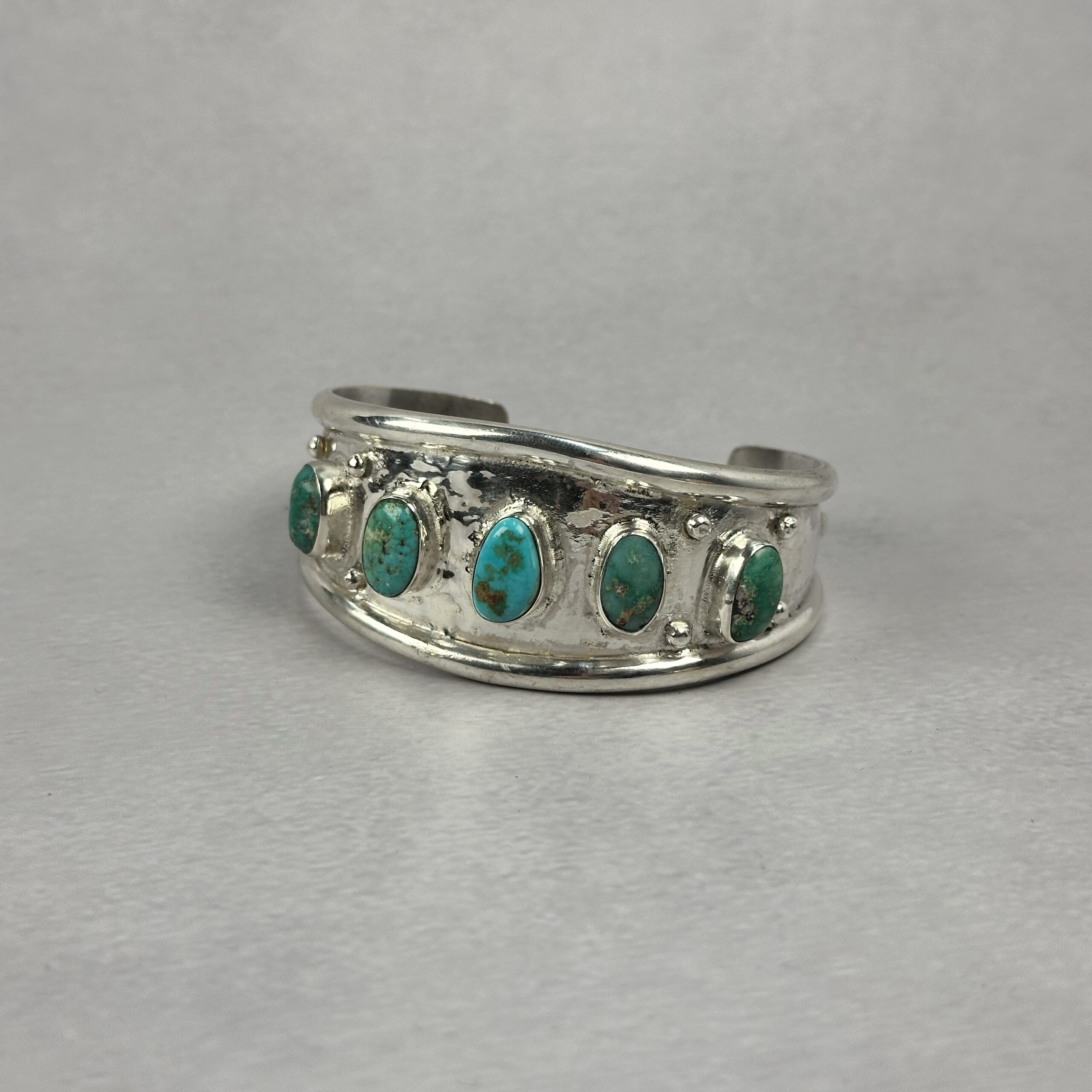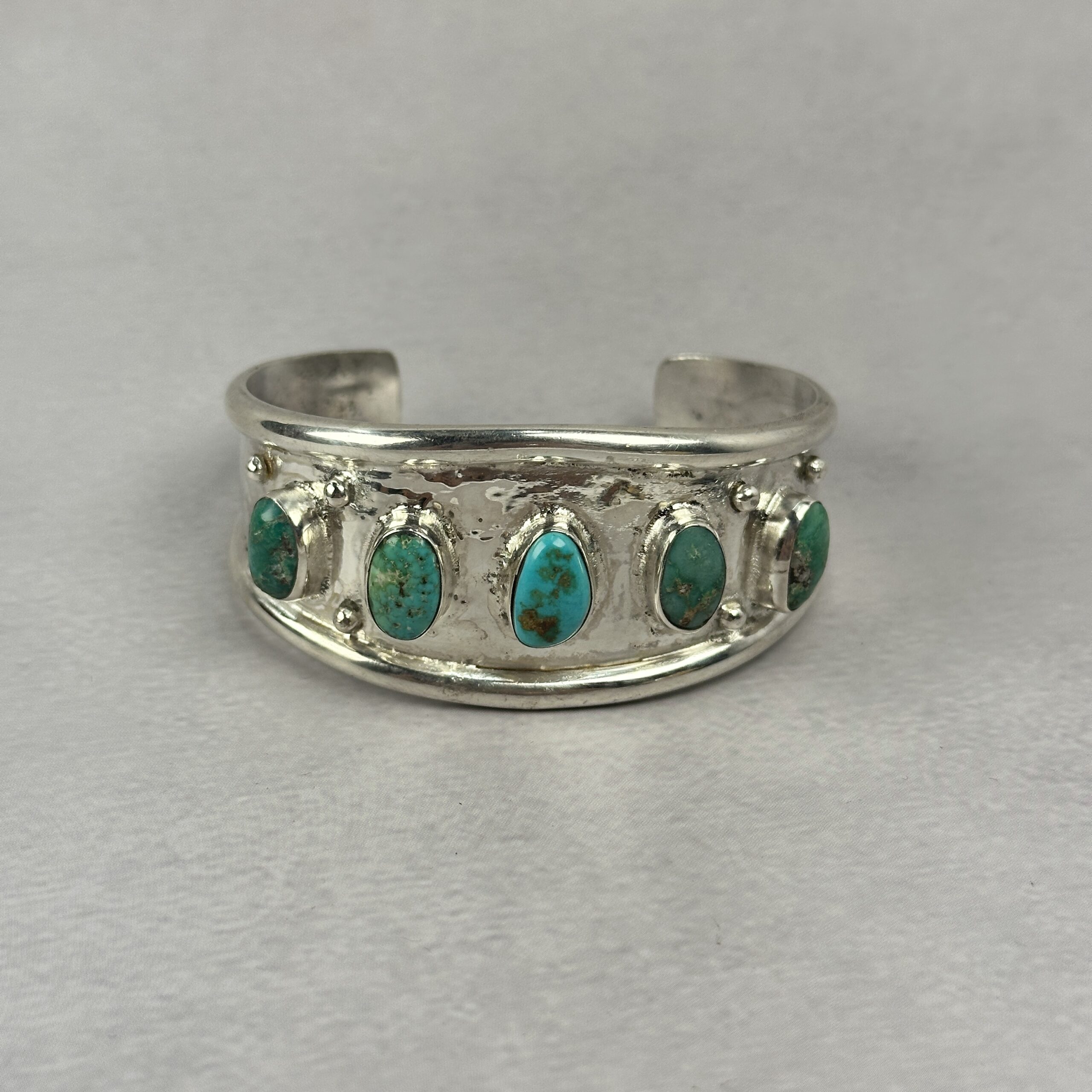 This bold, solid sterling silver cuff features five natural Kingman turquoise stones set flush into a wide, hand-formed band. Each oval stone displays unique matrix and color variation, ranging from vibrant sky blue to deeper green tones—hallmarks of genuine Kingman turquoise.