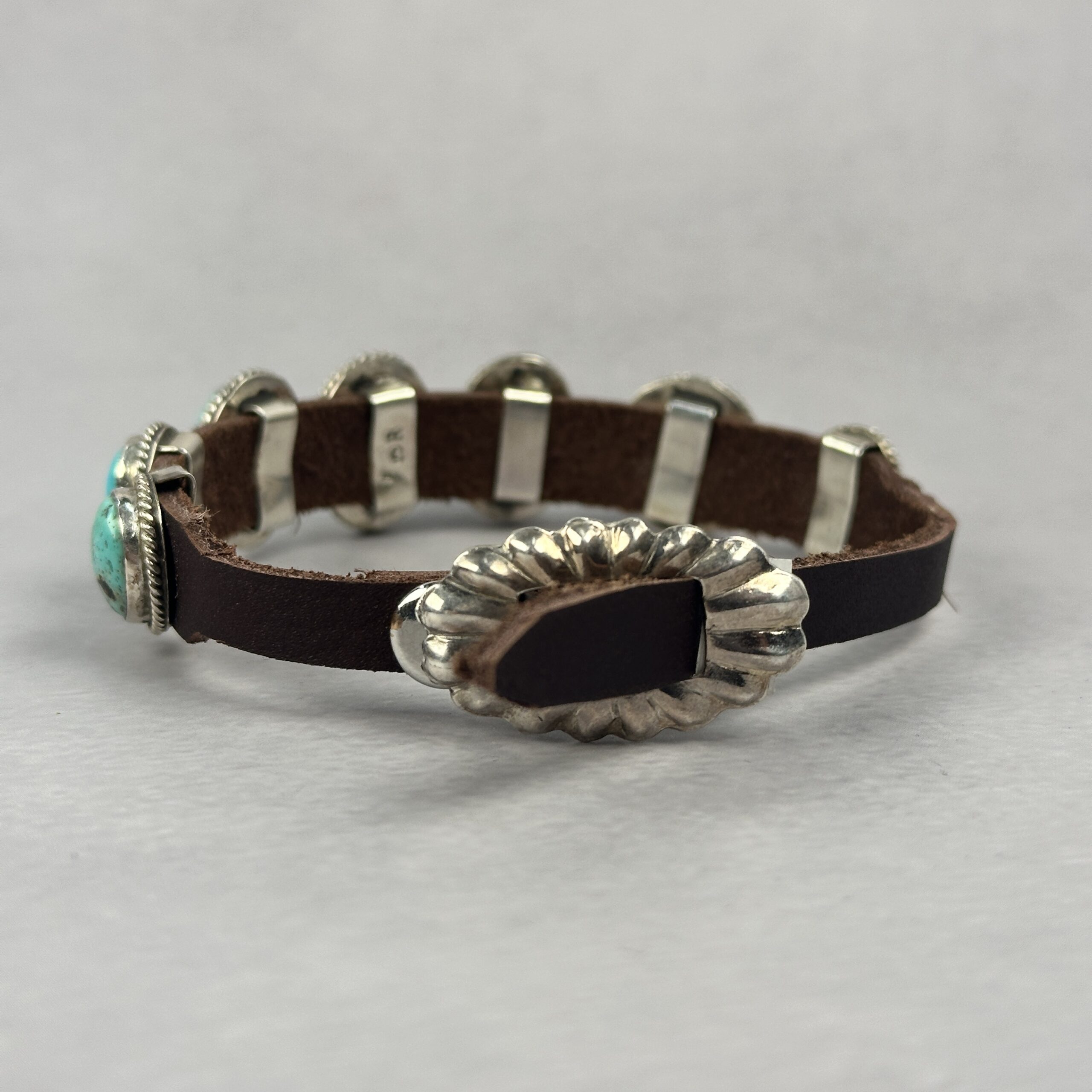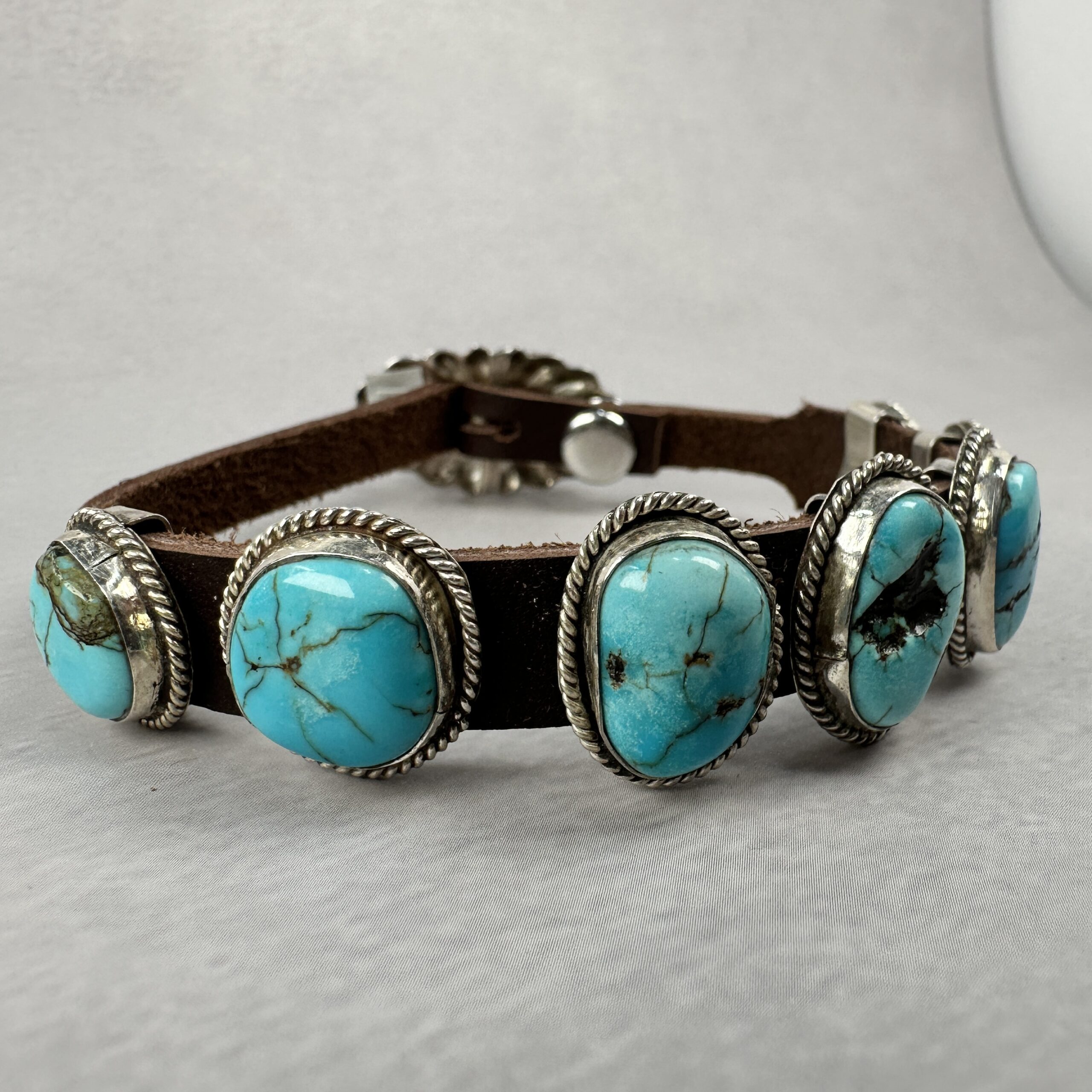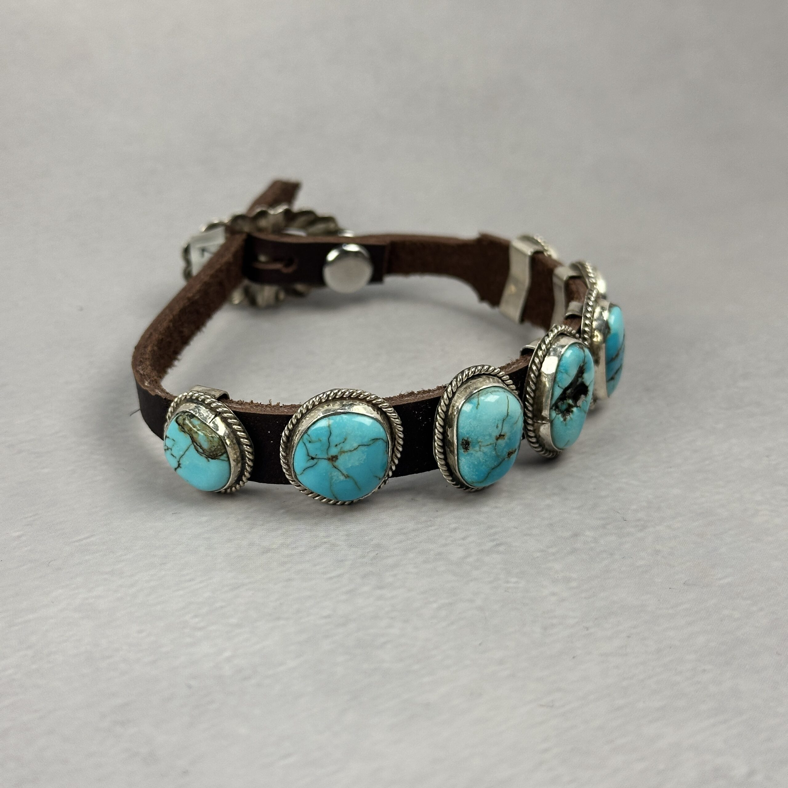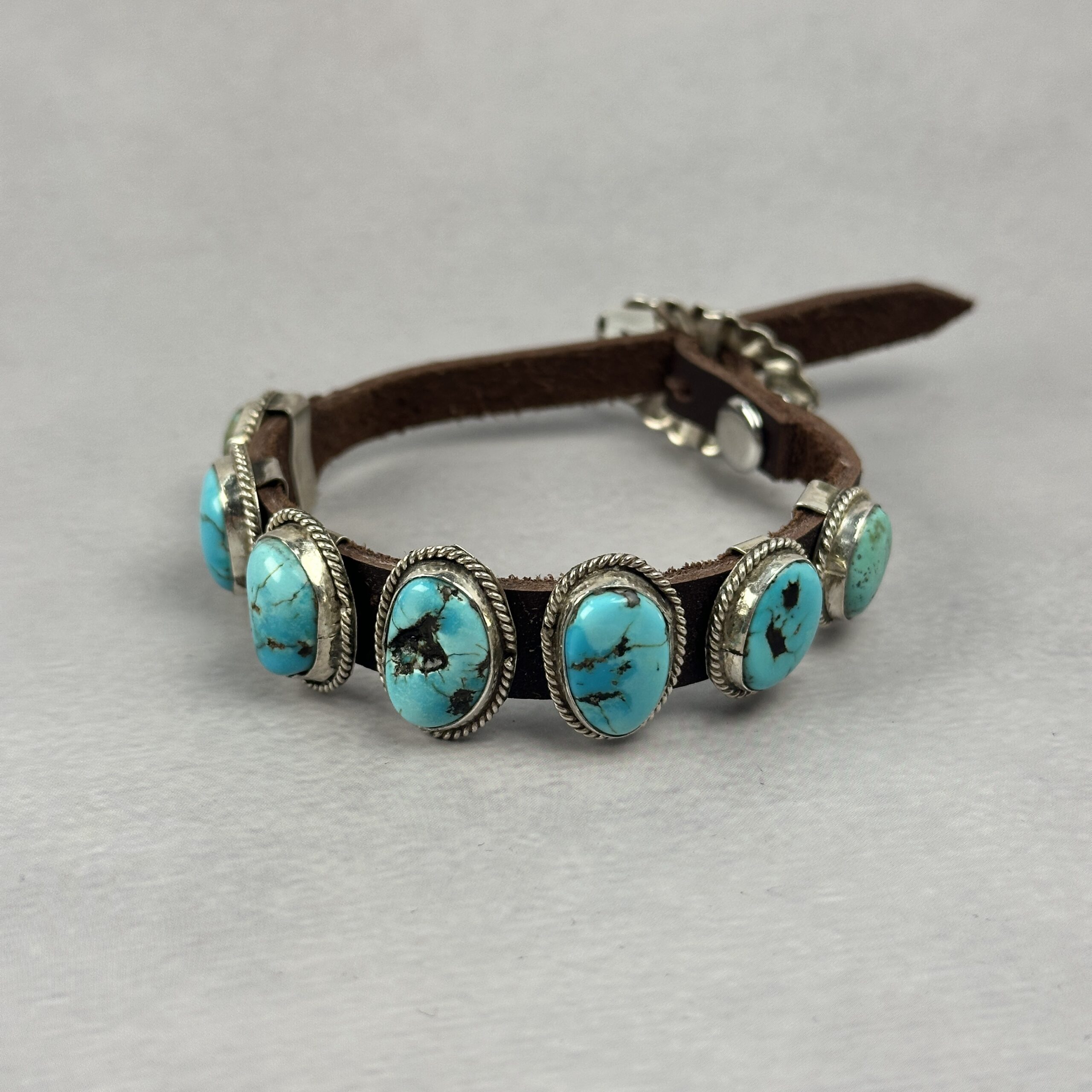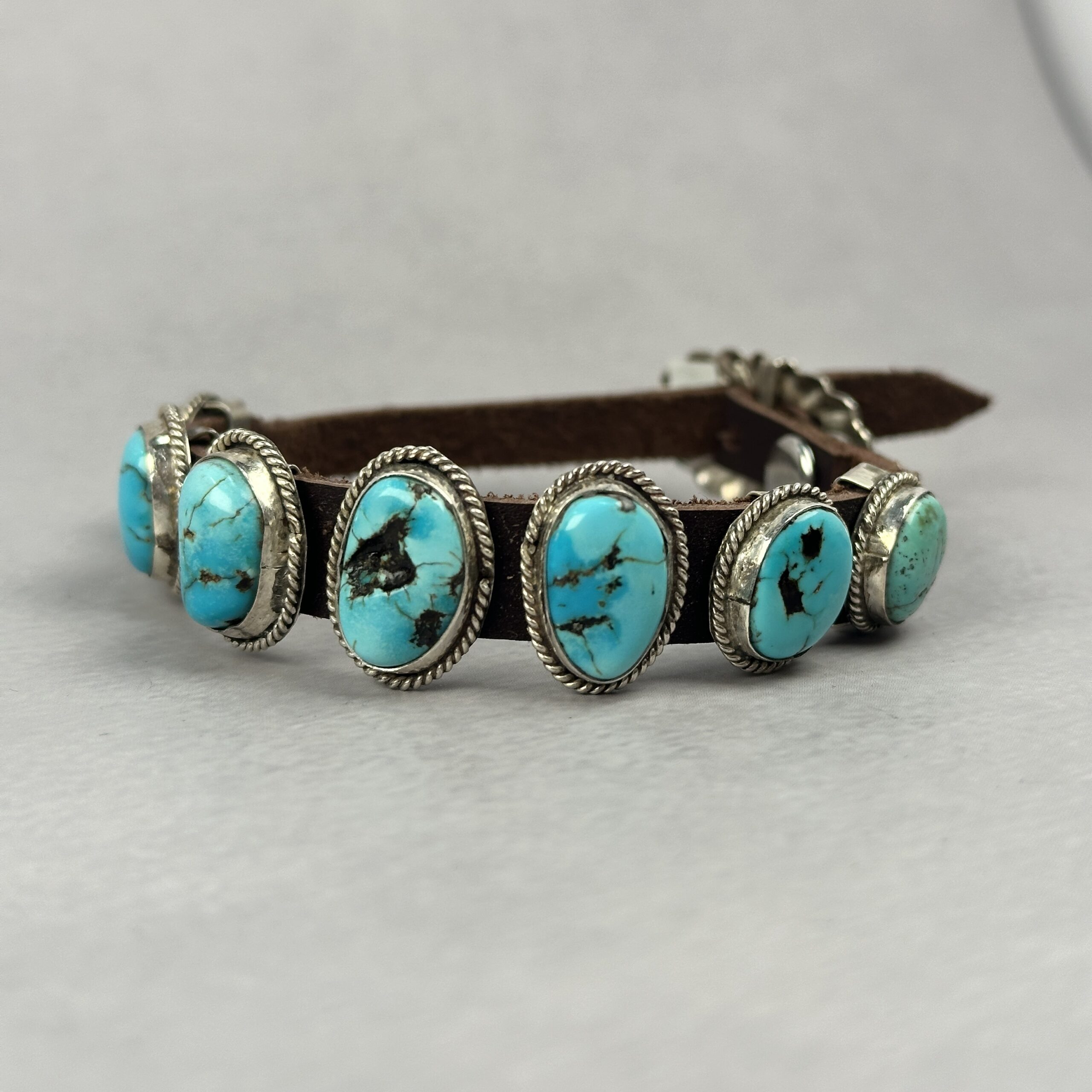 The stones are mounted along a genuine leather strap, secured with traditional silver hardware and a button-style closure. The contrast between polished turquoise, oxidized silver, and natural leather creates a rugged yet refined look that wears effortlessly on its own or stacked.