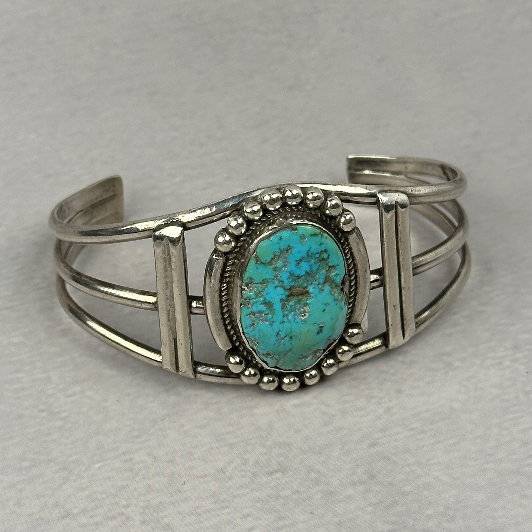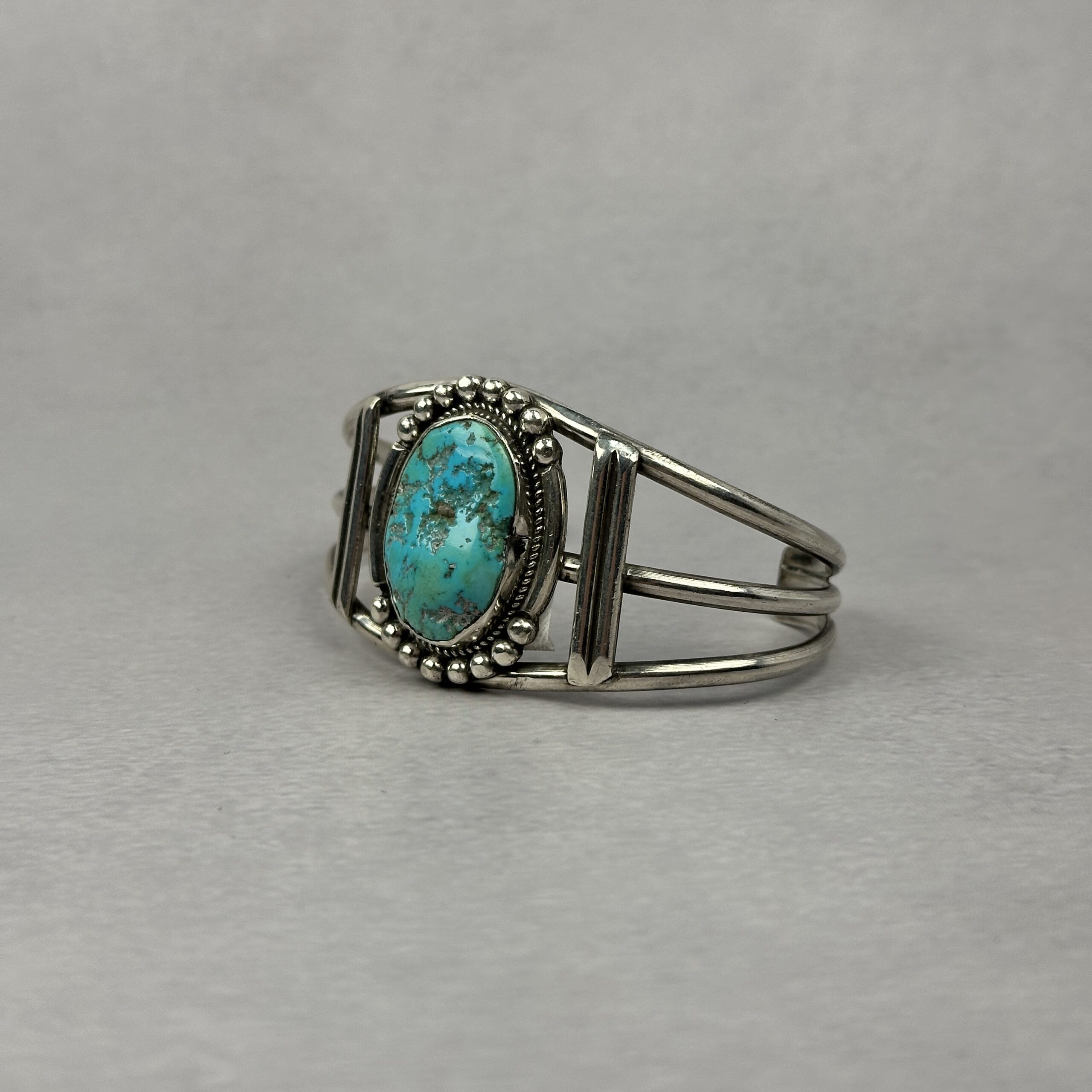 This Navajo-made, unknown artist cuff features a natural Kingman turquoise stone set in solid .925 sterling silver. The stone displays classic Kingman characteristics—vibrant blue-green tones with scattered dark matrix, giving it an earthy, natural contrast that collectors look for.
