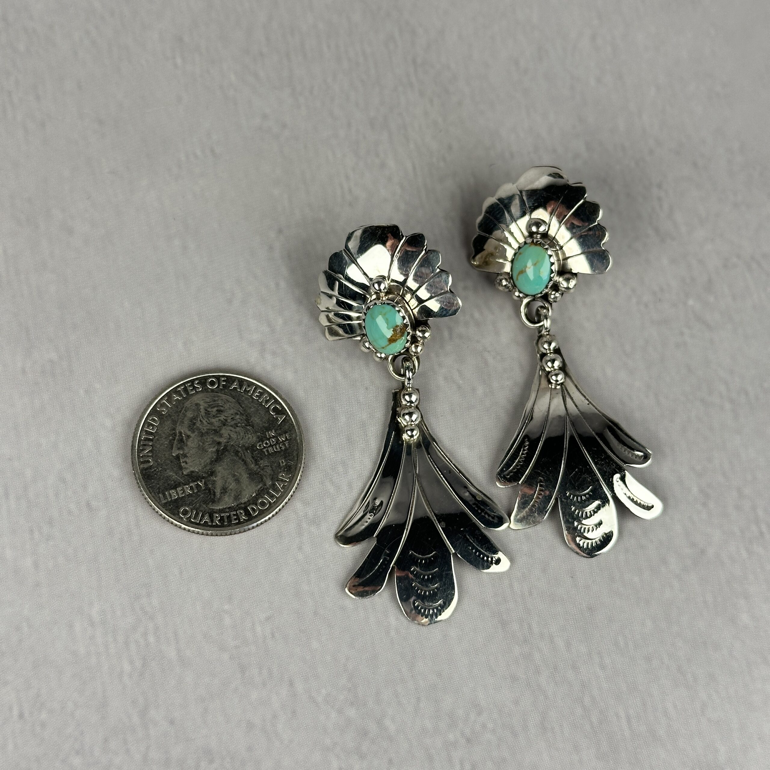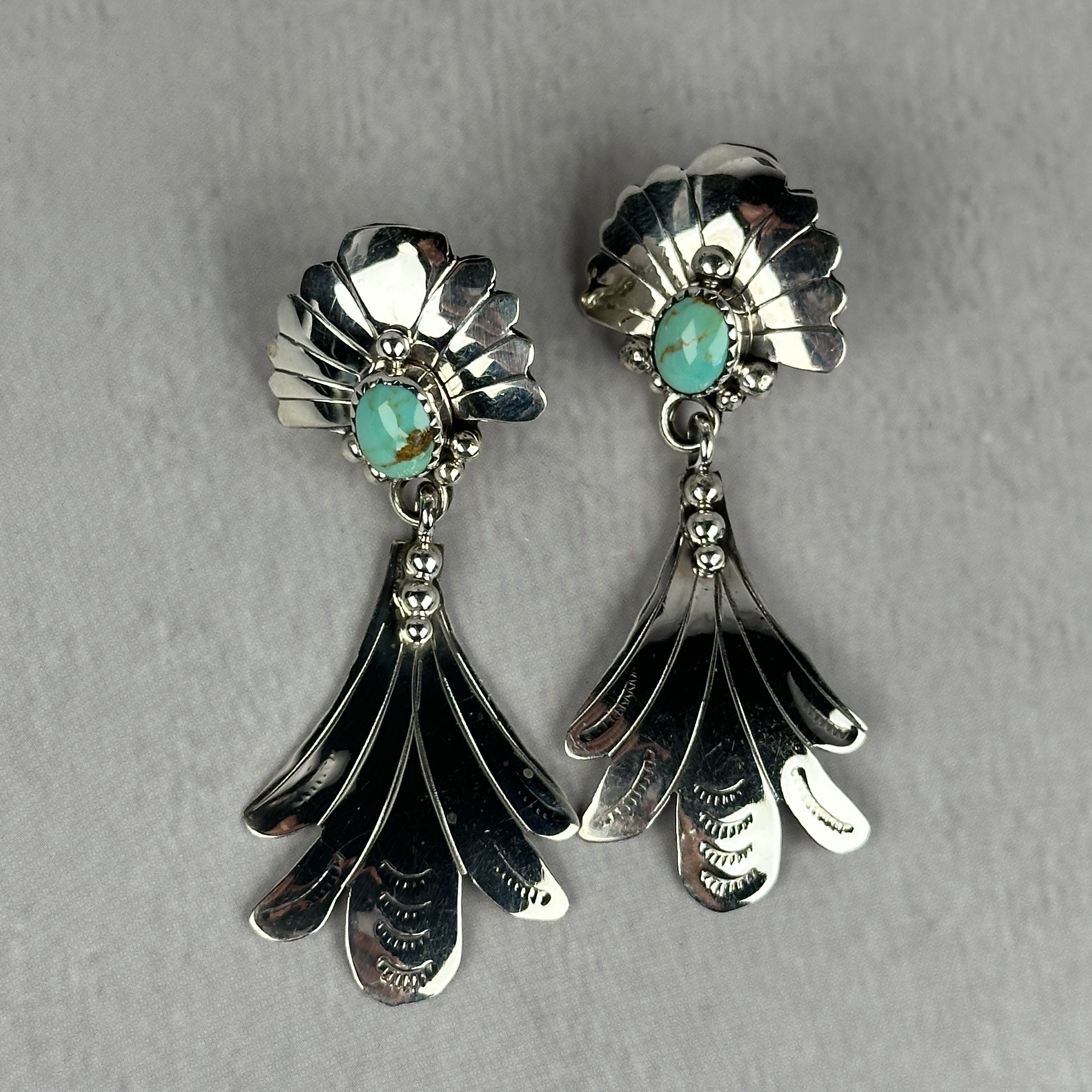 These Navajo made feather earrings are crafted from solid sterling silver and accented with turquoise stones. The feather design symbolizes protection and connection to spirit in Native American culture. Hand-stamped and polished silver details add depth and texture. The dangle style creates elegant movement when worn. A powerful and beautifully crafted example of authentic Native American jewelry.