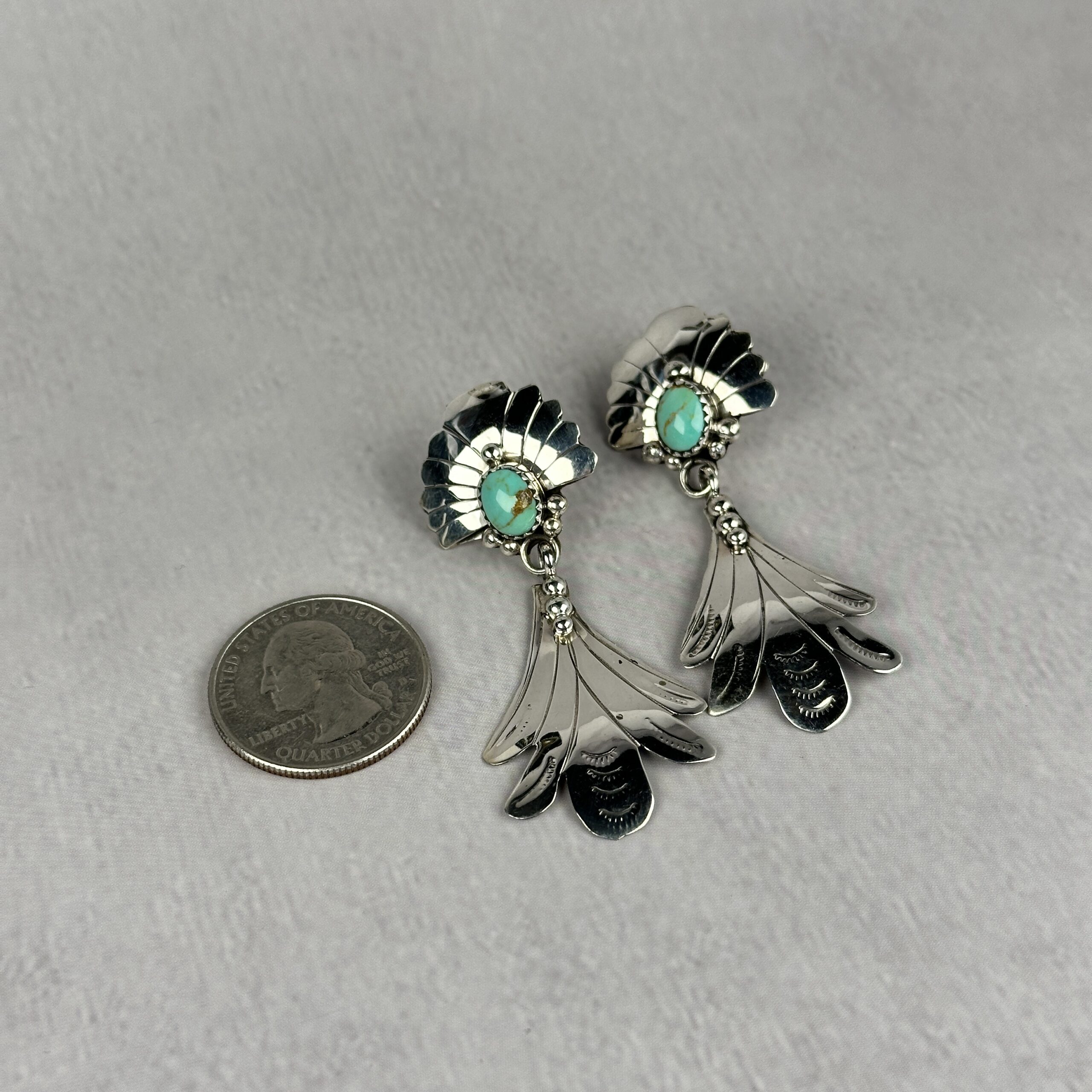 Sterling silver feather earrings with turquoise accents, Navajo made and full of movement.