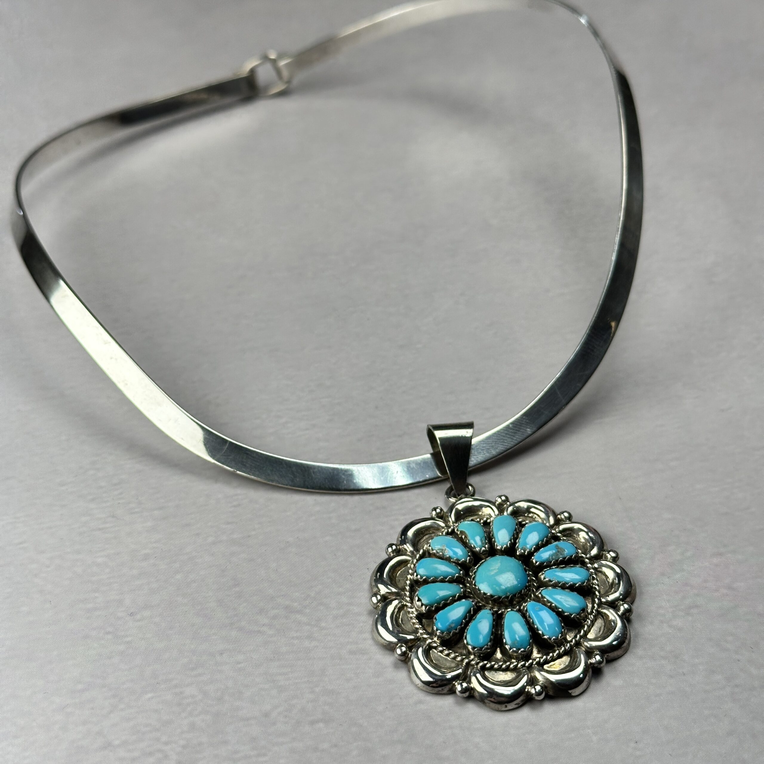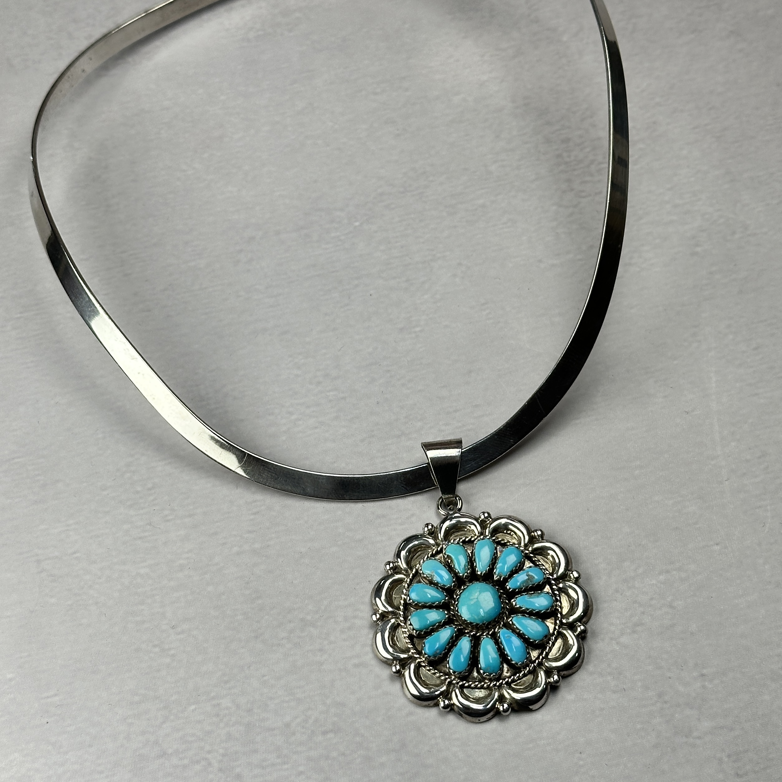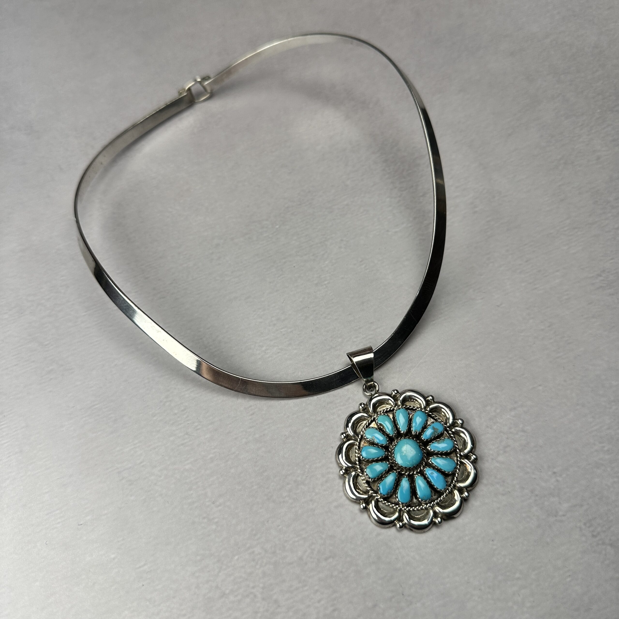Zuni-made sterling silver necklace featuring a traditional petit point turquoise cluster pendant on a solid silver choker necklace (included).