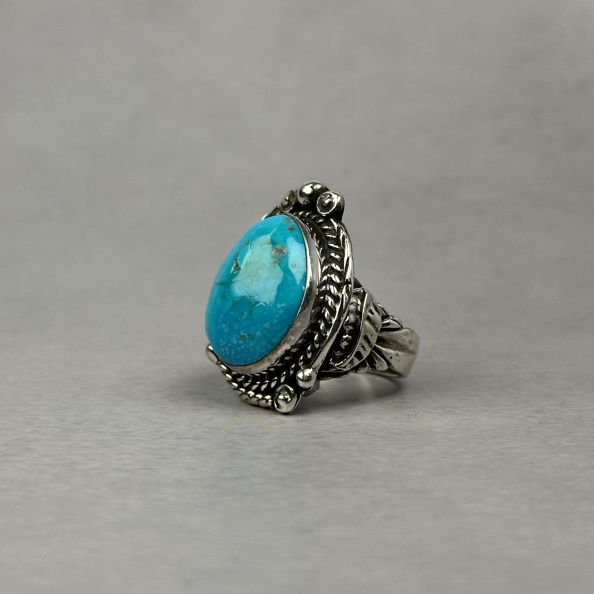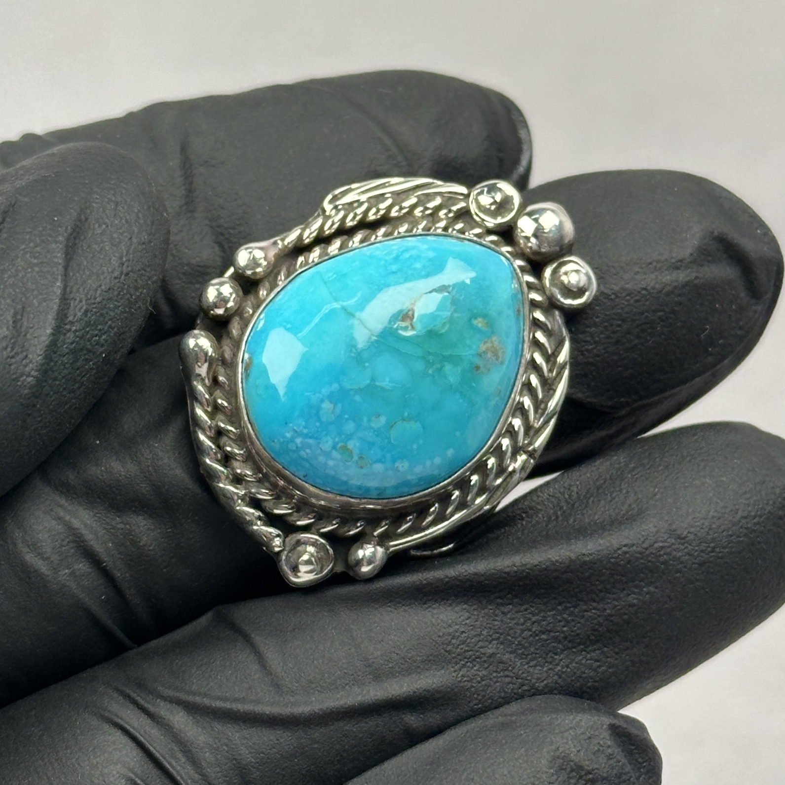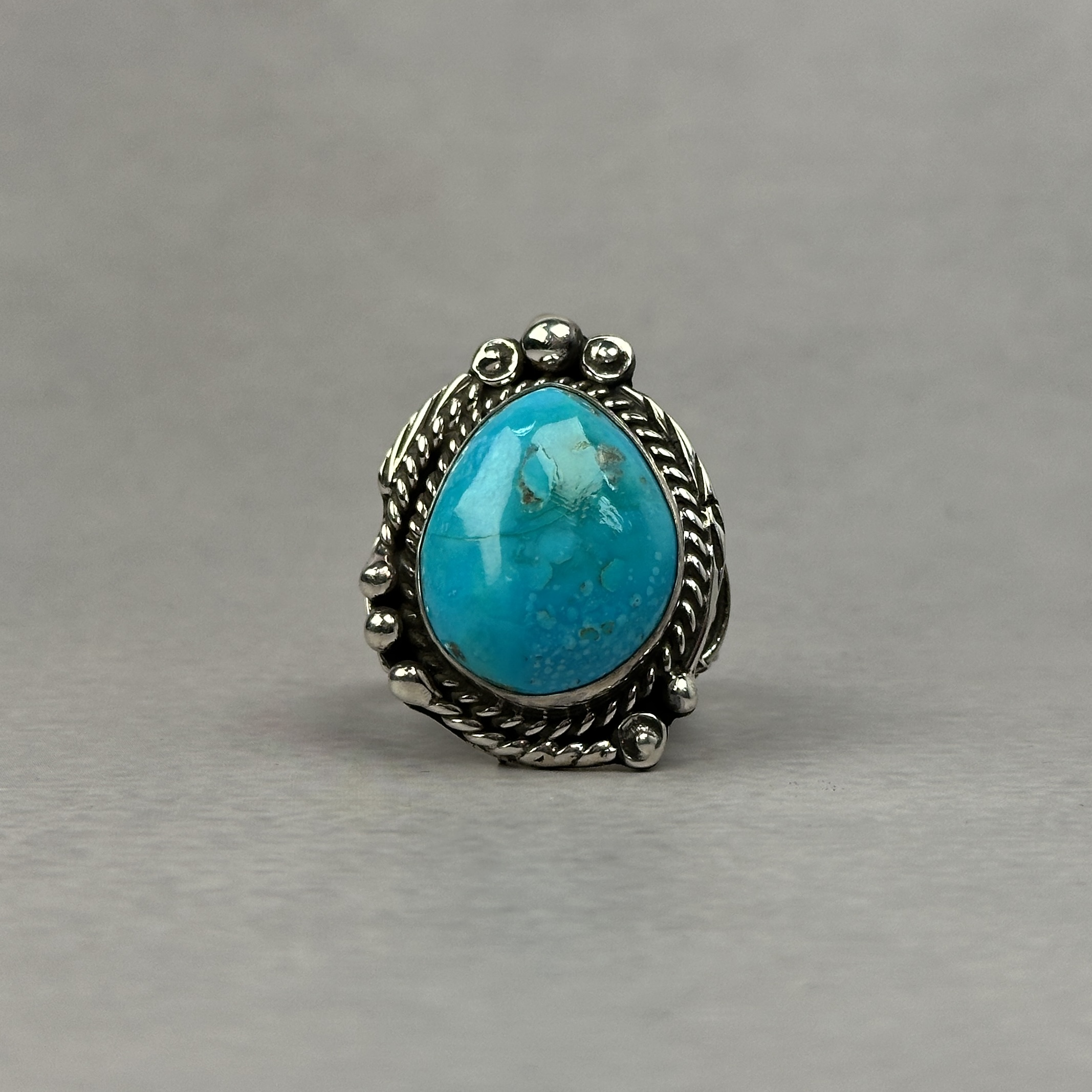 The turquoise is set in .925 sterling silver with traditional Navajo rope detailing and hand-applied silver accents around the bezel. The craftsmanship is bold but balanced, built to showcase the stone first while keeping the silver work intentional and clean.