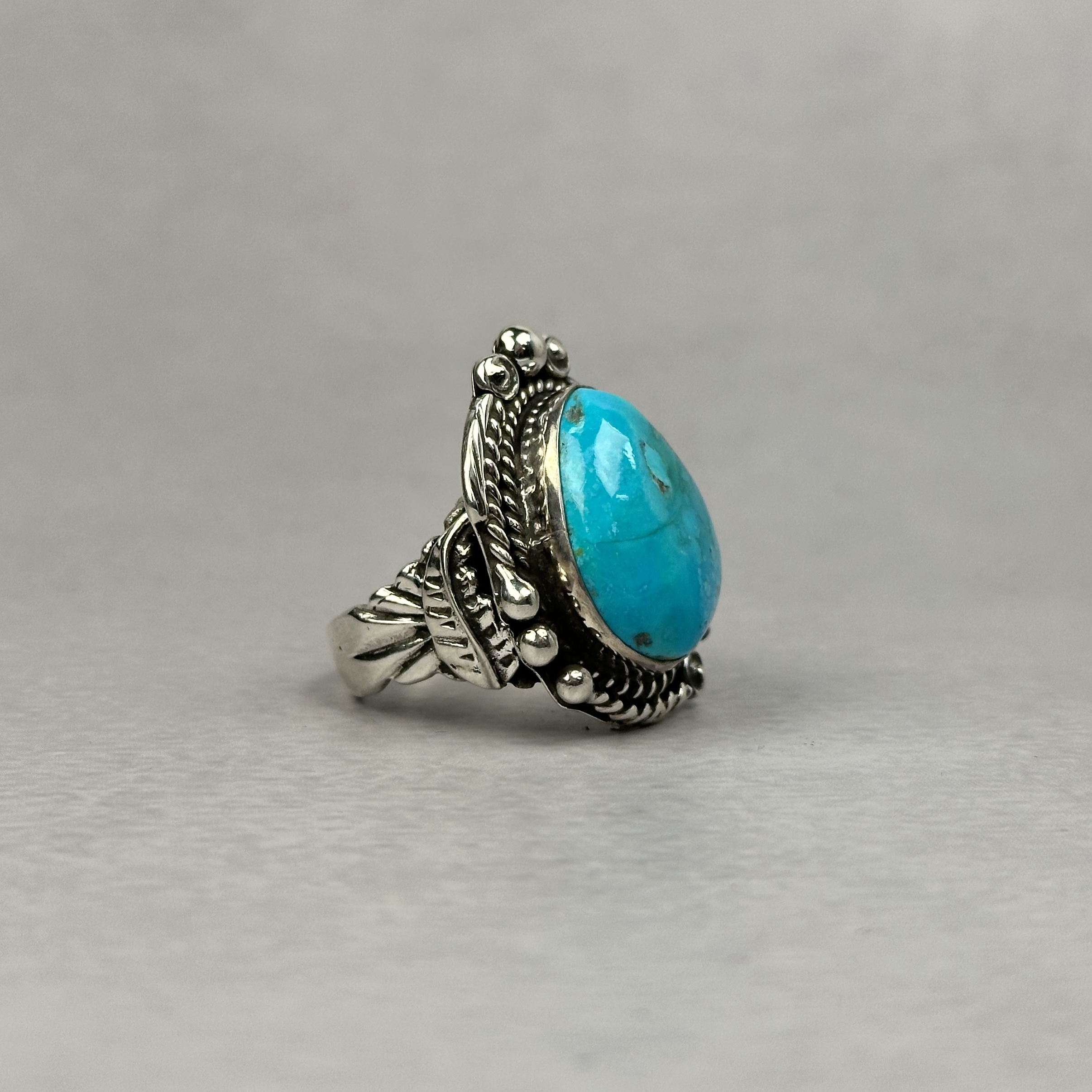 Solid Navajo-made sterling silver ring featuring a genuine Kingman turquoise cabochon.