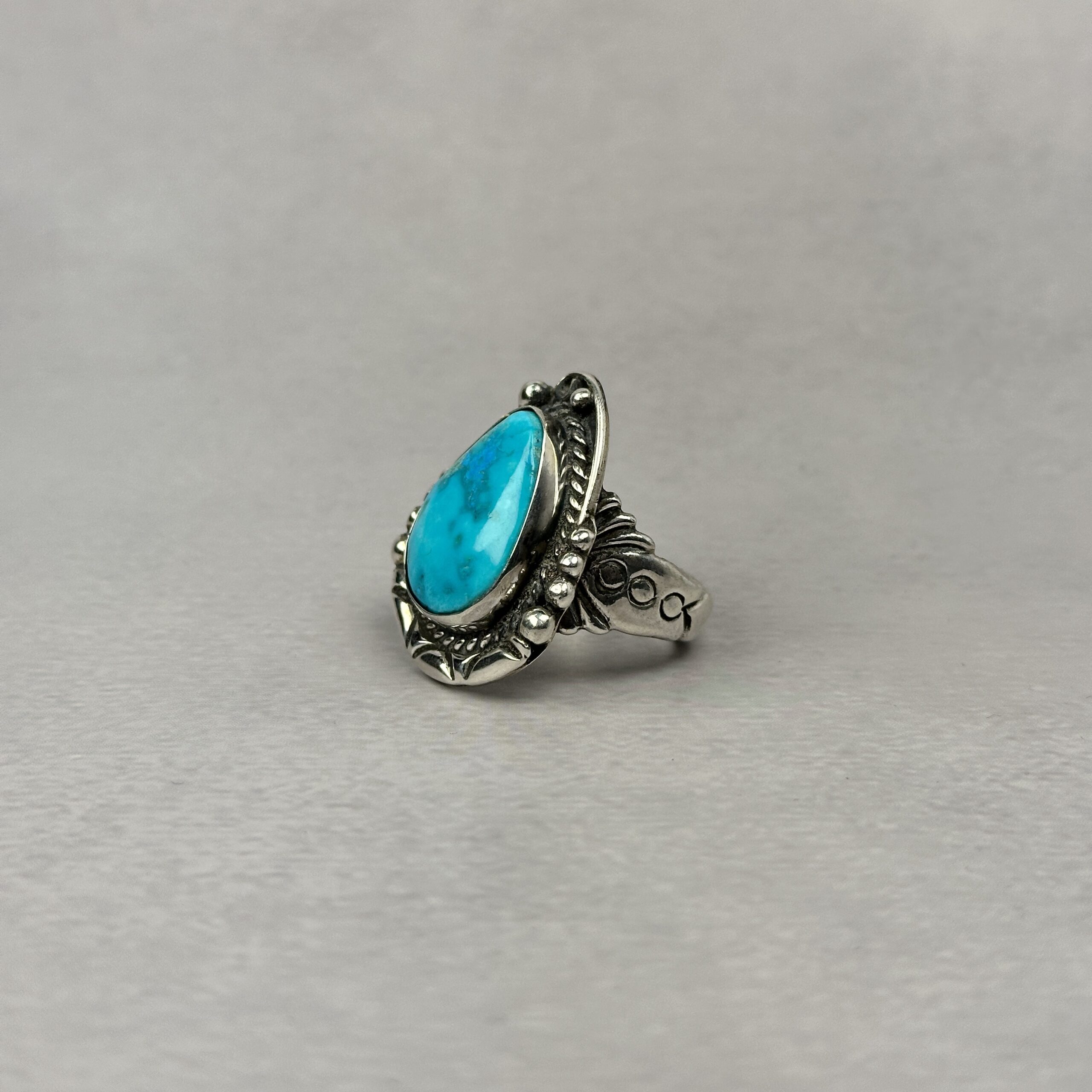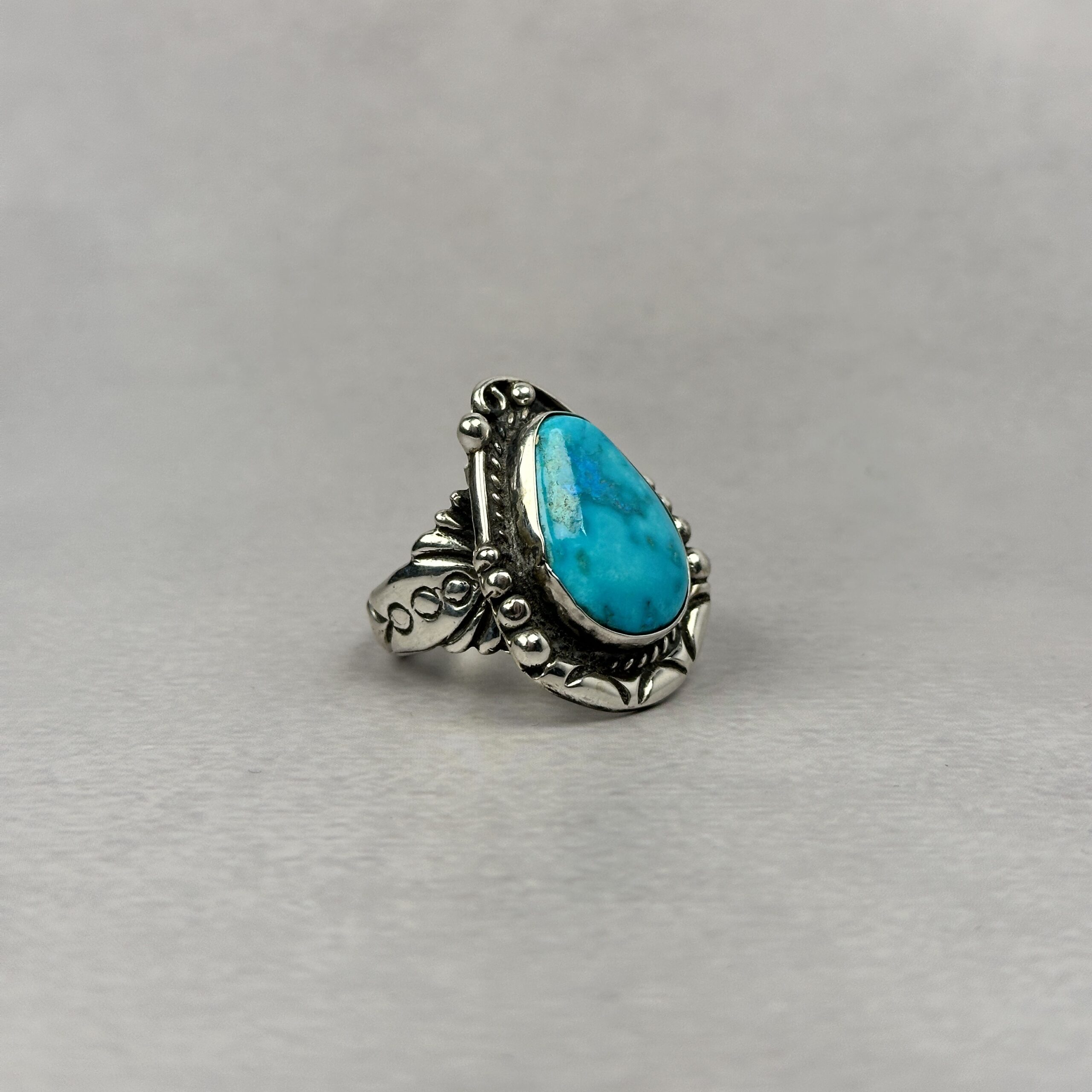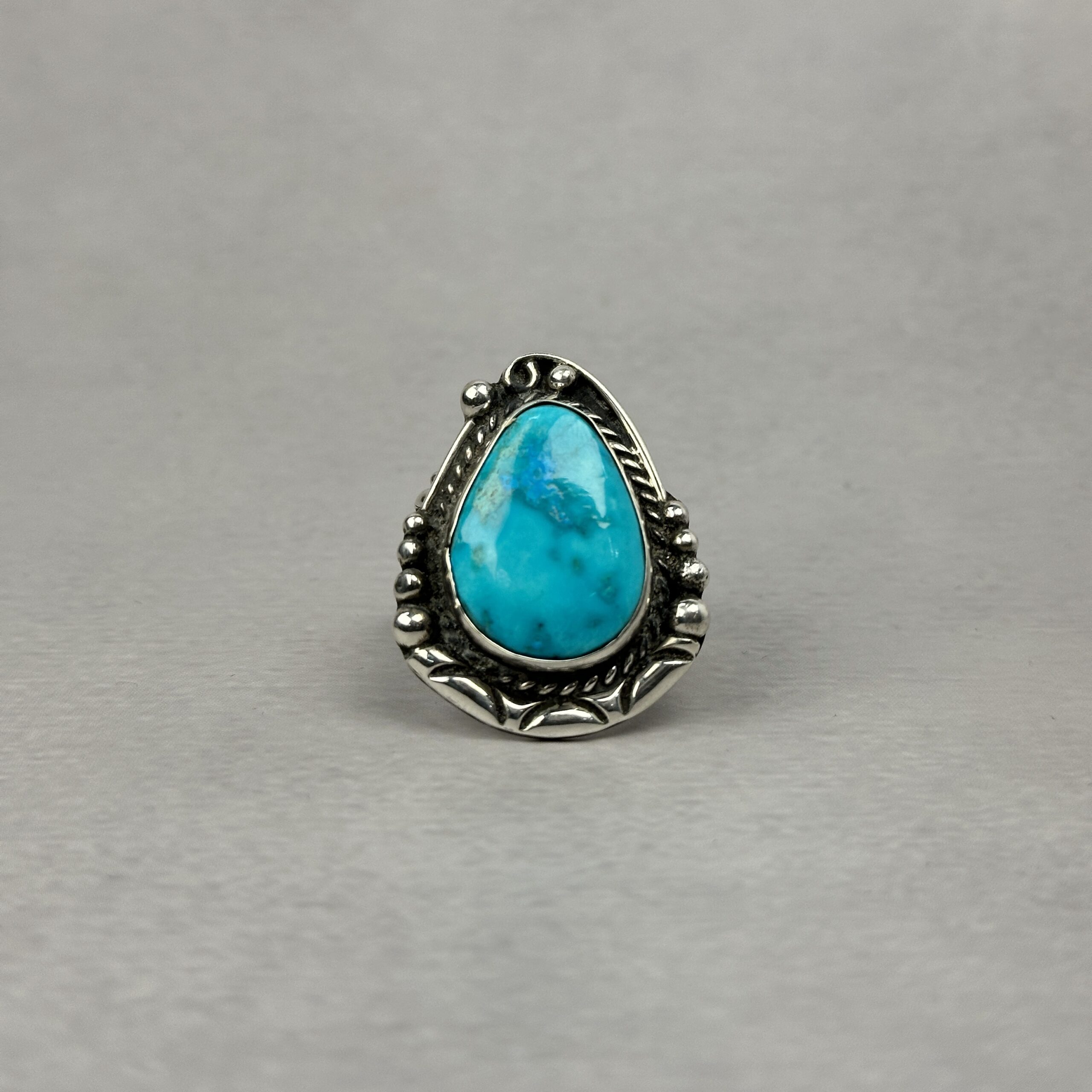 The stone is cut in a freeform teardrop shape and framed with traditional Navajo silverwork, including hand-applied beadwork and twisted wire detailing. The silver has been intentionally oxidized to bring depth and contrast, allowing the turquoise to remain the focal point.