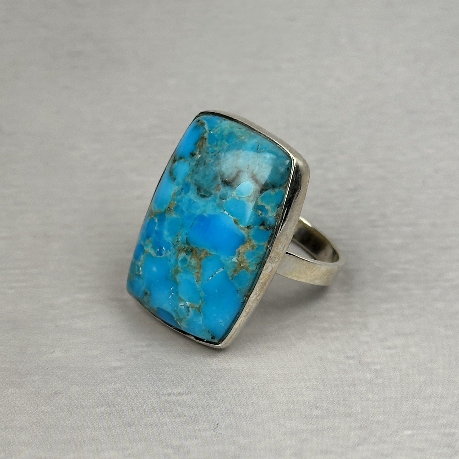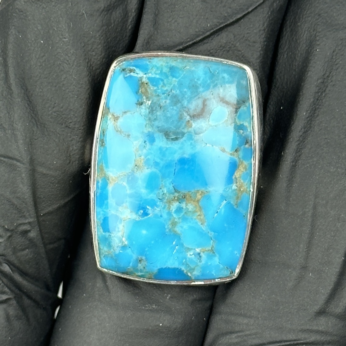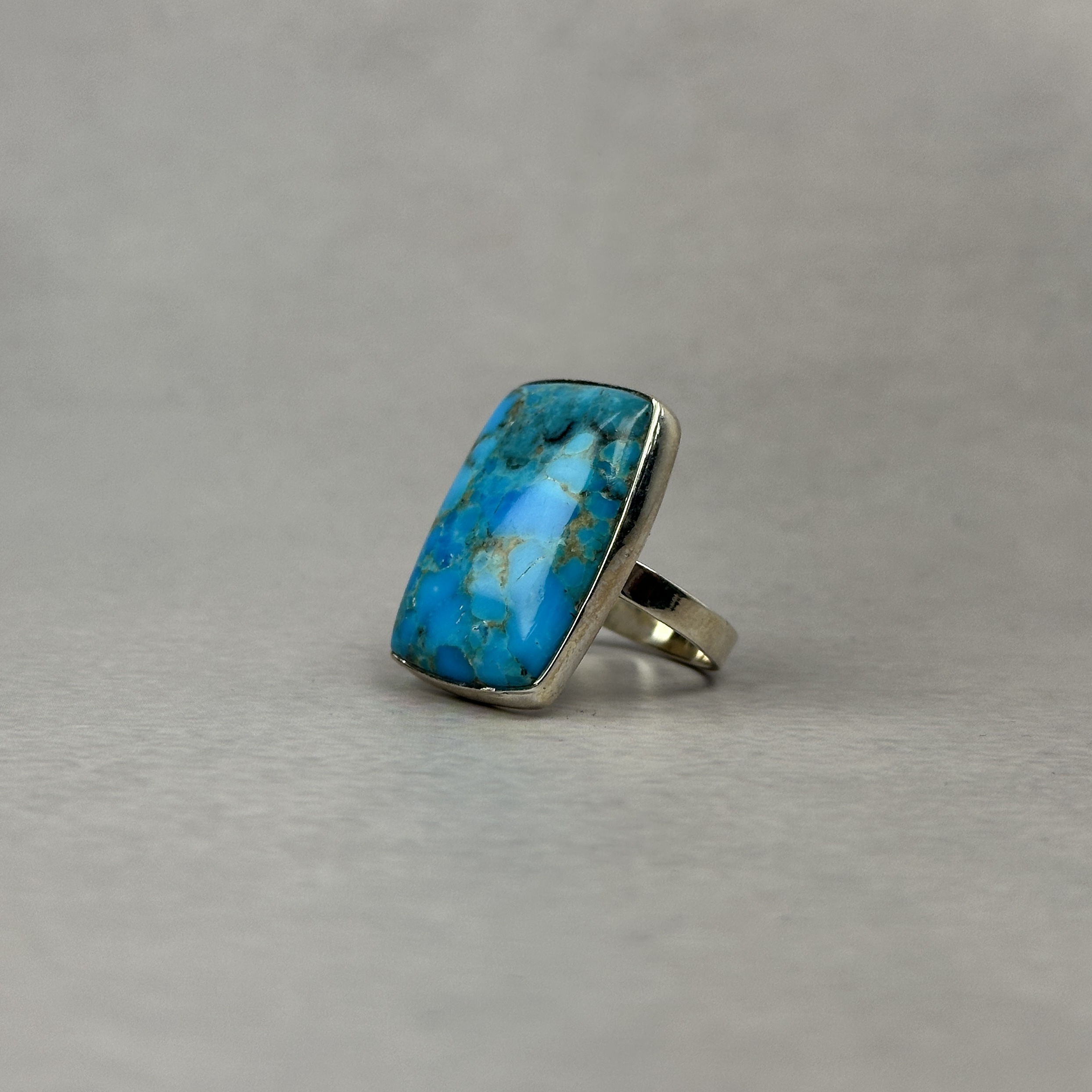 This ring features a bold rectangular Kingman turquoise cabochon set in solid .925 sterling silver. The stone shows classic Kingman characteristics—bright blue tones with natural matrix running throughout, giving it depth and a rugged, organic look collectors appreciate.