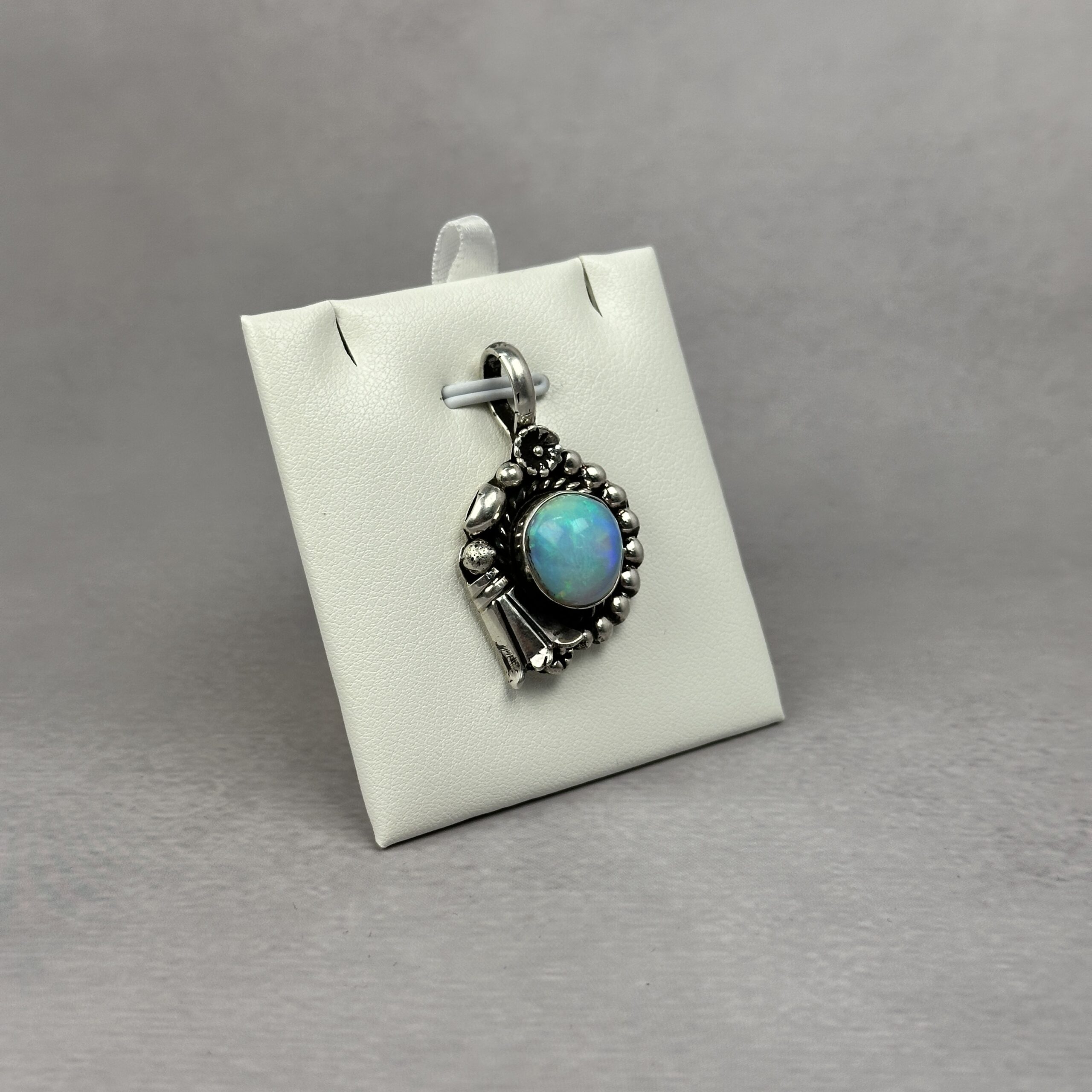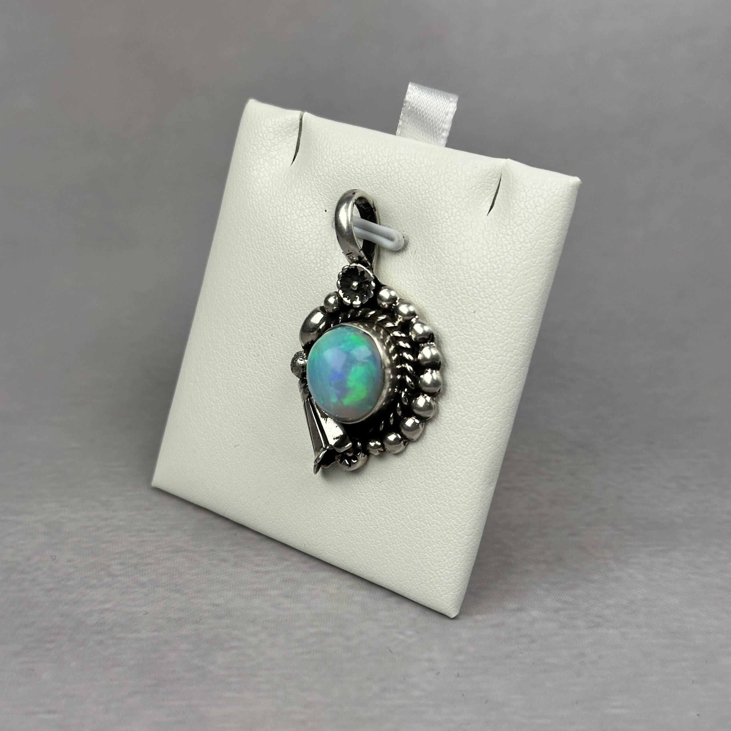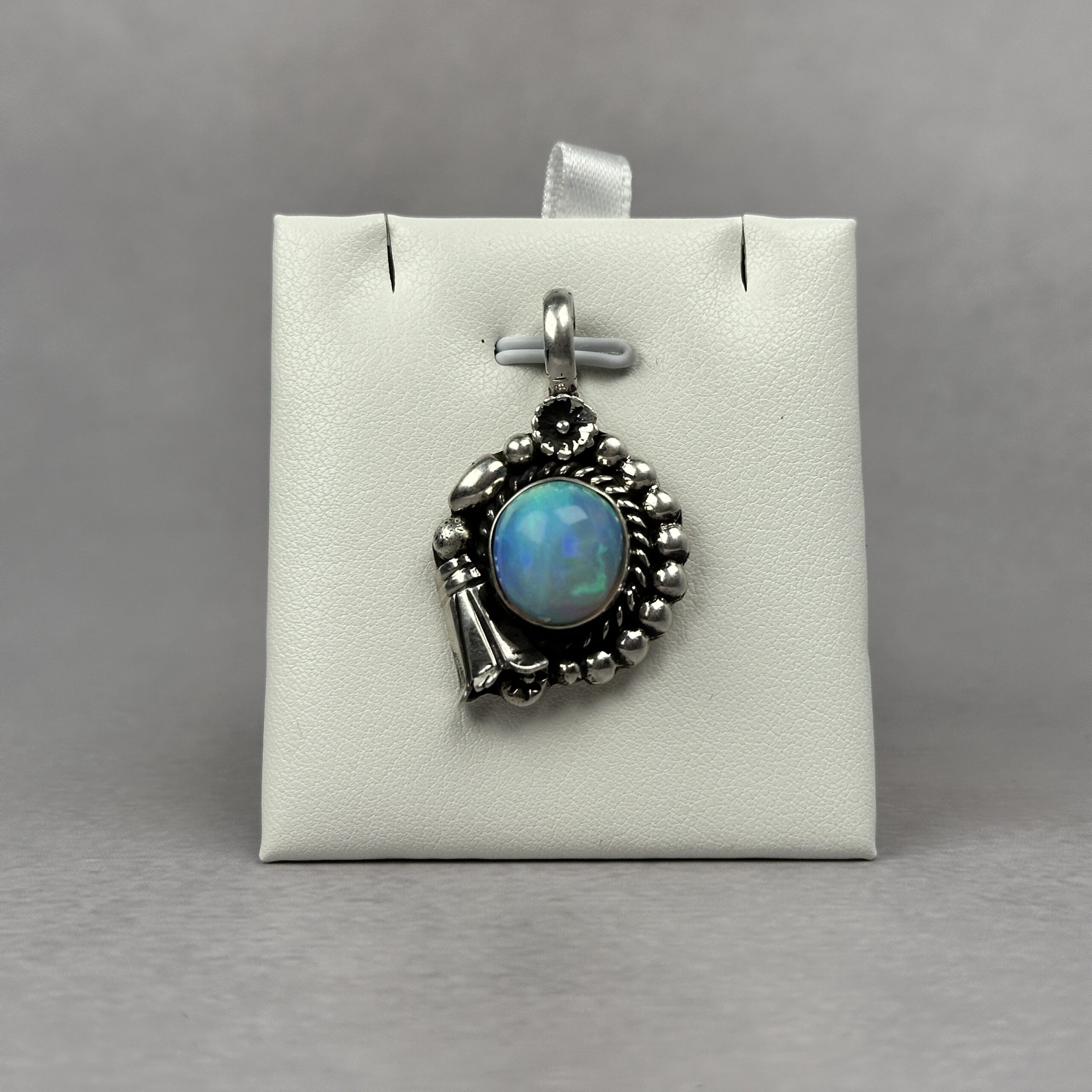 Ethiopian opal is celebrated for its vibrant, ever-changing play-of-color—alive with flashes of green, blue, and fire that shift with movement and light. The use of Ethiopian opal in traditional Navajo jewelry is extremely uncommon, making pendants like this highly collectible and increasingly hard to find.