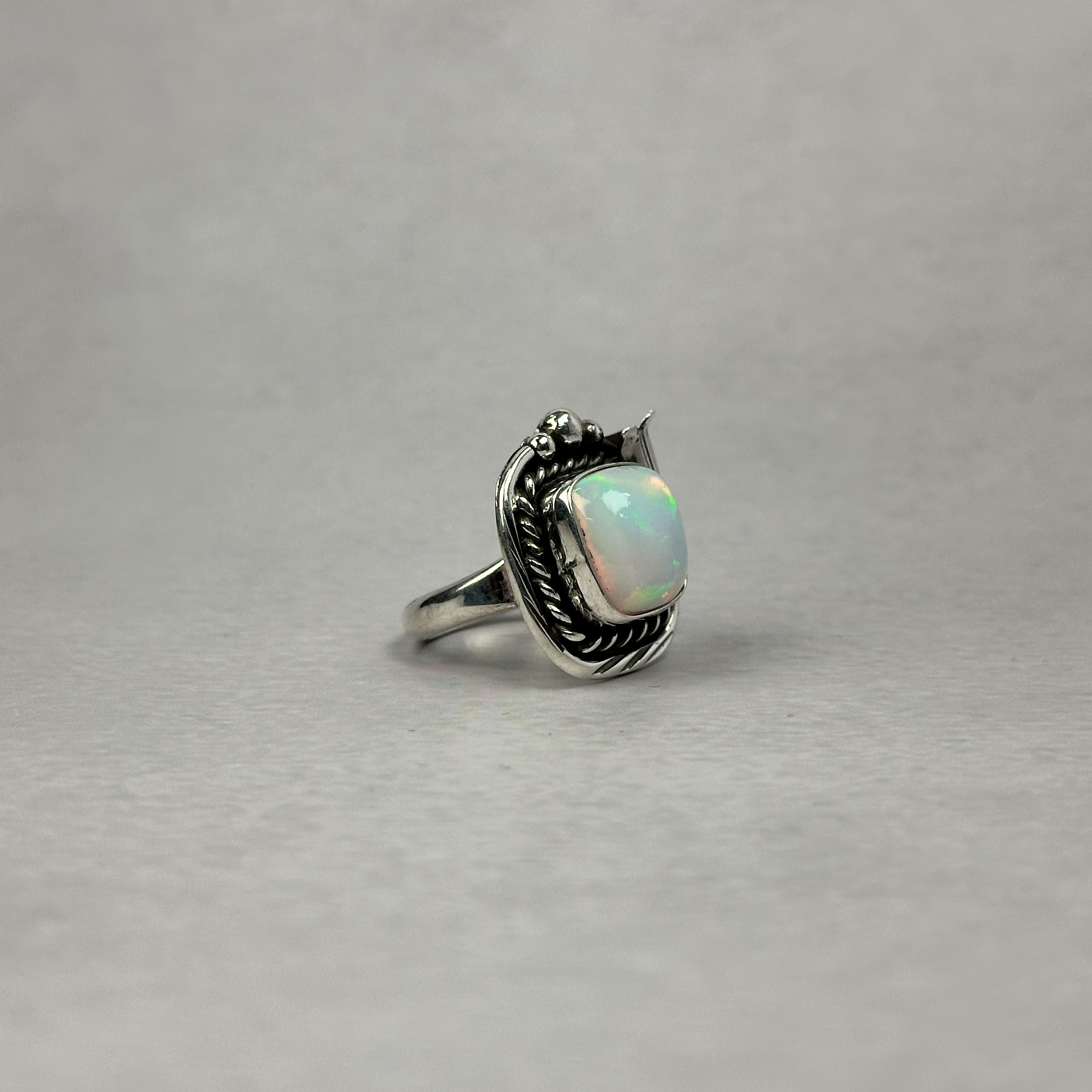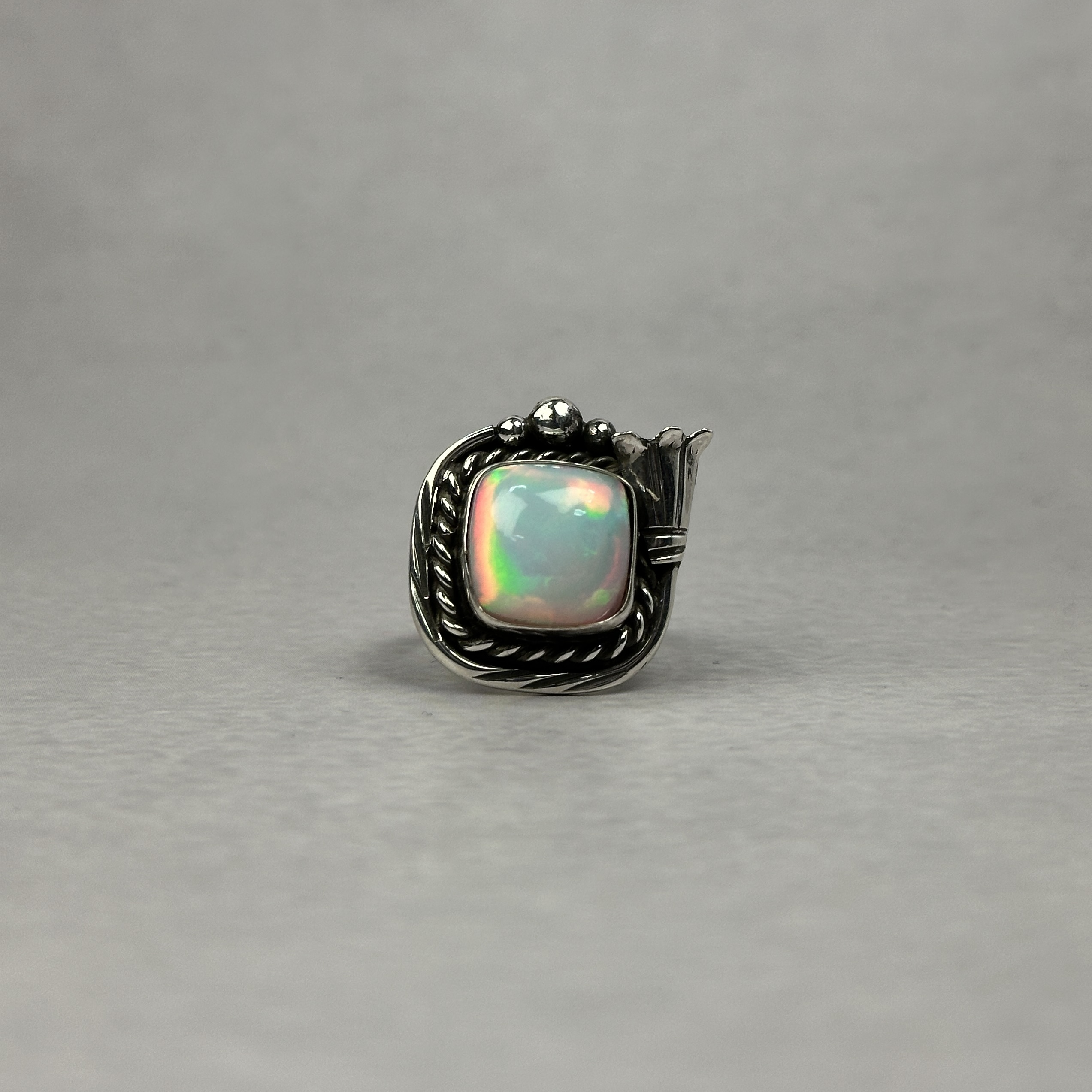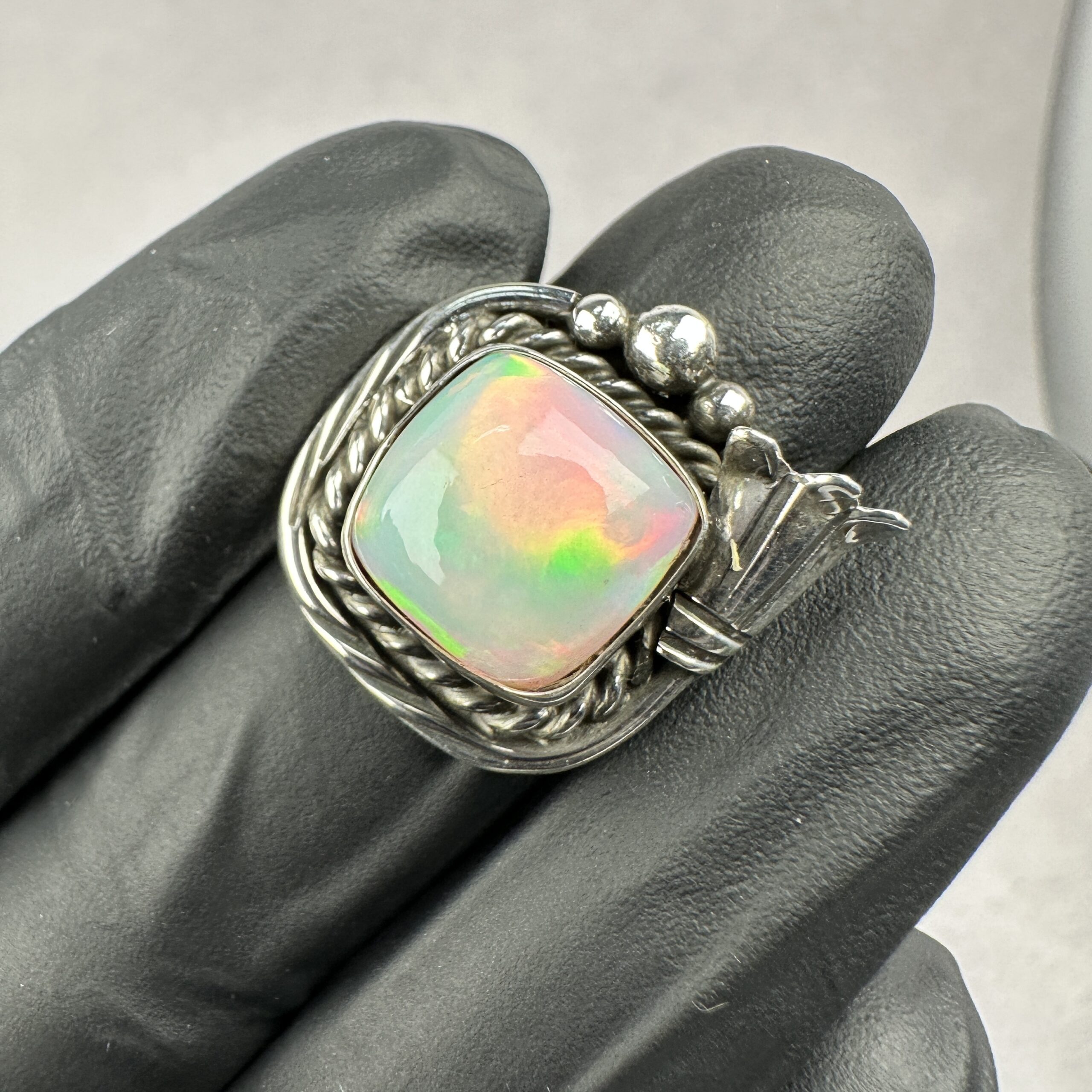 Ethiopian opal is prized for its intense, living play-of-color—flashes of green, blue, fire, and iridescence that shift beautifully with light and movement. While Ethiopian opal itself is highly sought after, it is exceptionally rare to find it set in traditional Navajo silverwork, making rings like this extremely difficult to source.