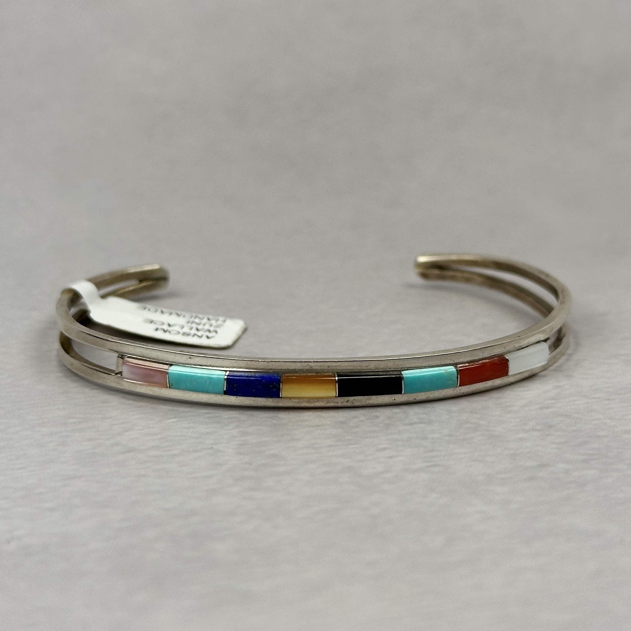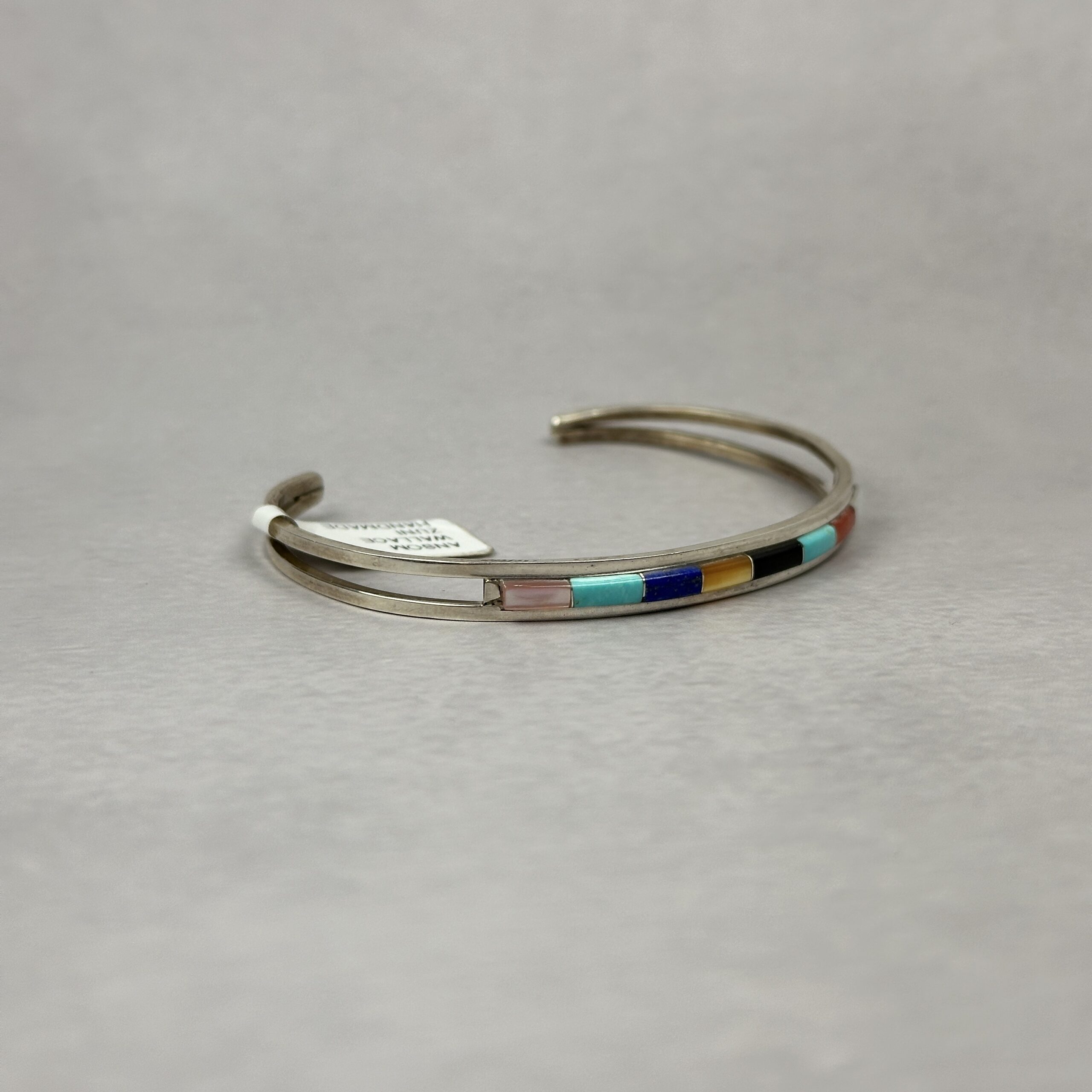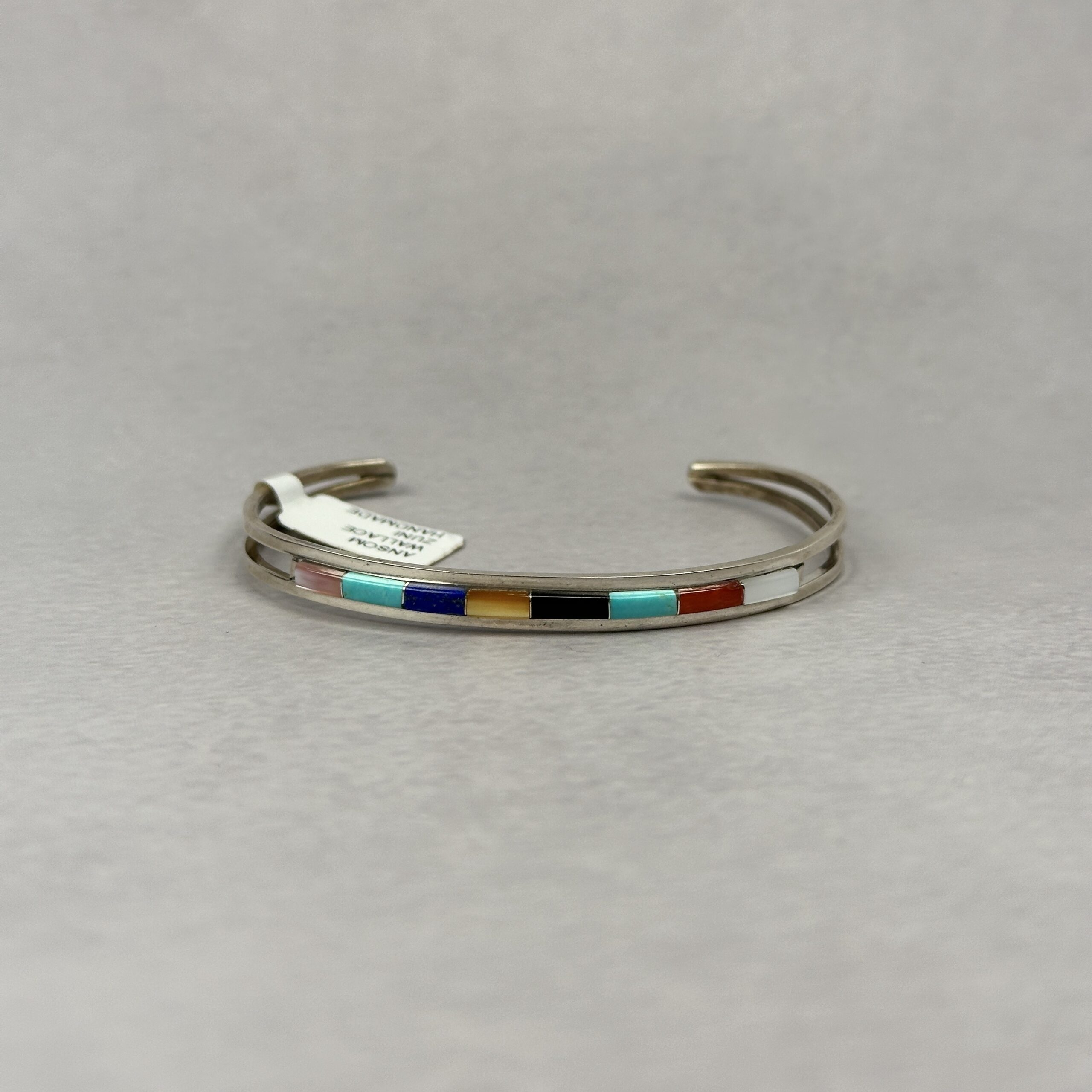 Zuni made multi stone inlay cuff in .925 sterling silver. Slim, lightweight, and perfect for stacking or everyday wear.