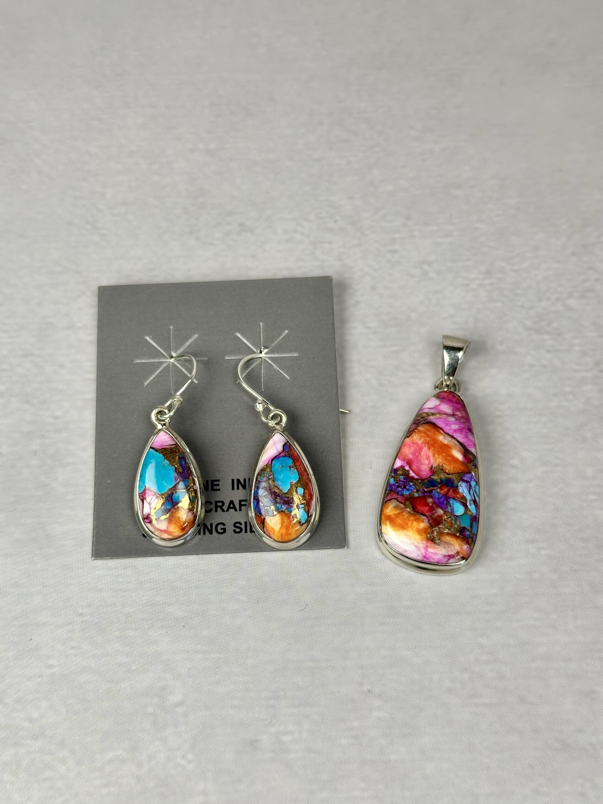 A graceful droplet set combining Spiny Oyster, Copper, and Turquoise — earrings and pendant in .925 silver