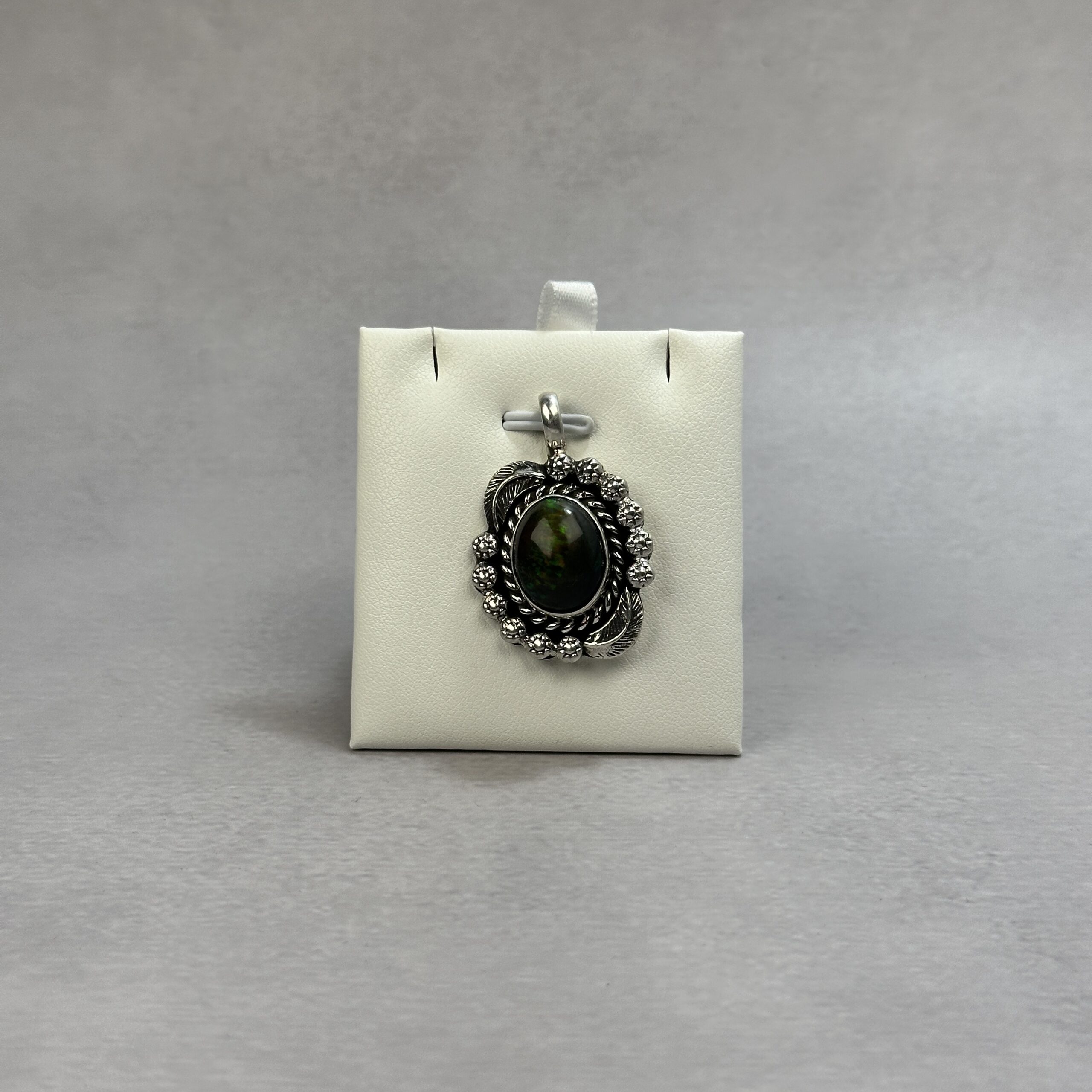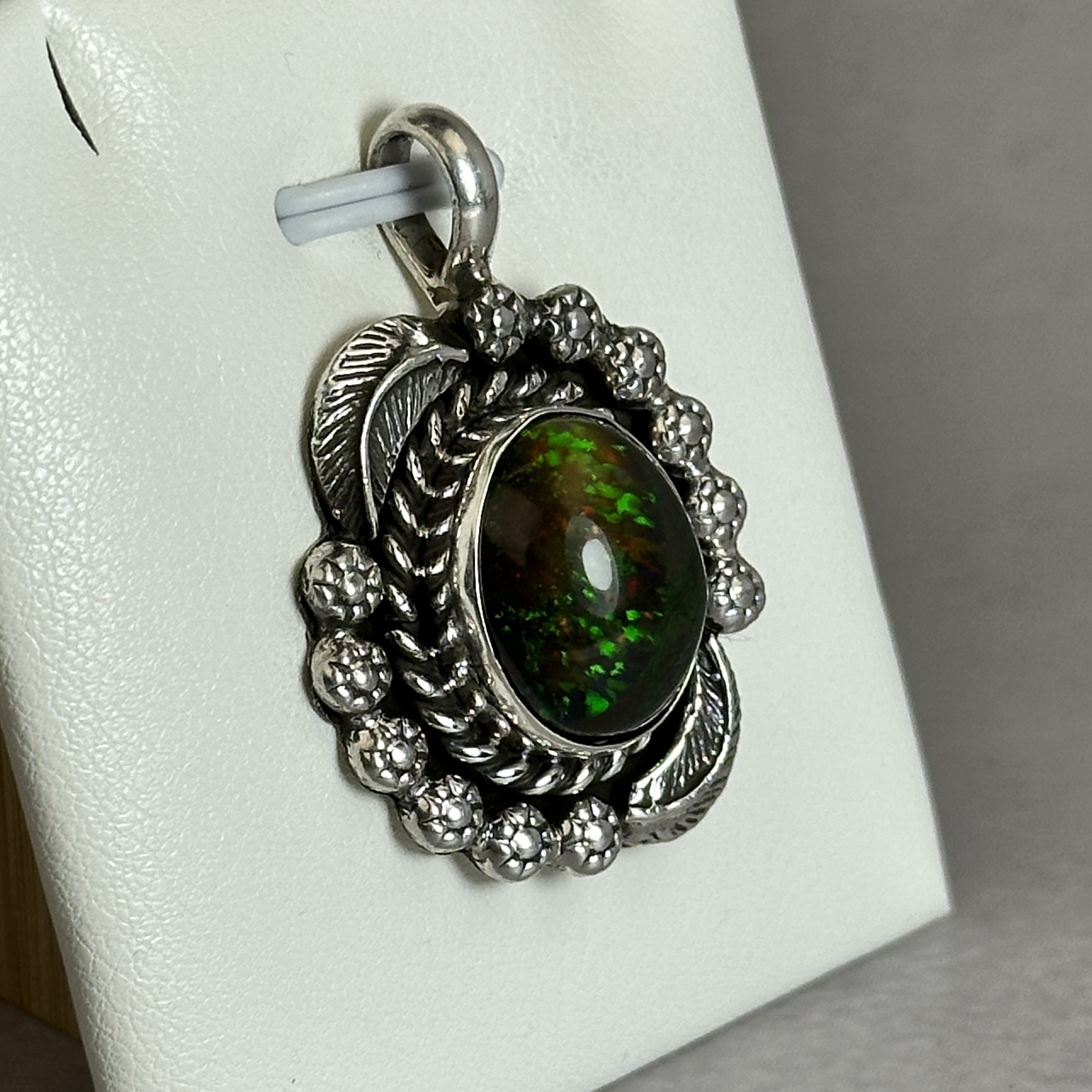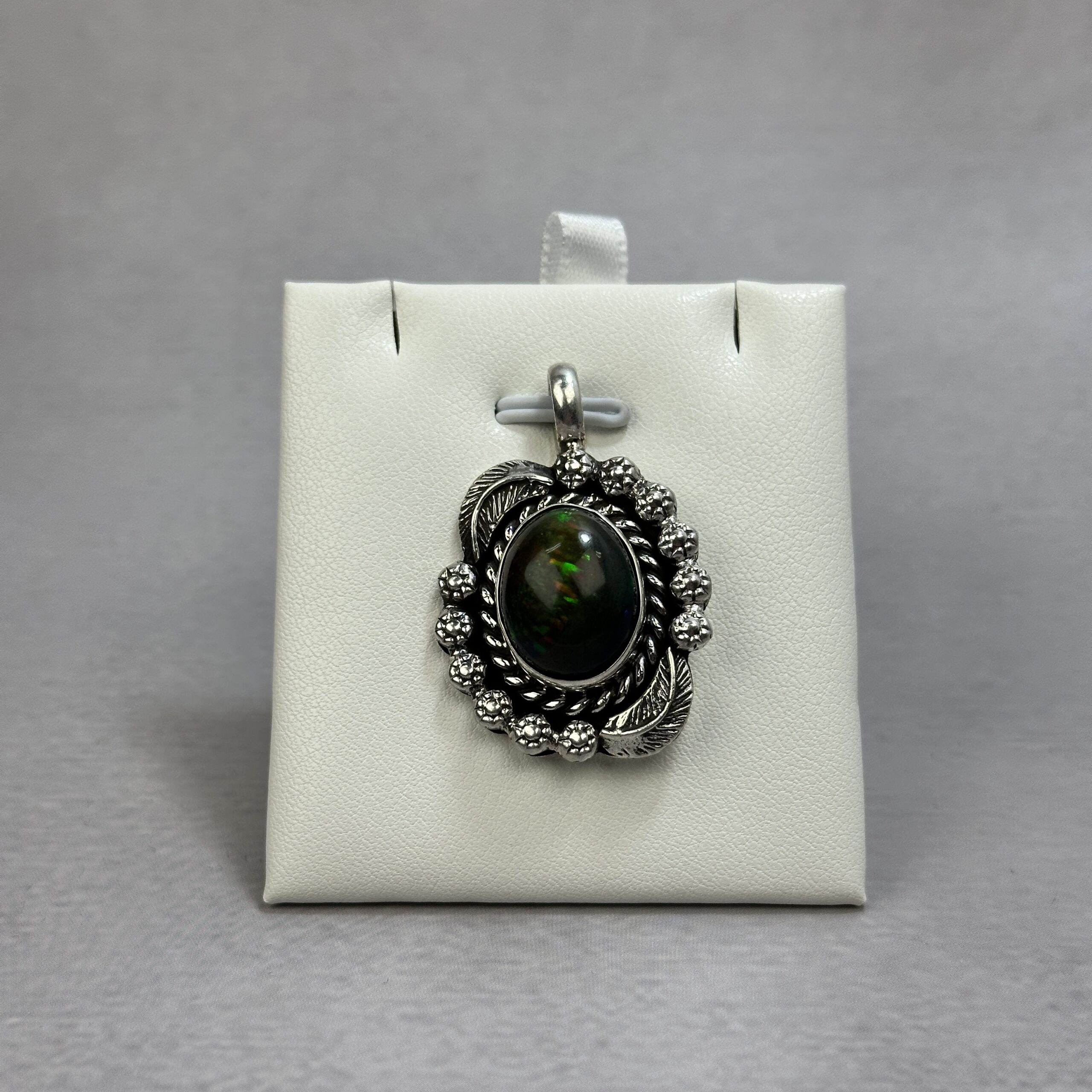Ethiopian opal is celebrated for its vibrant, ever-changing play-of-color—alive with flashes of green, blue, and fire that shift with movement and light. The use of Ethiopian opal in traditional Navajo jewelry is extremely uncommon, making pendants like this highly collectible and increasingly hard to find.