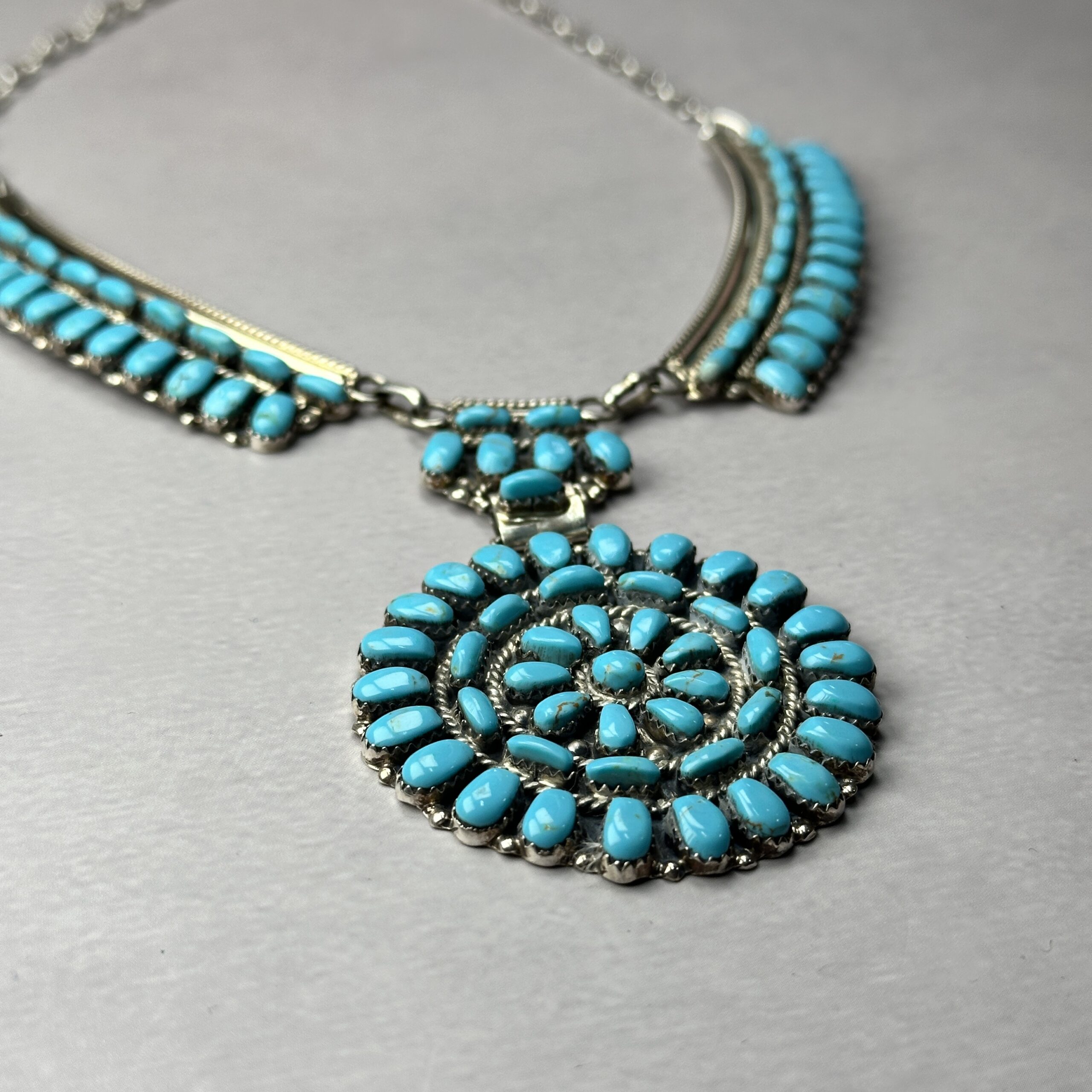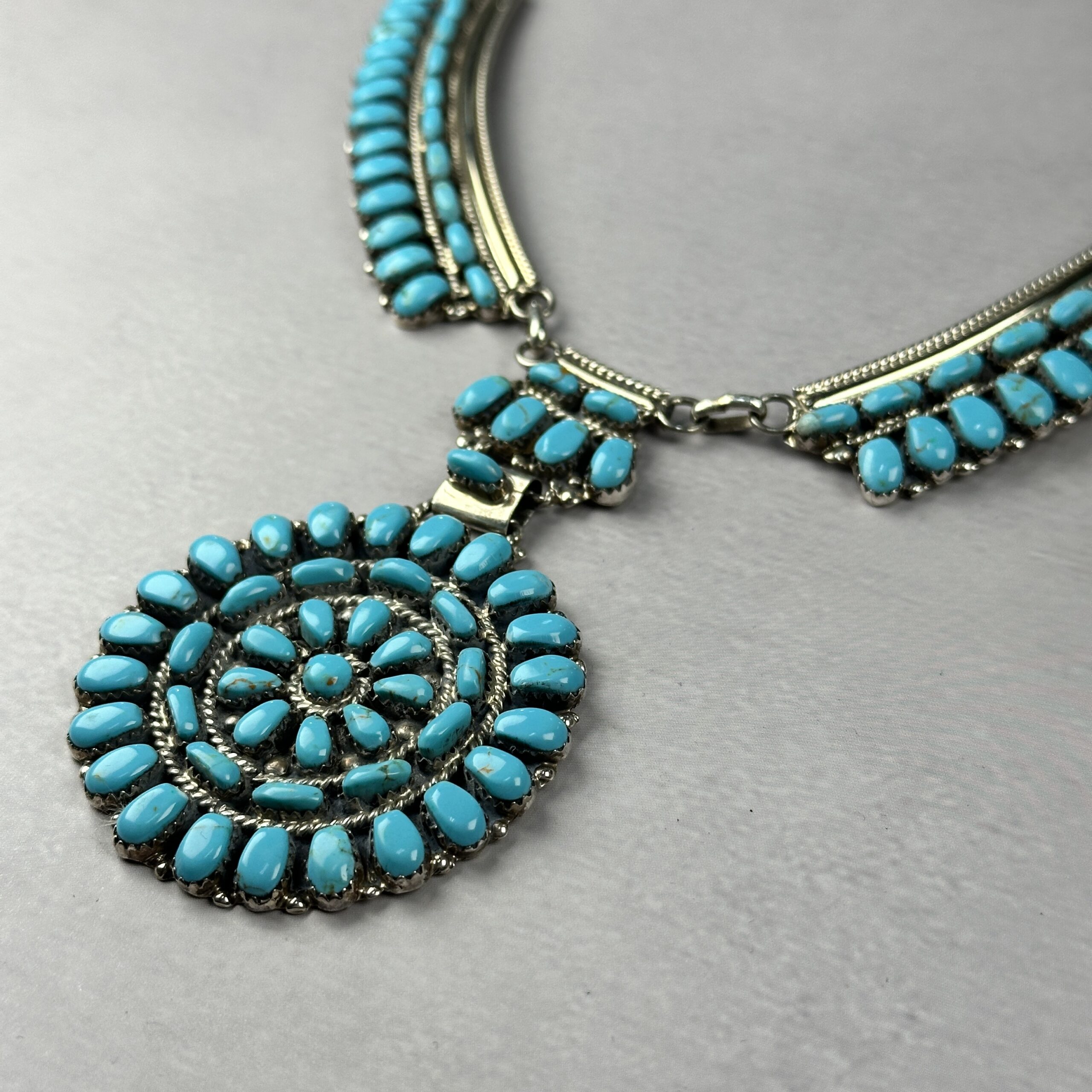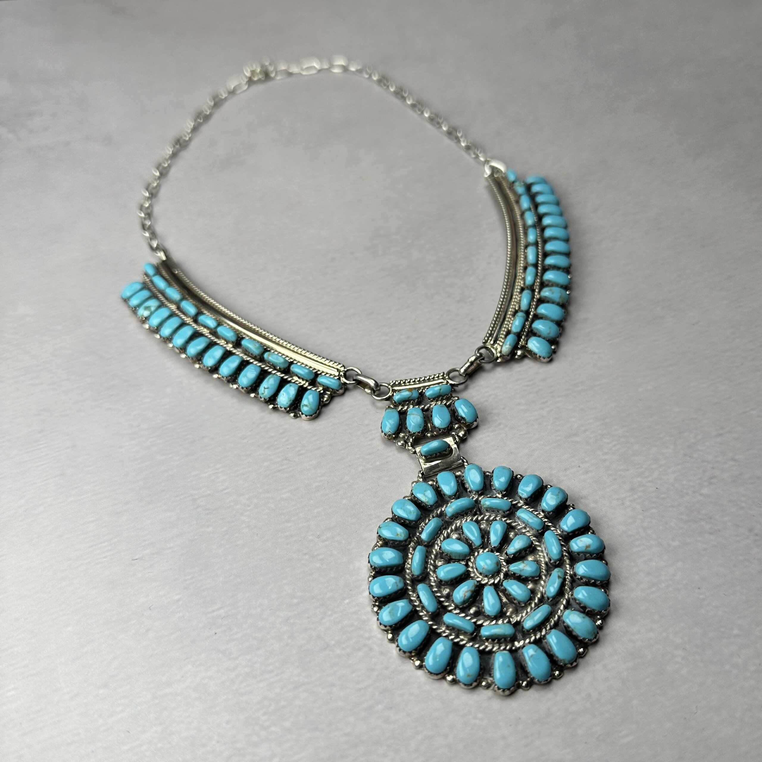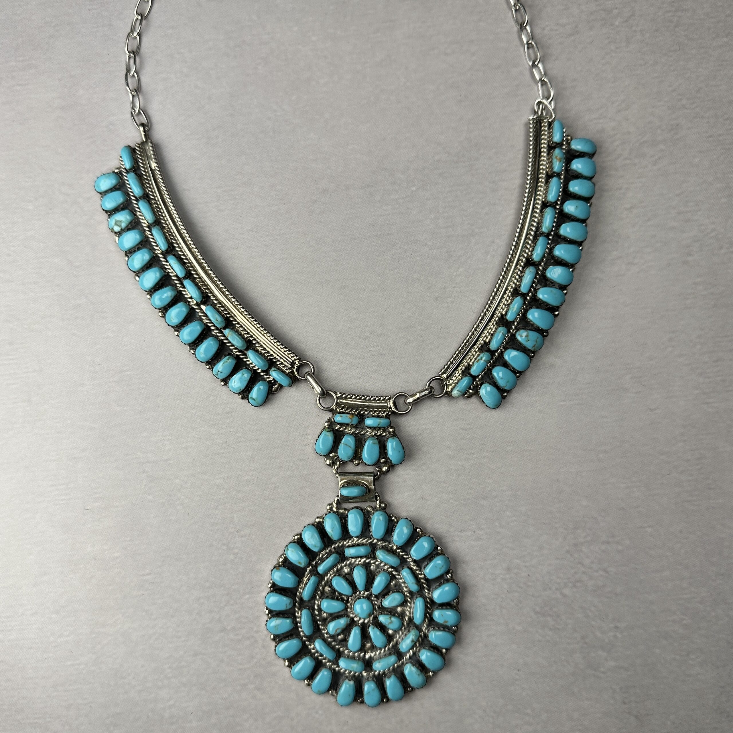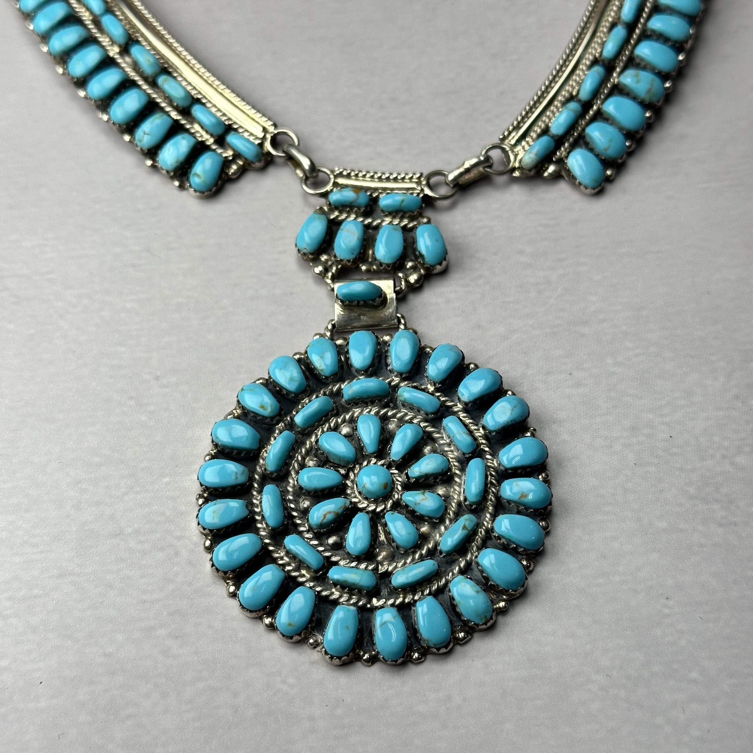 This Zuni-made turquoise cluster necklace showcases precision and symmetry, dozens of hand-cut natural turquoise stones are meticulously set into a large circular cluster pendant, arranged in concentric rows with fine twisted wire and traditional bead accents. The pendant is suspended from a multi-strand silver and turquoise necklace, creating strong visual balance and weight across the chest.