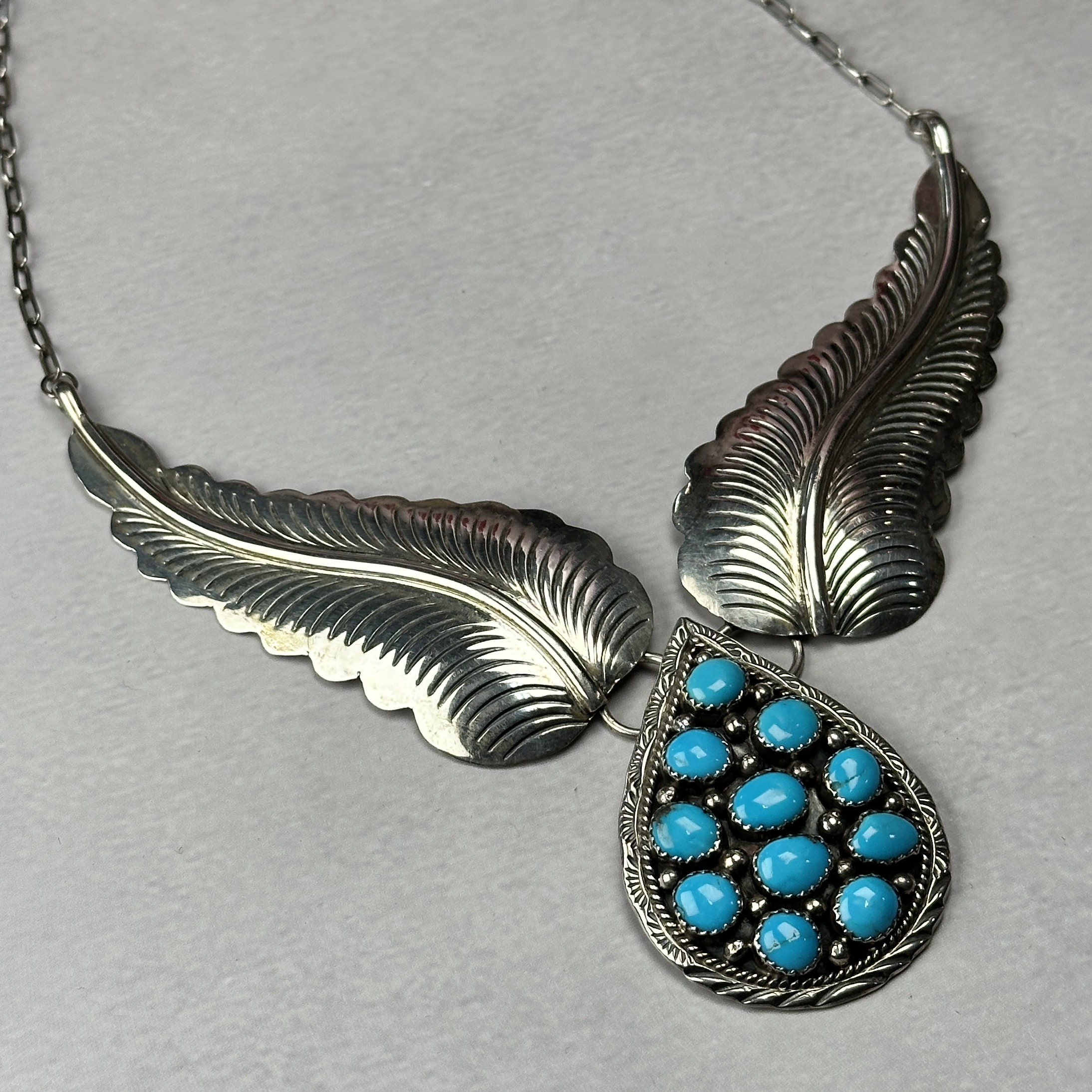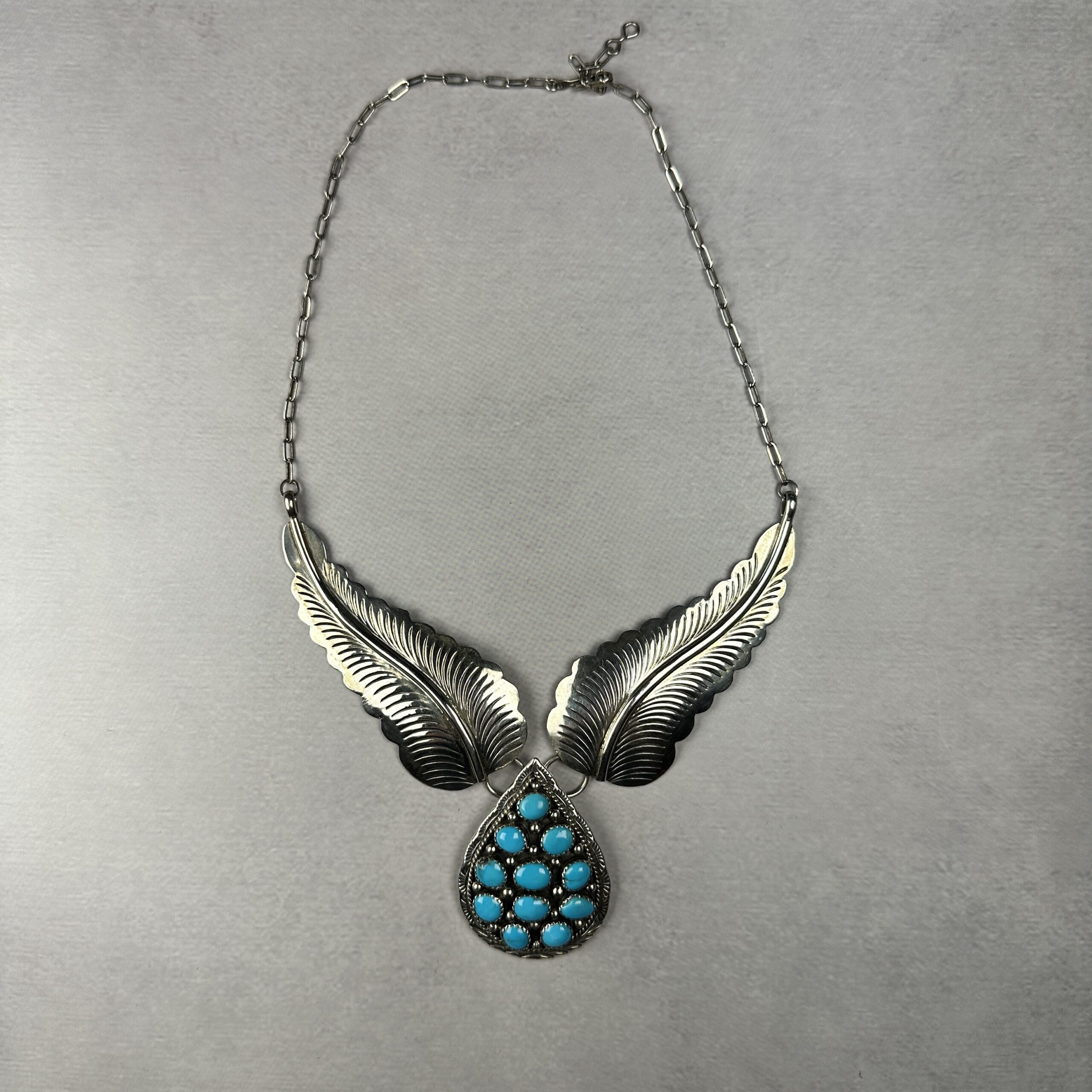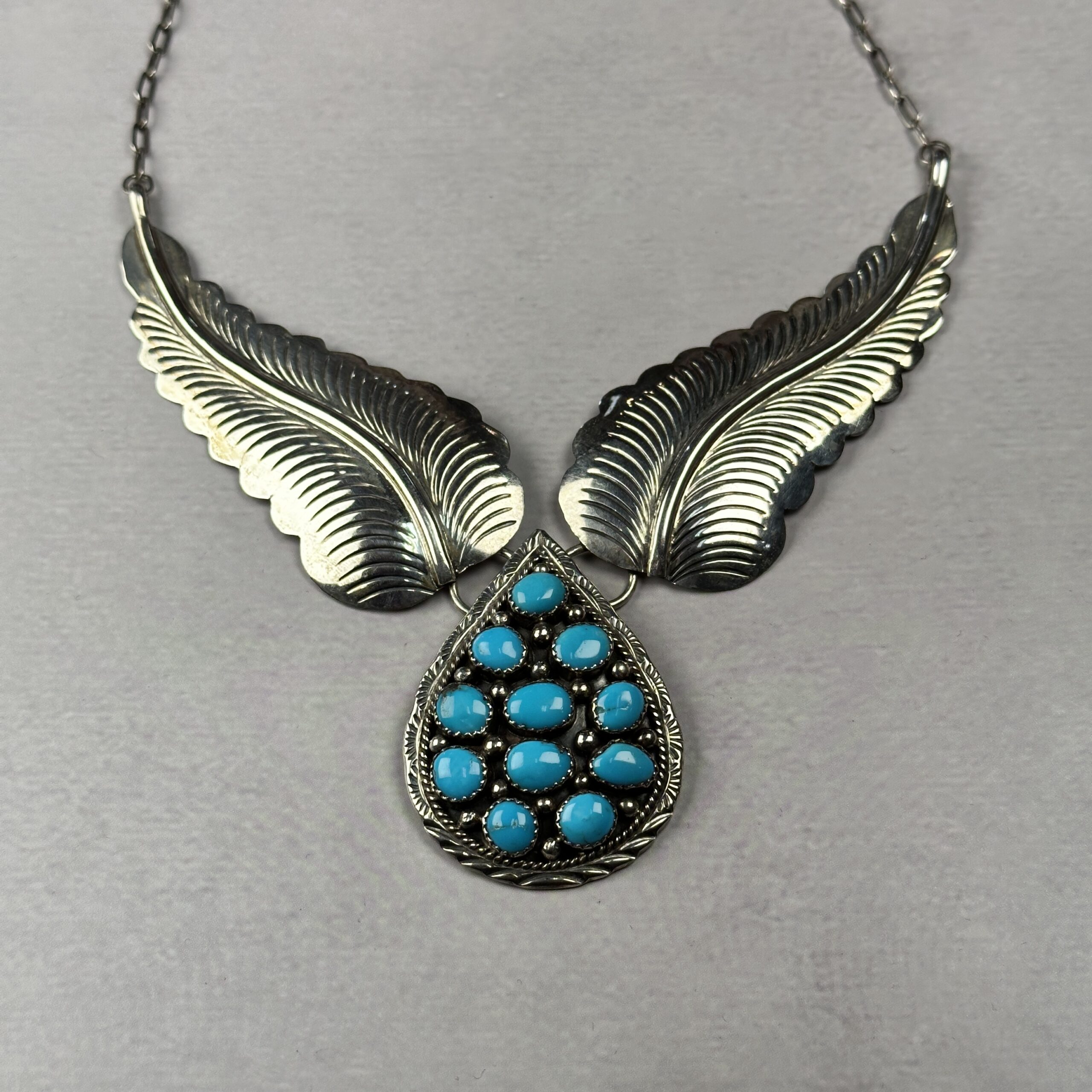 This striking Zuni-made turquoise necklace features hand-cut sterling silver feather elements paired with a meticulously set turquoise cluster pendant. The feathers are deeply stamped and hand-formed, symbolizing protection, balance, and spiritual connection in Native American jewelry traditions.