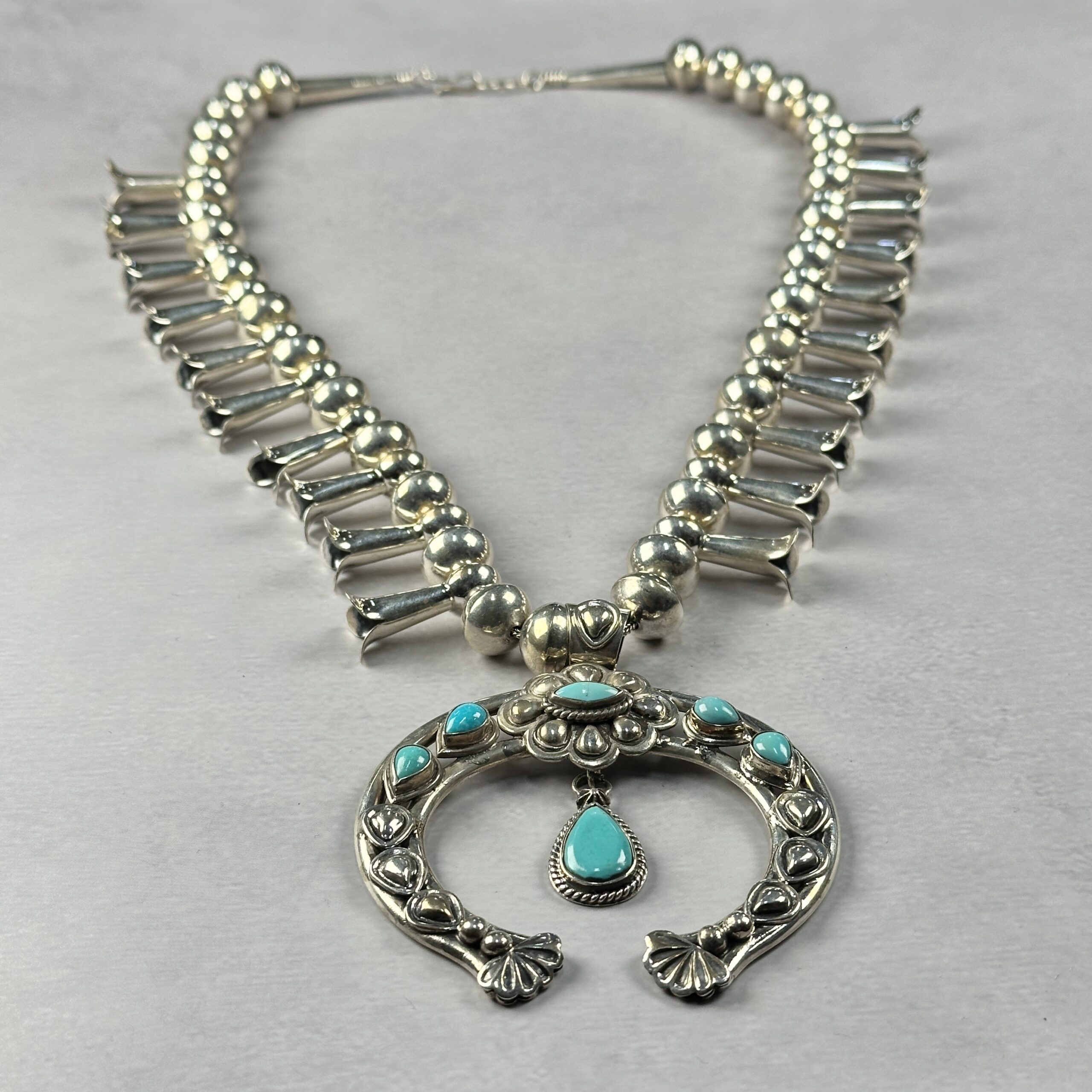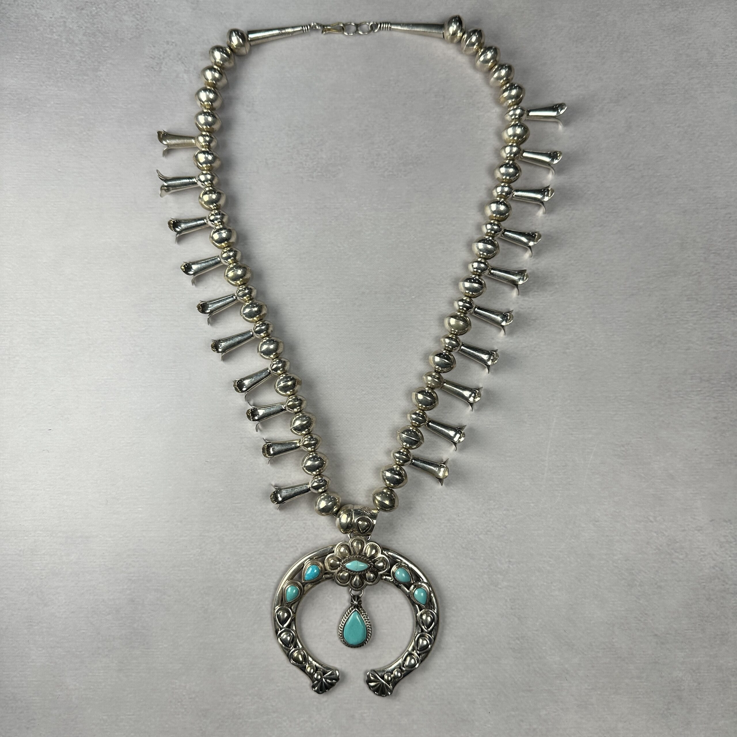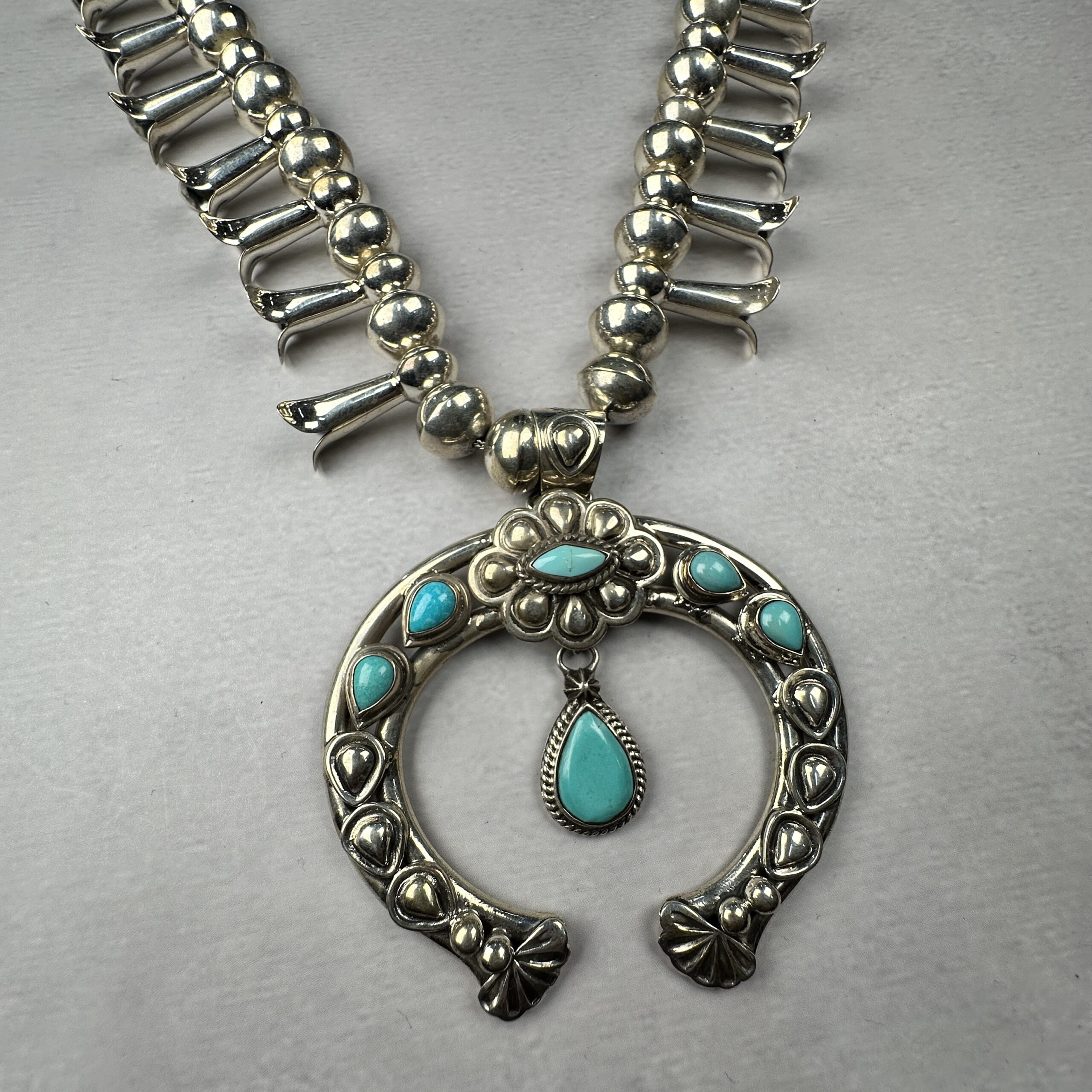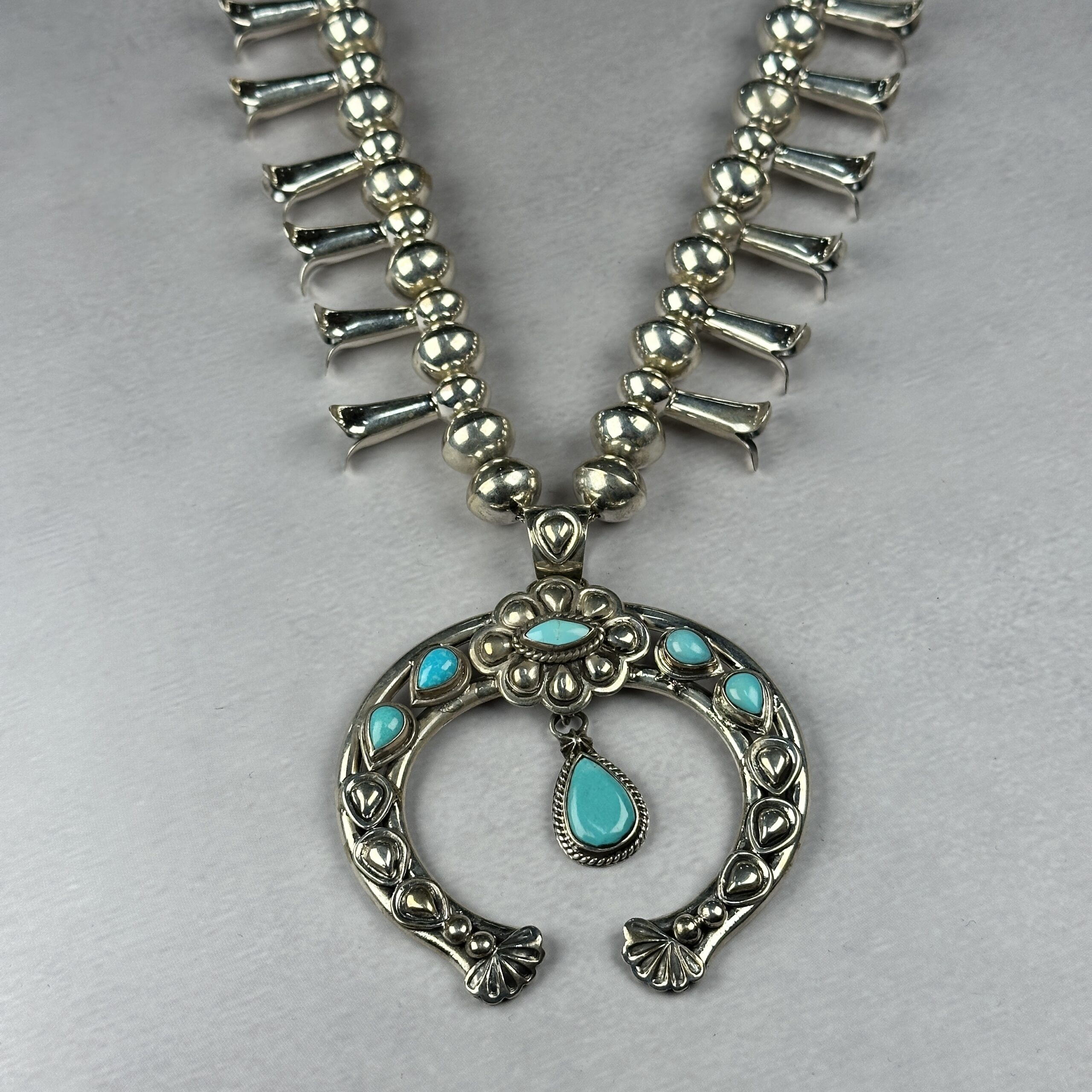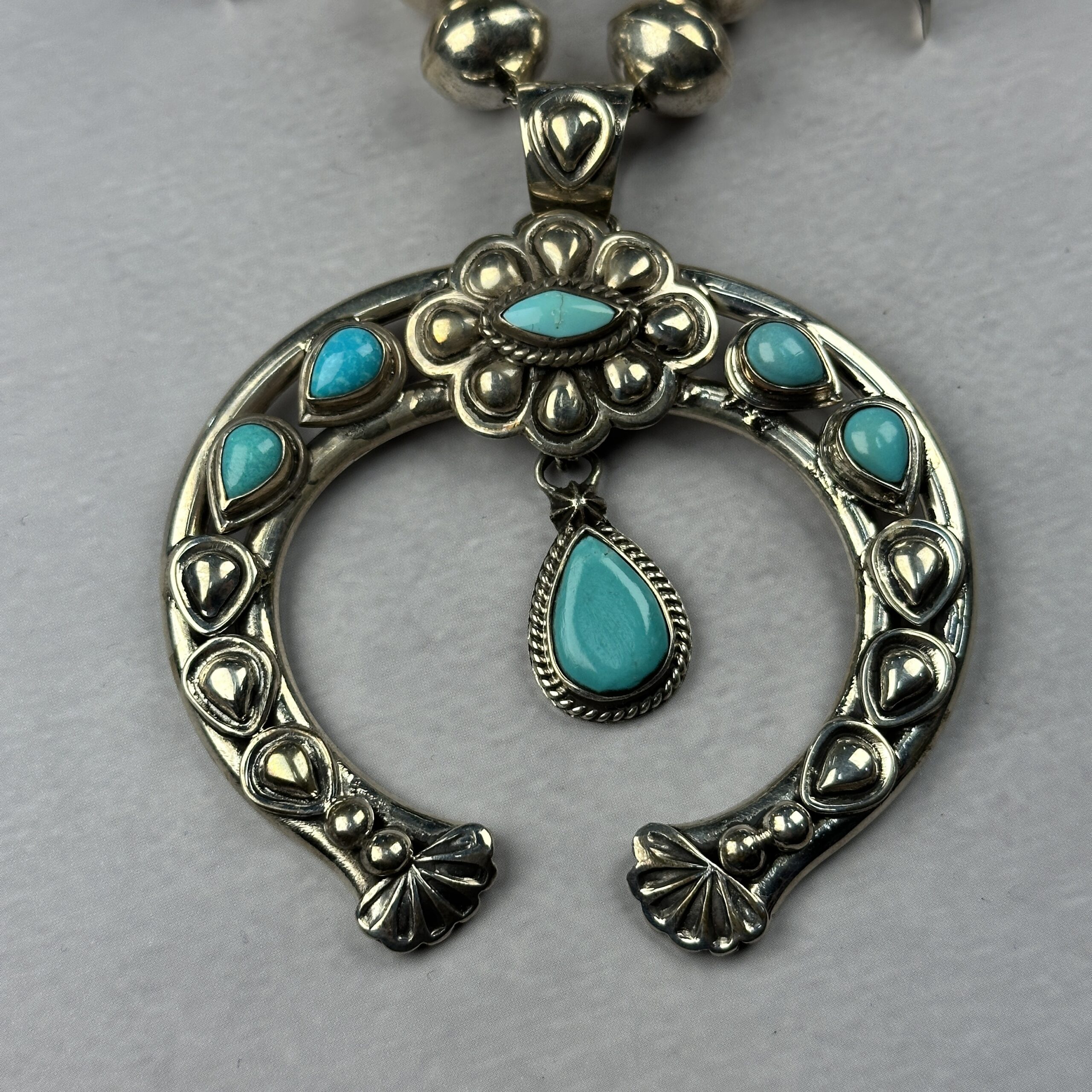 A powerful, traditional Navajo squash blossom necklace handcrafted in sterling silver and set with vibrant natural turquoise. This piece features a classic naja pendant, adorned with hand-cut turquoise cabochons and finished with a suspended teardrop turquoise dangle at the center. The necklace is strung with substantial sterling silver beads and traditional squash blossom elements, giving it weight, movement, and undeniable presence.