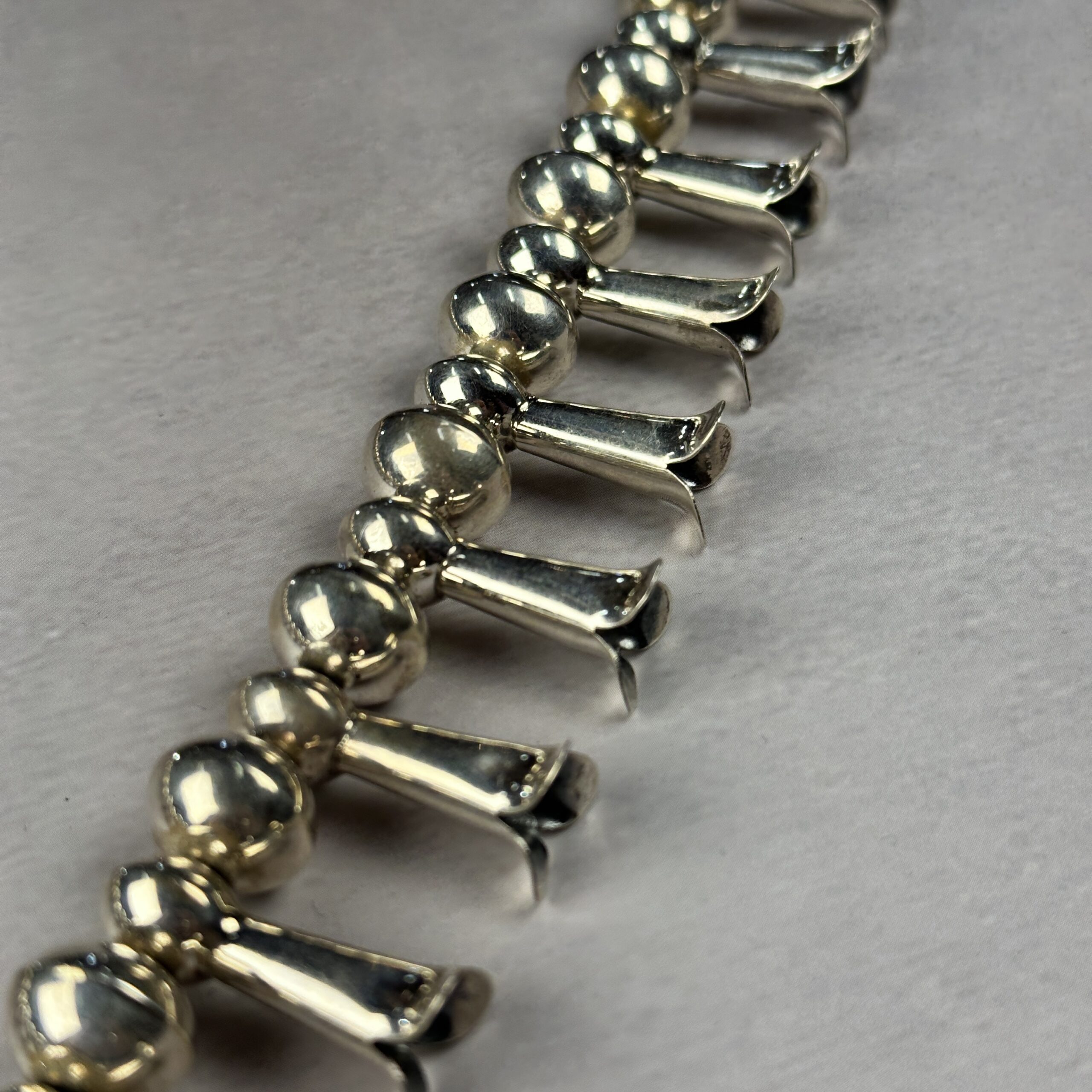 The silverwork shows strong Navajo design language—bold forms, balanced symmetry, and clean hand fabrication throughout. The turquoise stones display rich blue tones with natural character, complementing the depth and shine of the silver. This is a true statement necklace, rooted in tradition and made to be worn as a focal piece, not an accent.