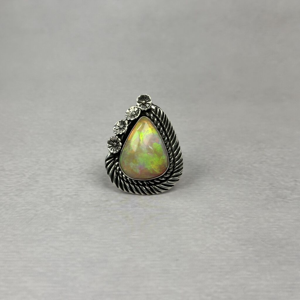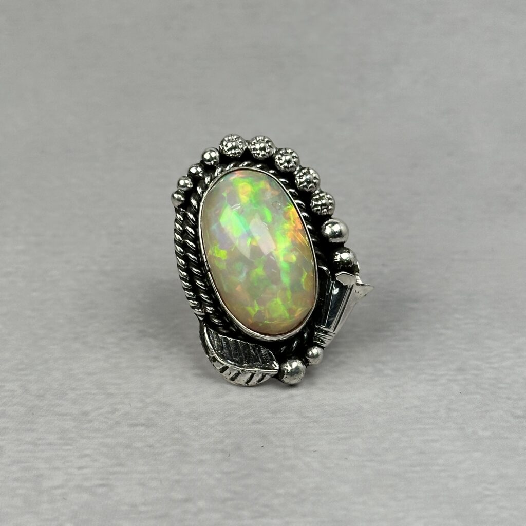Bright Reddish Green 10ctw Ethiopian Opal Ring – Navajo Made-Homer Begay – sz 8 1/2